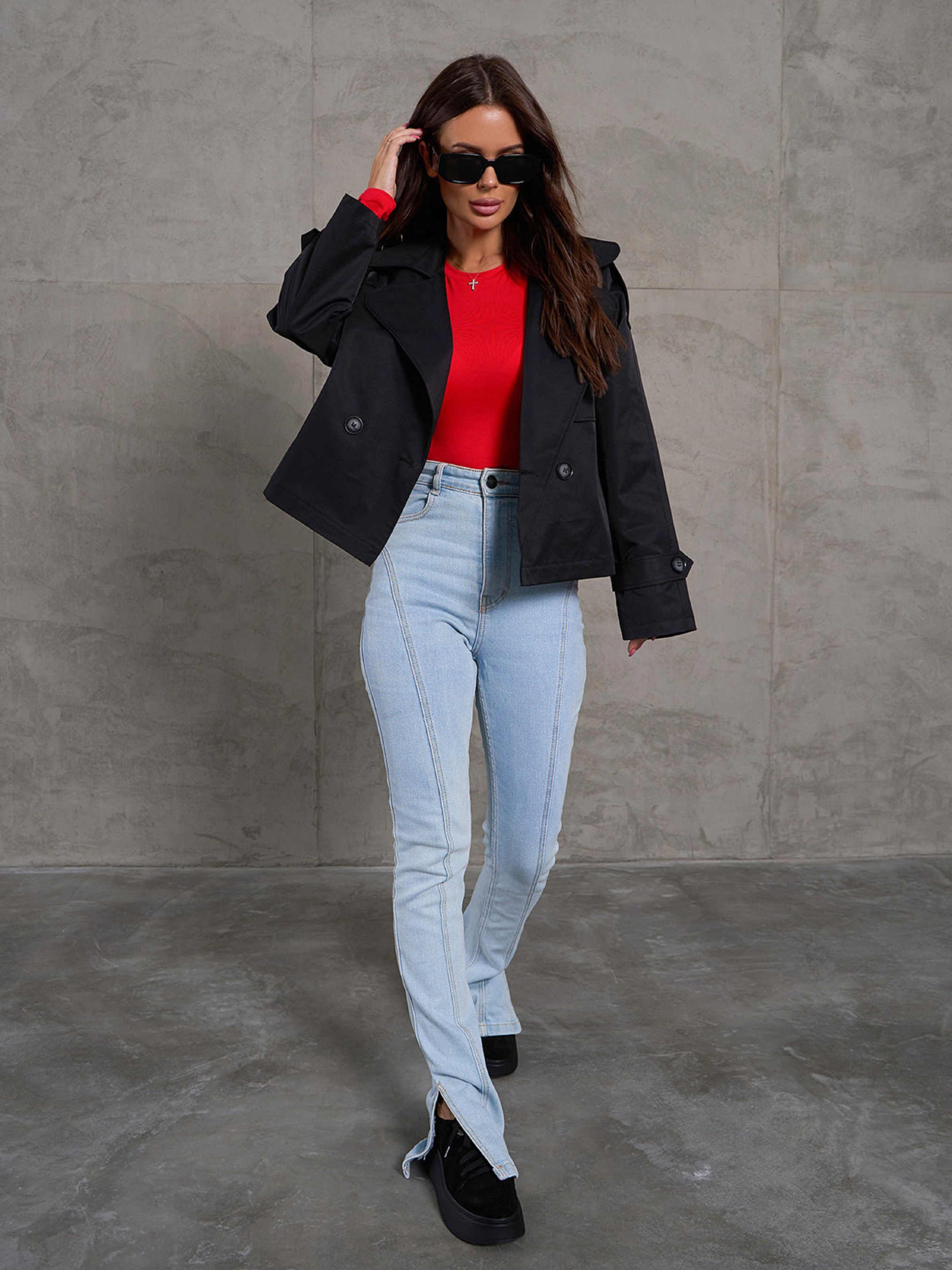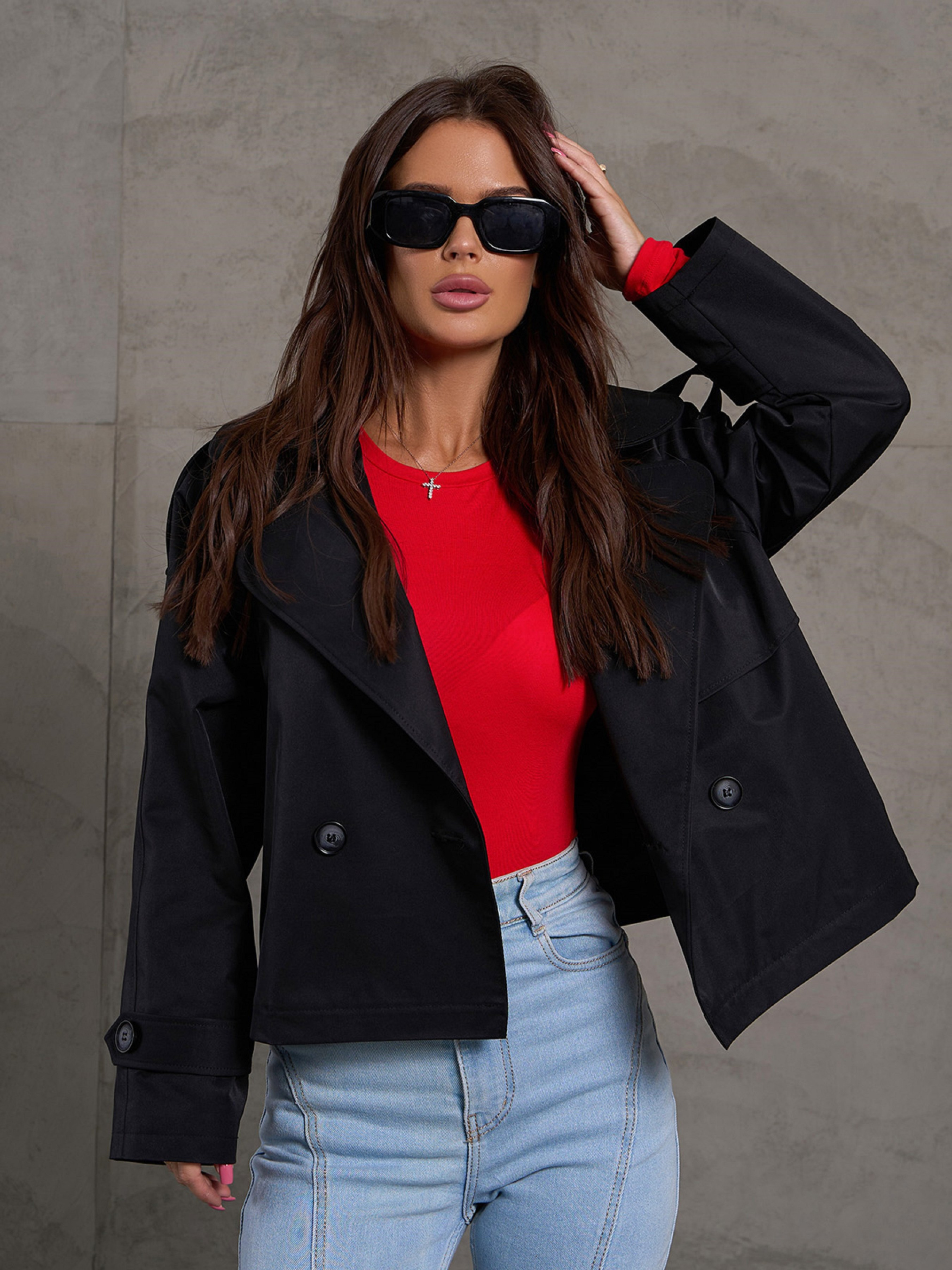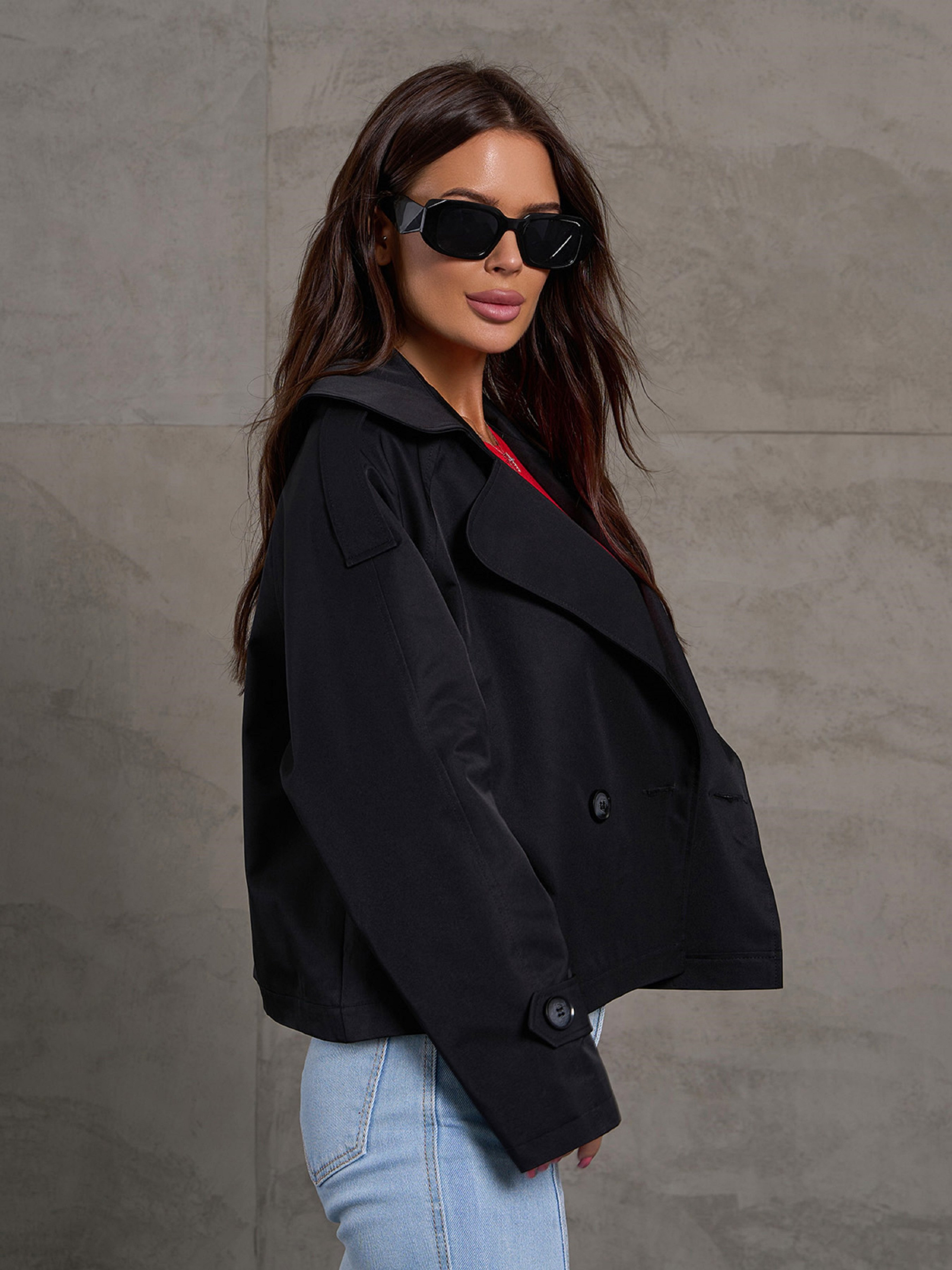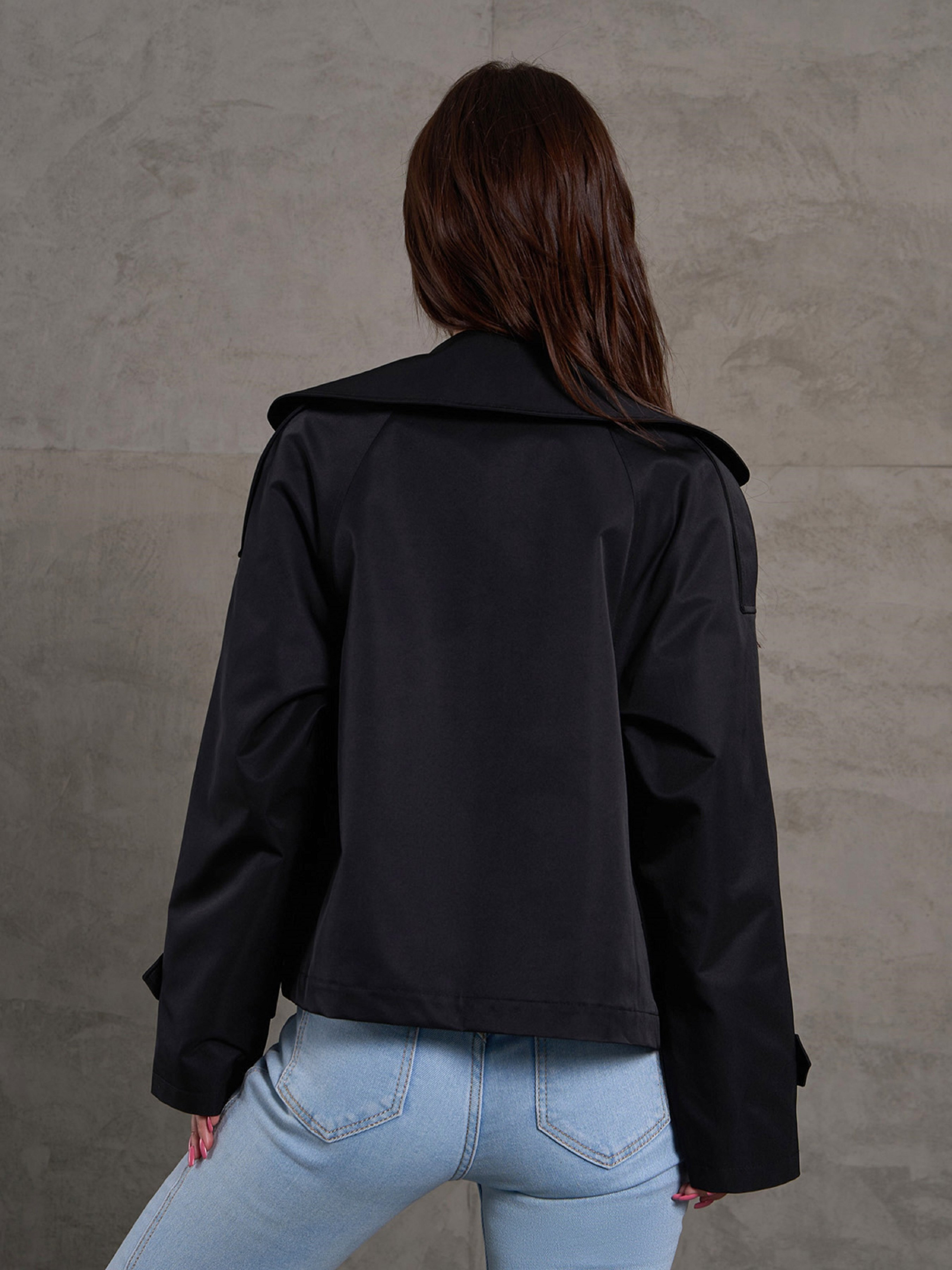 Легкий чорний жакет укороченої довжини, виконаний з полірованого котону з нижньою підкладкою. Модель на ґудзиках із англійським коміром. Жакет прямого вільного крою з довгими рукавами-реглан. Куртка з кишенями та декором у вигляді бічної вставки та хлястиків. Напівобхват: Груди: S(49), M(51), L(53), XL(55), Довжина виробу - 54, Довжина рукава - 53, Тканина: Низька еластичність.