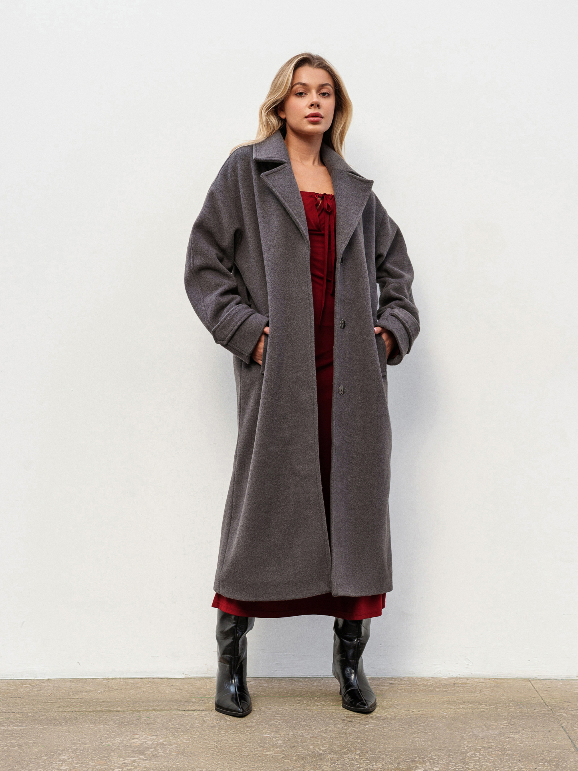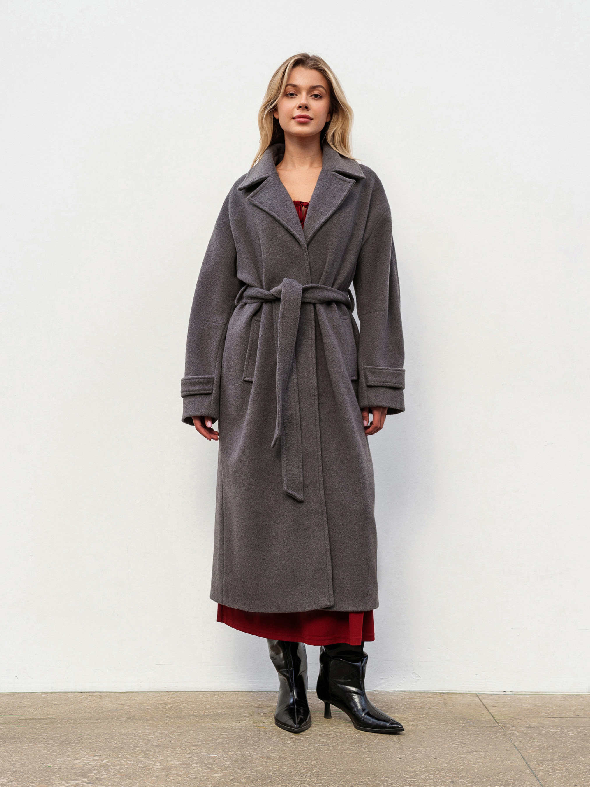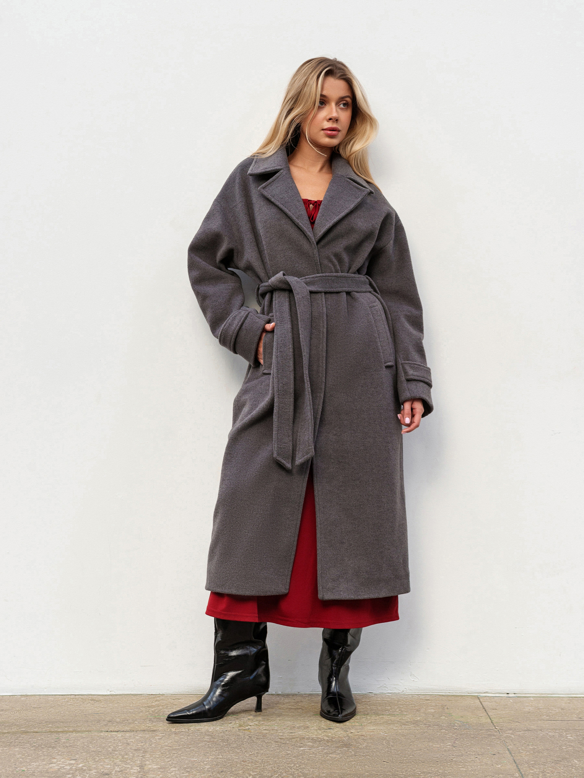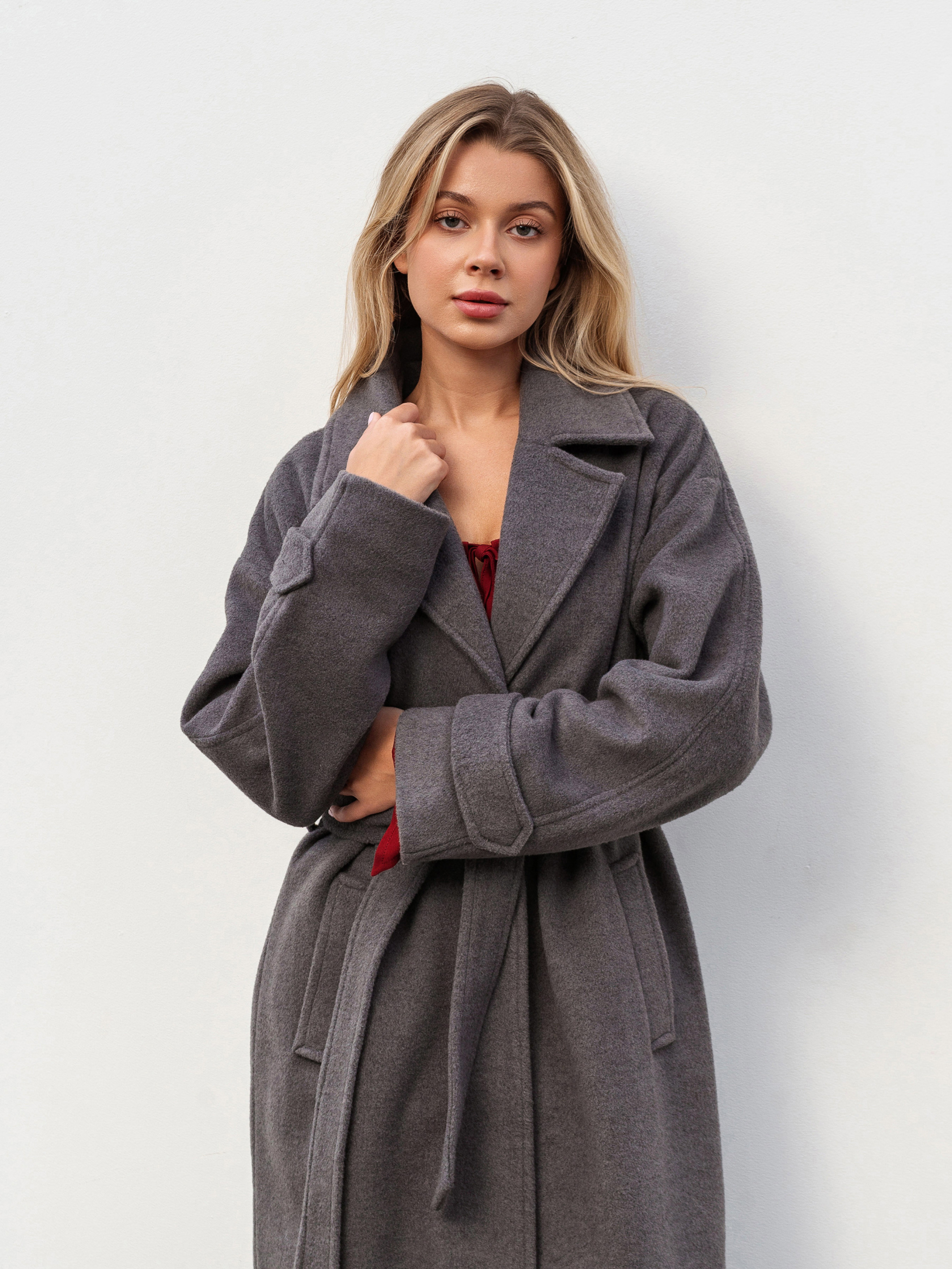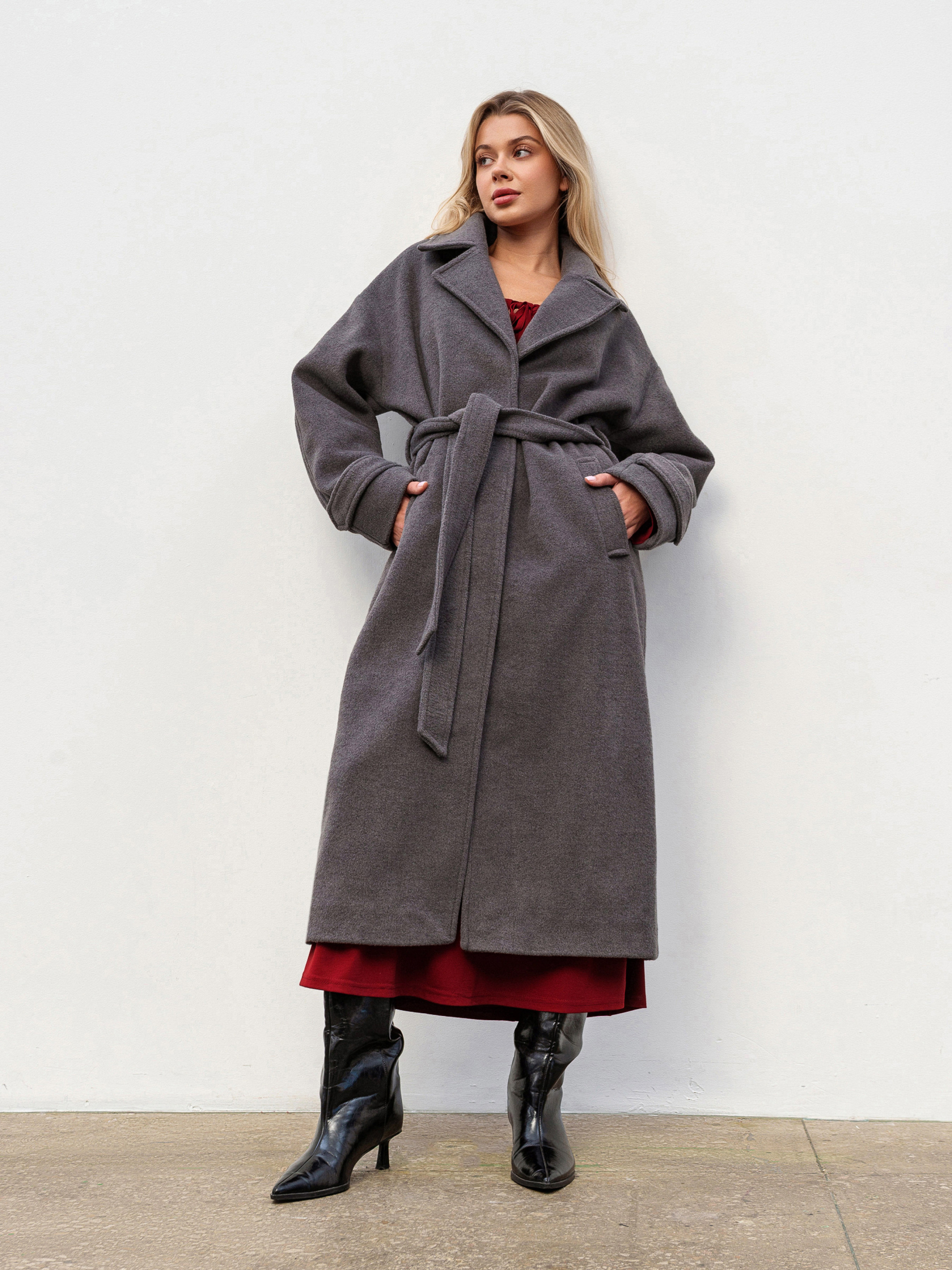 Стильне пальто вільного фасону для комфортних осінніх, зимових та весняних образів. М яке спущене плече додає розслабленого силуету, а пояс дозволяє підкреслити талію за бажанням. Модель застібається на внутрішні кнопки, зберігаючи лаконічний вигляд. Виготовлене з якісної ворсистої пальтової тканини (80% поліестер, 20% район), яка не катається та тримає форму. Усередині підкладка для додаткового комфорту. Доступні кольори: сірий, коричневий. ХС-С Довжина по спині : 115 см Довжина рукава : 53 см Напівобхват грудей : 54 см Плечі : 55 см Напівобхват талії : 53 см С-М Довжина по спині : 117 см Довжина рукава : 53 см Напівобхват грудей : 57 см Плечі : 58 см Напівобхват талії : 54 см