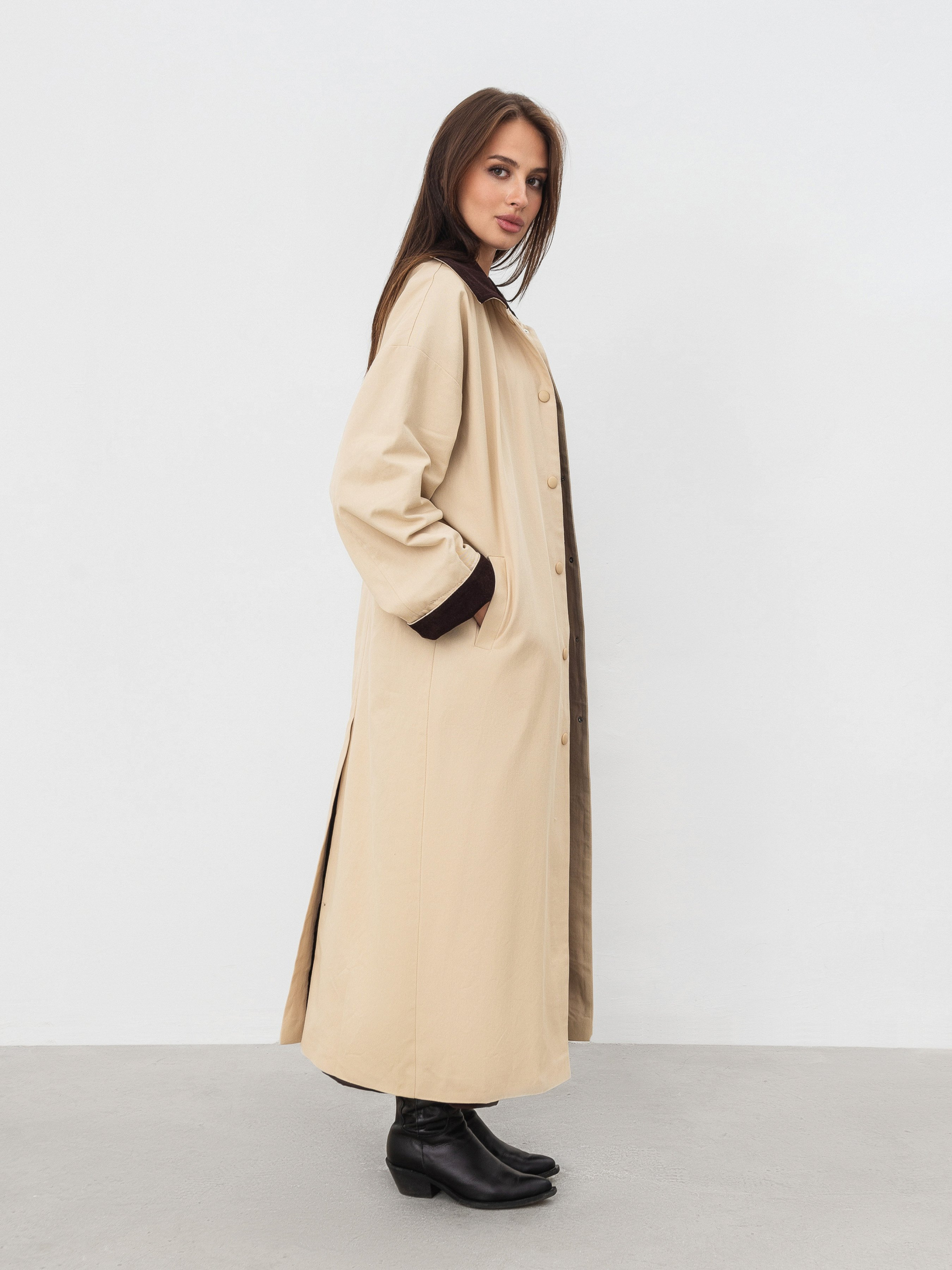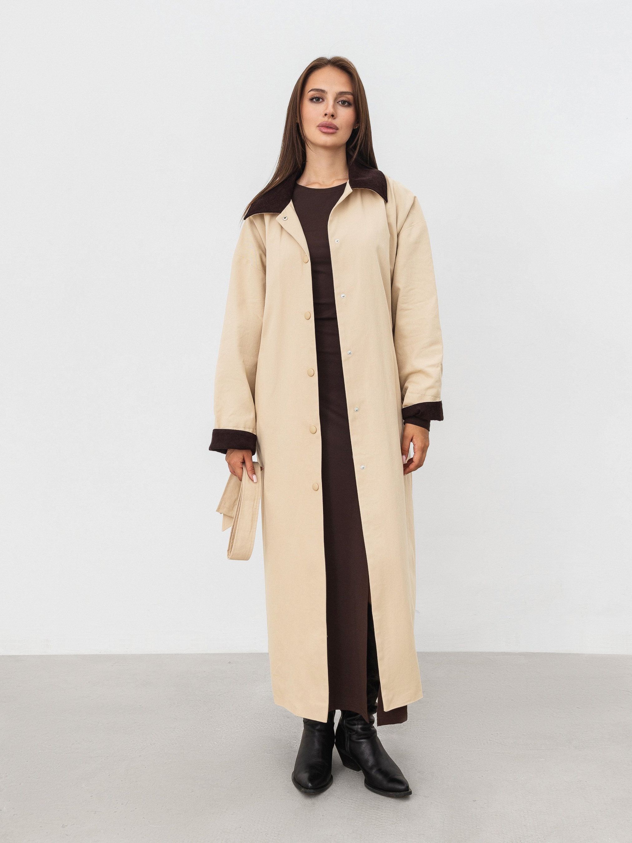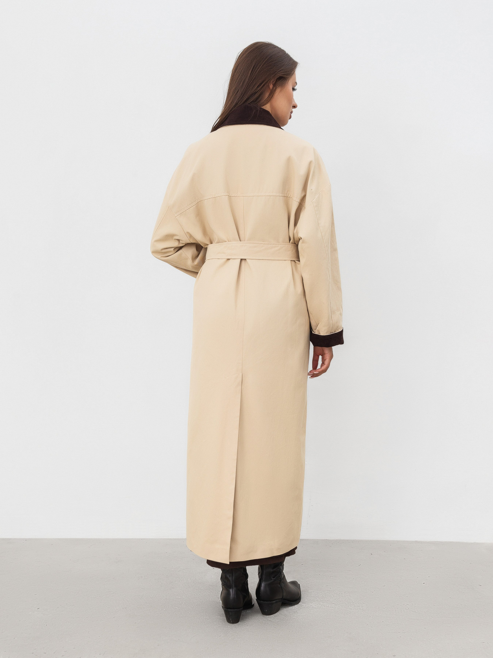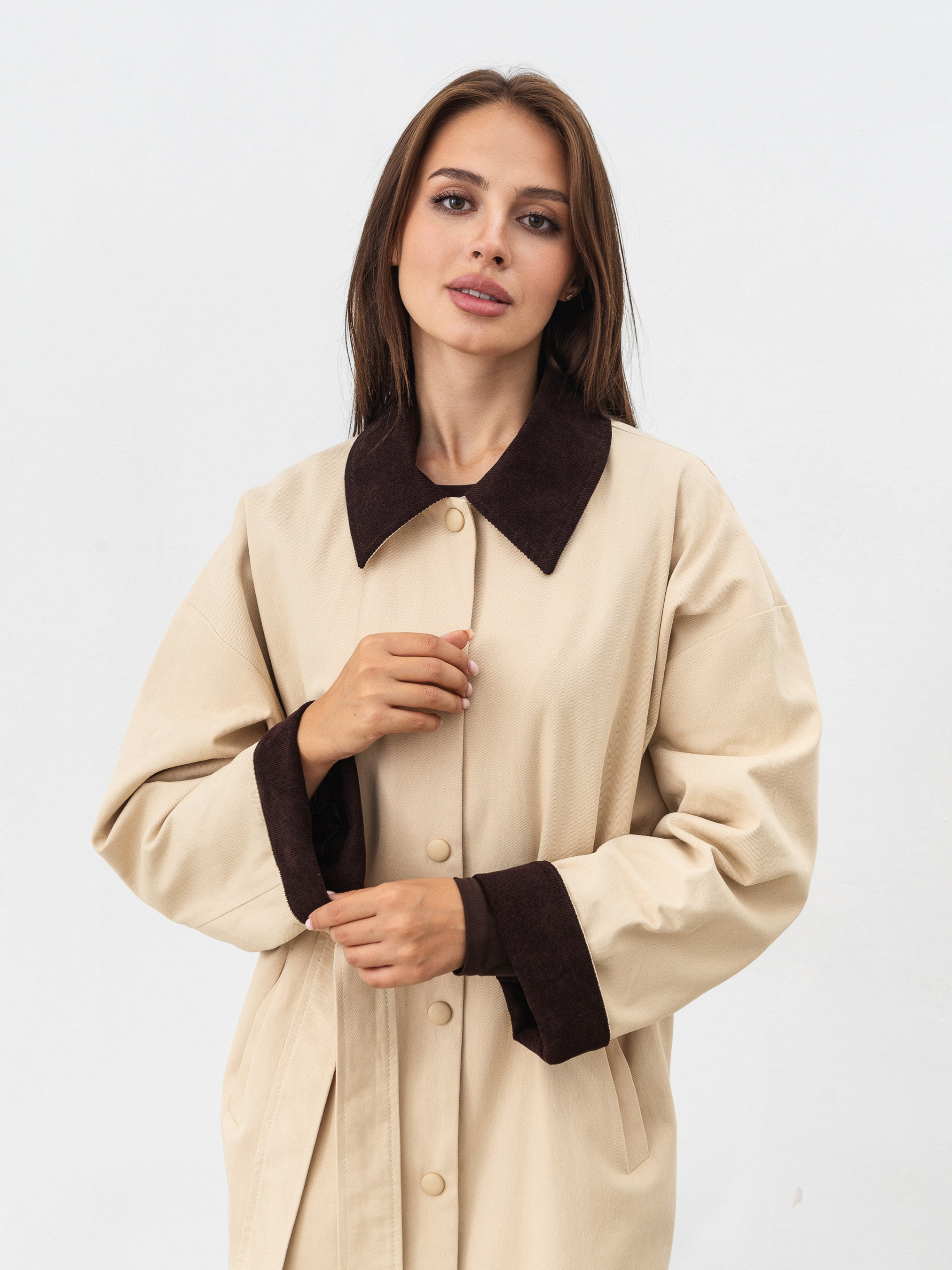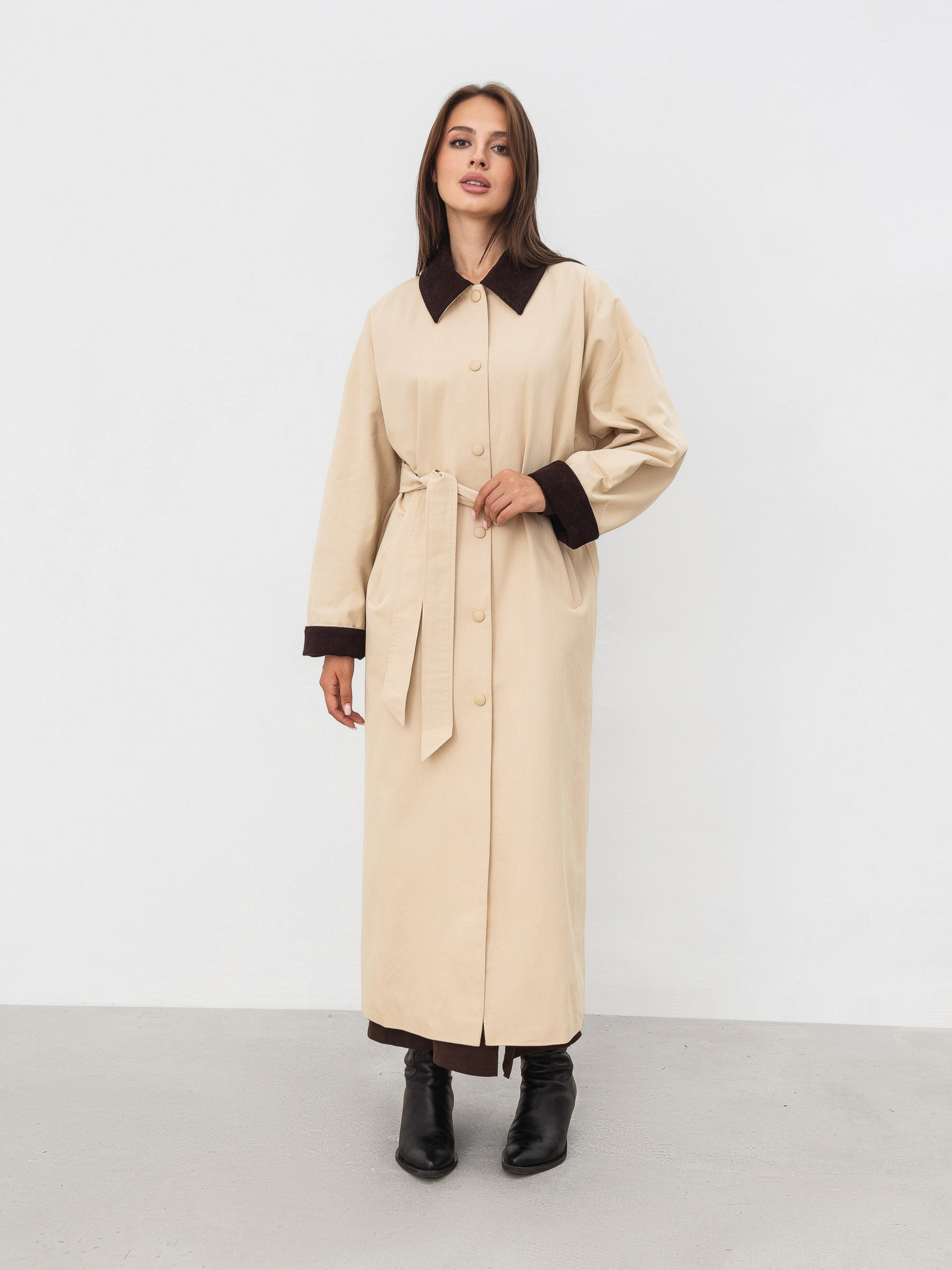 Трендовий тренч на прохолодний сезон. Модель прямого силуету з кишенями спереду. Має текстильну підкладку. Низ рукава й комірець мають акцентну вельветову вставку. У комплекті йде ремінець, яким можна підкреслити талію. Виготовлений зі 100% бавовни. Універсальна модель пальто на прохолодний сезон (середина осені-весни). Поєднувати можна як з базовими кросівками, так і черевиками. Доповнити можна сумочкою та аксесуарами на шию/голову.