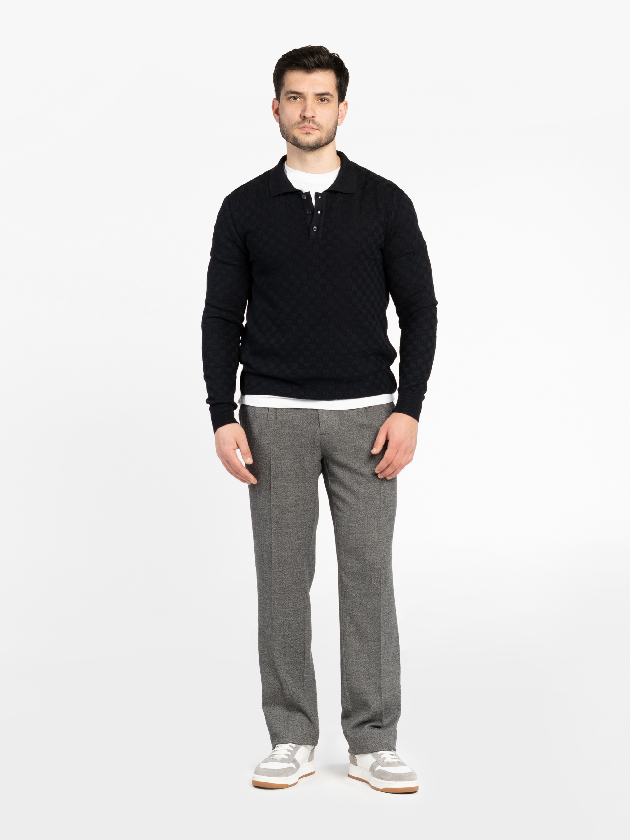 Чоловічі брюки Arber темно-синього кольору у клітину, виготовлені з інноваційної тканини з додаванням шовковистої віскози, що забезпечує комфорт і практичність. Вони не мнуться й зберігають бездоганний вигляд протягом дня. Модель має середню посадку, оформлена стрілками, пояс на гумці із застібкою на блискавку та ґудзик для зручності. Оснащені двома косими боковими кишенями та двома задніми кишенями. Ідеально поєднуються з піджаком M02.24.09.511 із тієї ж тканини. Модель на фото: розмір 50, зріст 180 см, параметри 103/85/97.