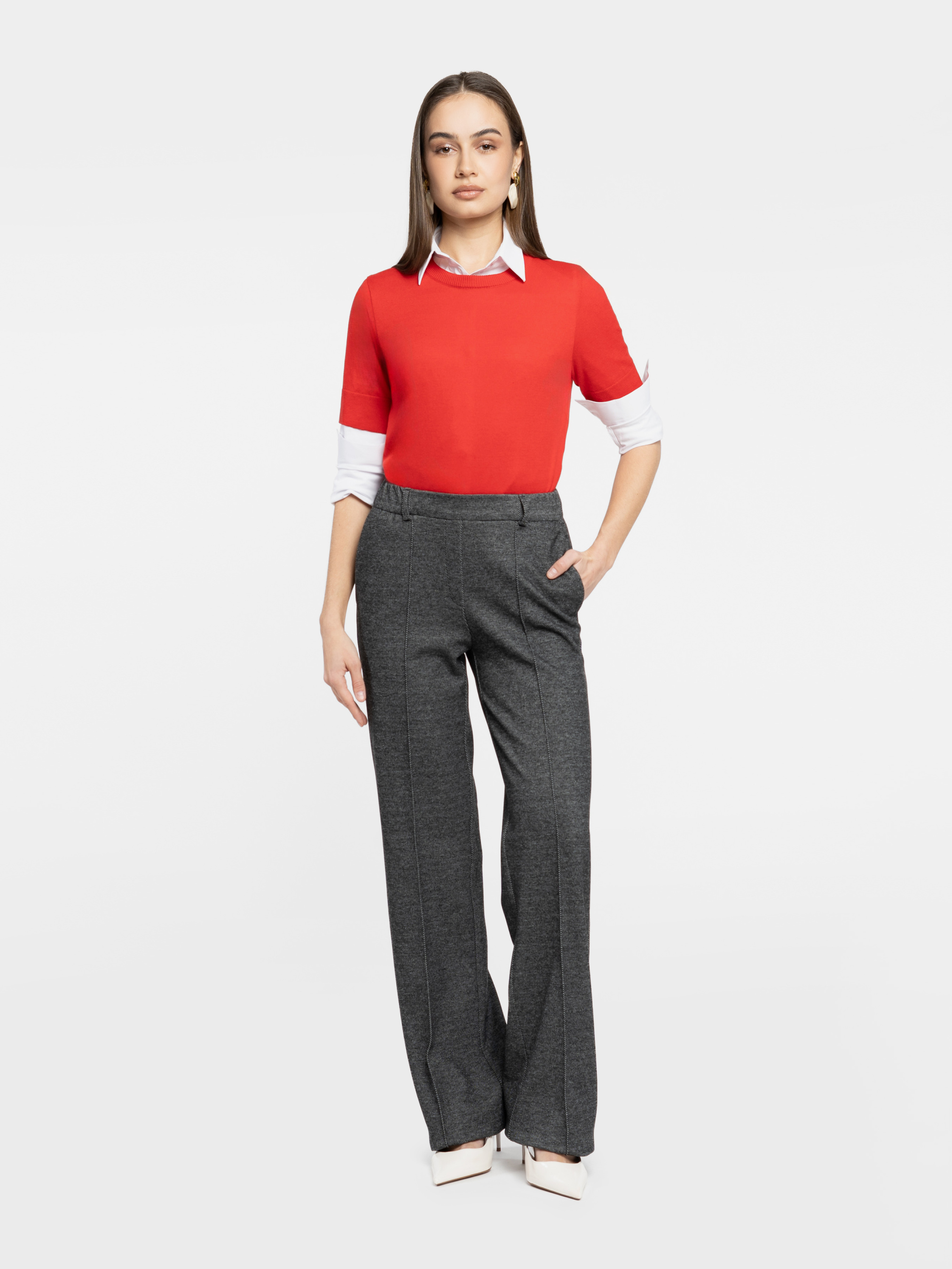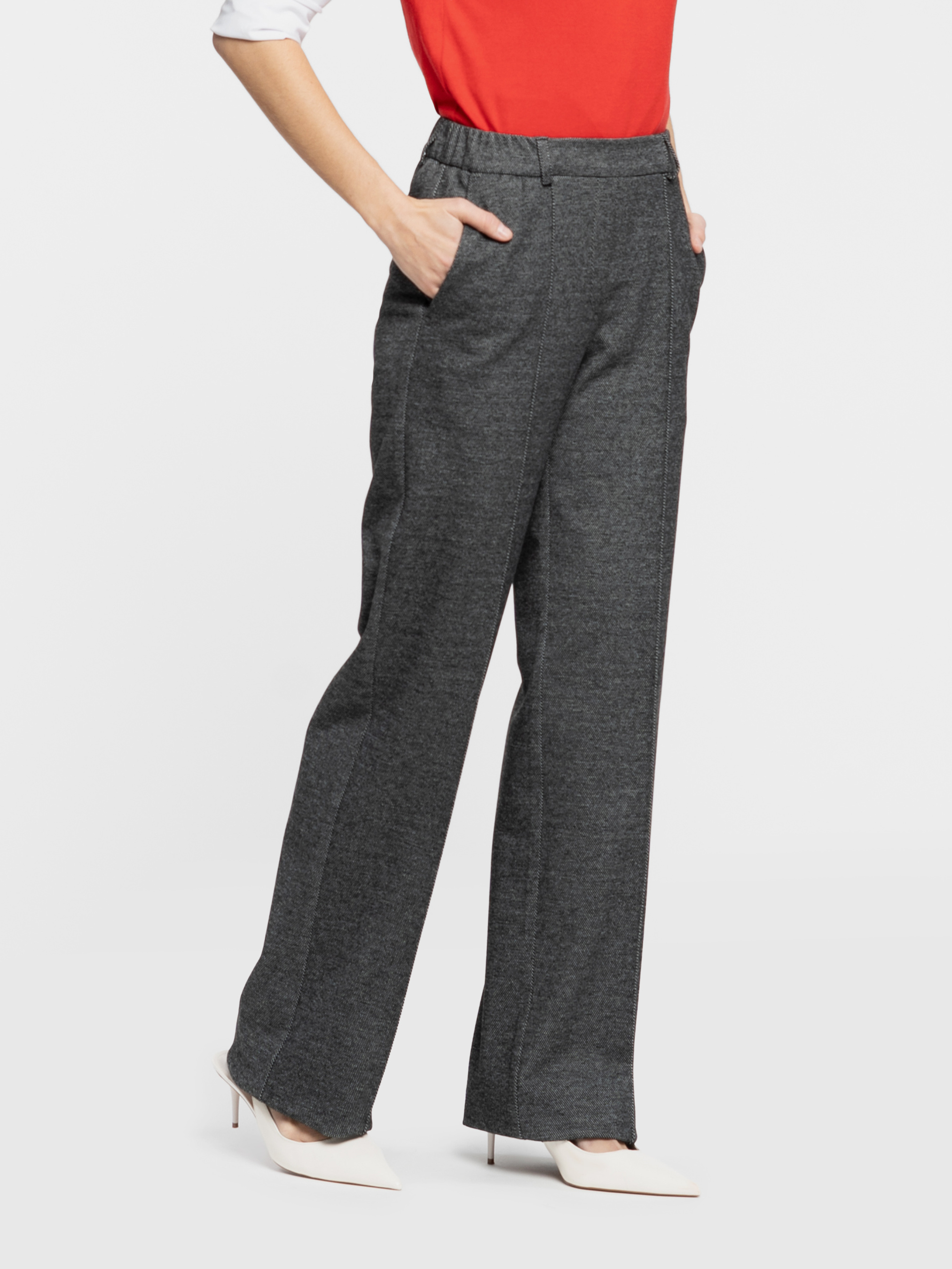 Жіночі трикотажні брюки Arber темно-сірого кольору виконані з м’якої еластичної тканини з додаванням віскози. Матеріал приємний на дотик, добре тягнеться, тримає форму та ідеально сідає по фігурі. Модель має середню посадку, вільний крій, зручний пояс на гумці ззаду та дві похилі кишені. Брюки легко комбінуються з жакетами, сорочками або трикотажем — універсальний варіант для образів у стилі smart casual. Модель на фото у розмірі 44 . Зріст: 168 см. Параметри: 79/60/88