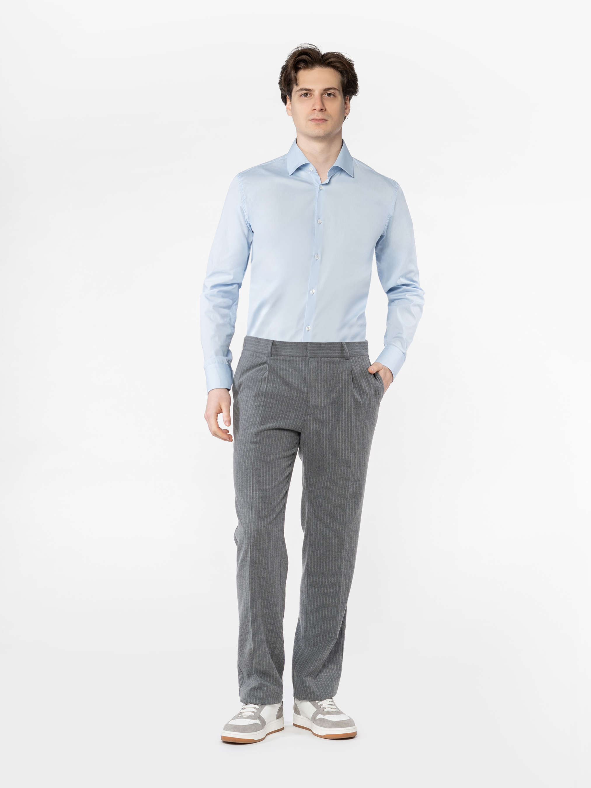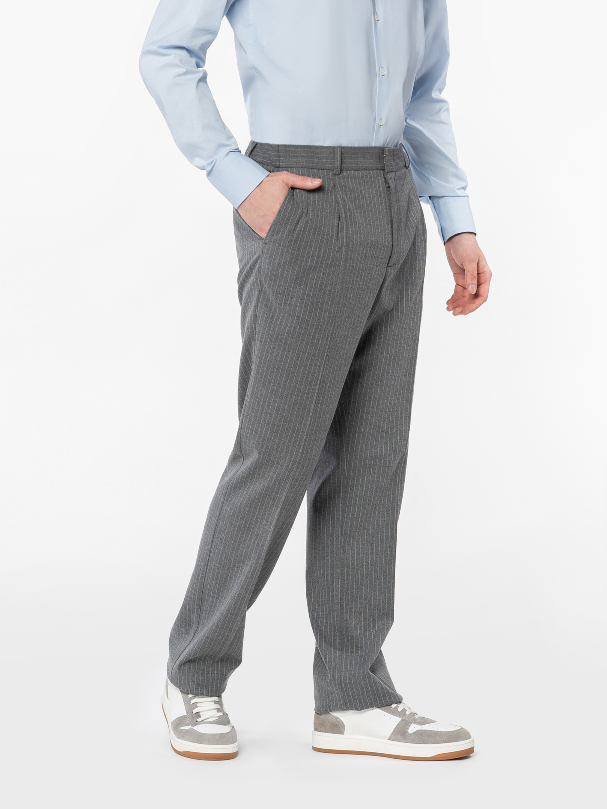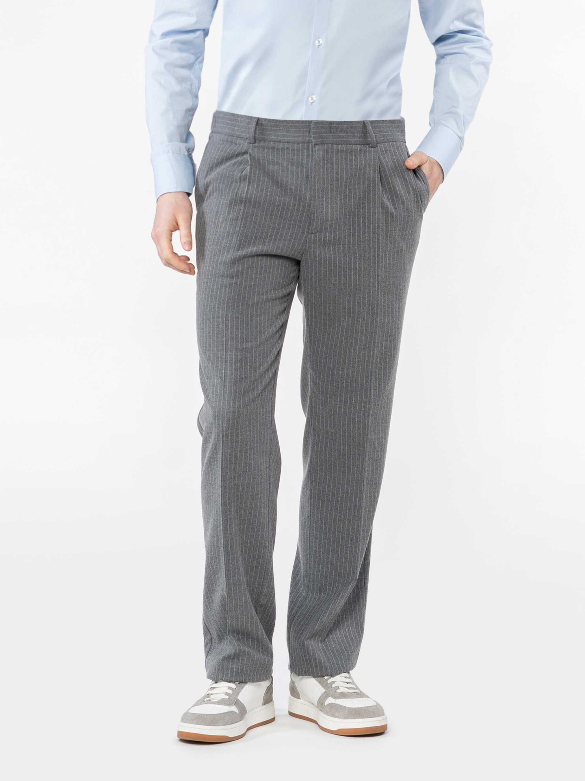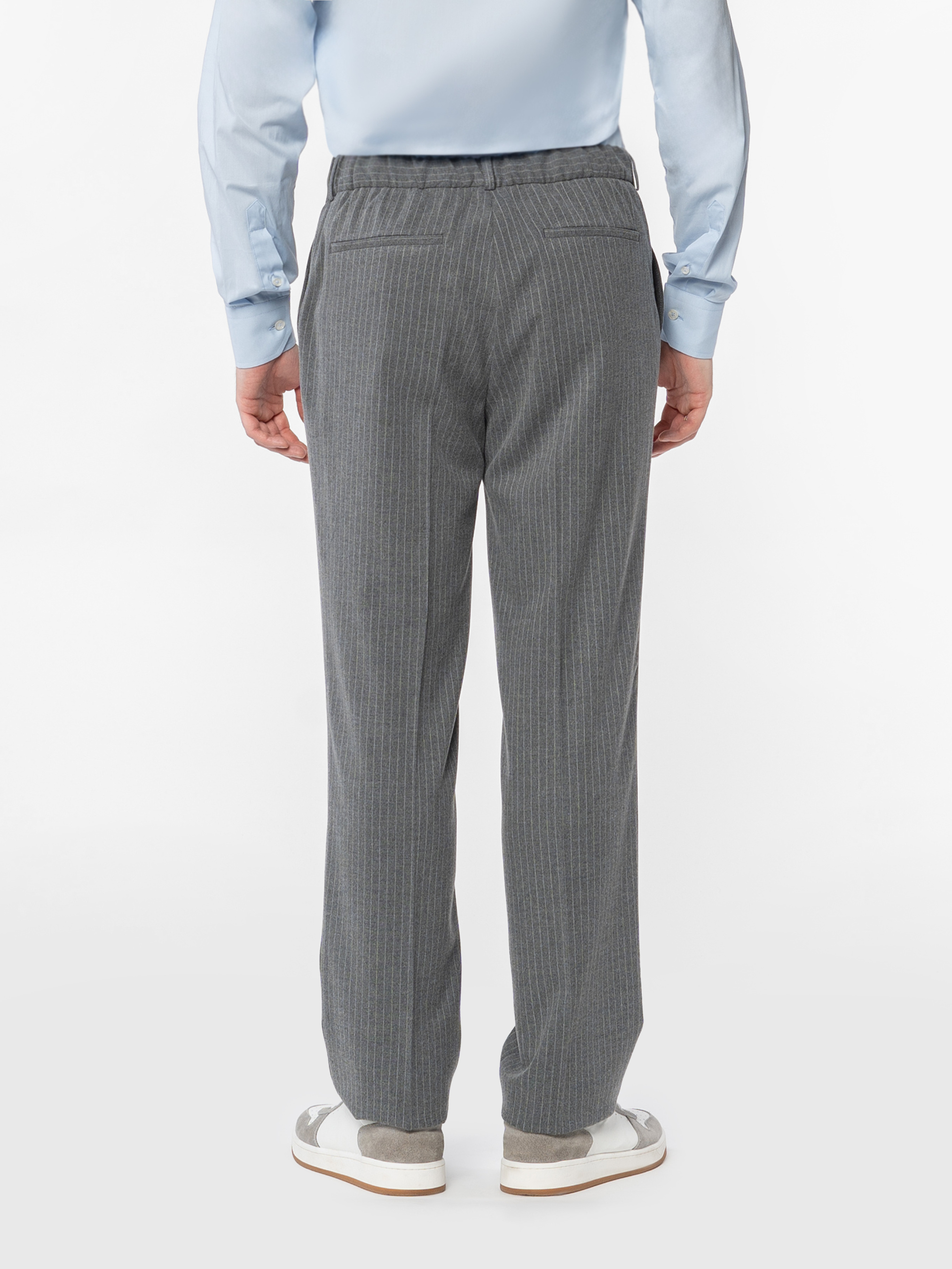 Чоловічі брюки Arber сірого кольору у смужку, виготовлені з елаатичної тканини з додаванням шовковистої віскози, що забезпечує комфорт і практичність. Вони не мнуться й зберігають бездоганний вигляд протягом дня. Модель має середню посадку, оформлена стрілками, пояс на гумці із застібкою на блискавку та ґудзик для зручності. Оснащені двома косими боковими кишенями та двома задніми кишенями. Модель на фото у розмірі 48. Зріст: 185 см. Параметри: 103/78/100
