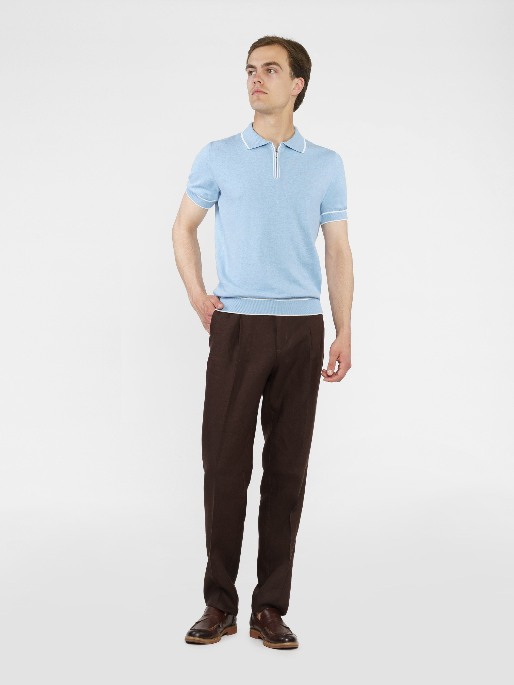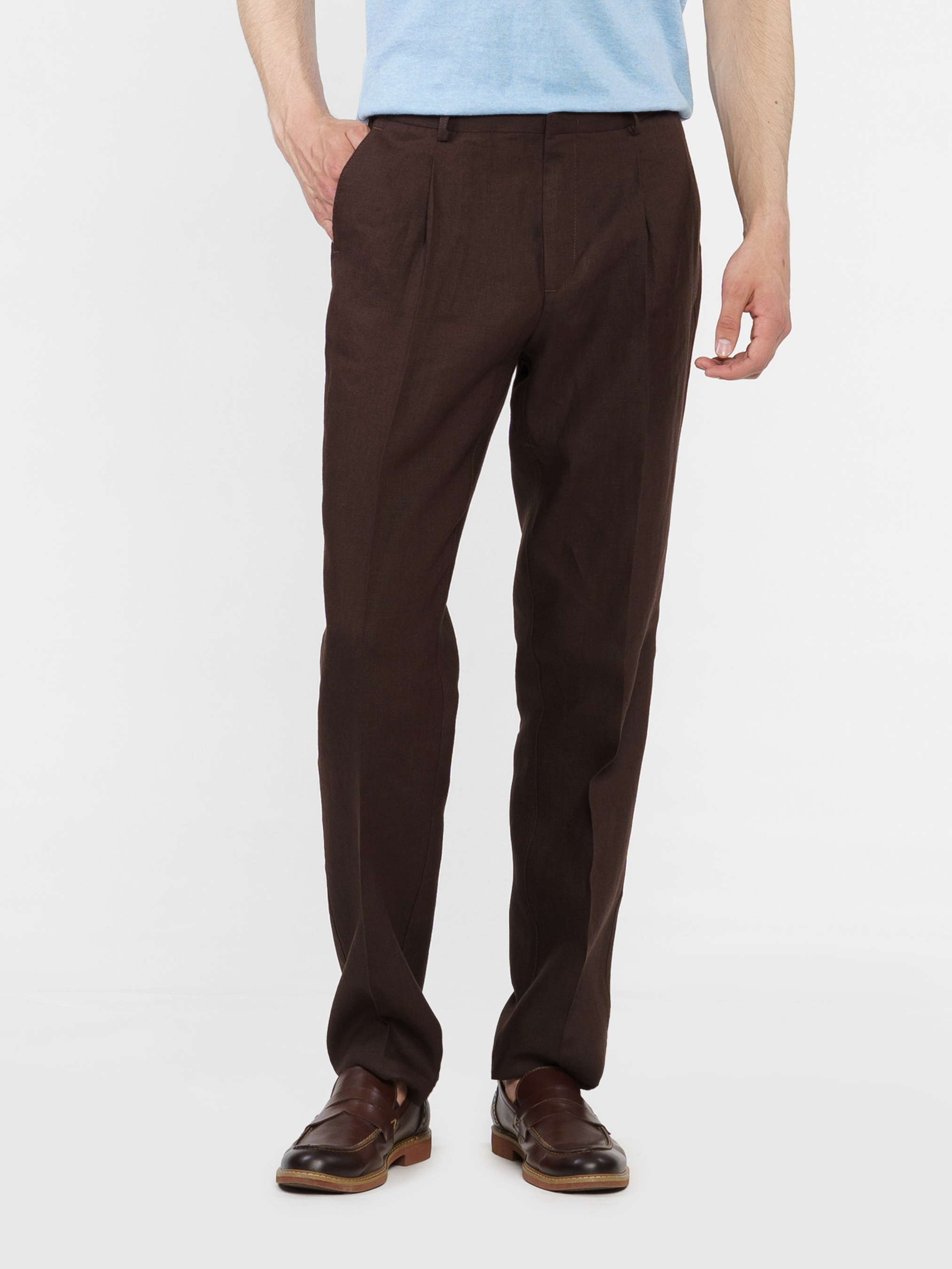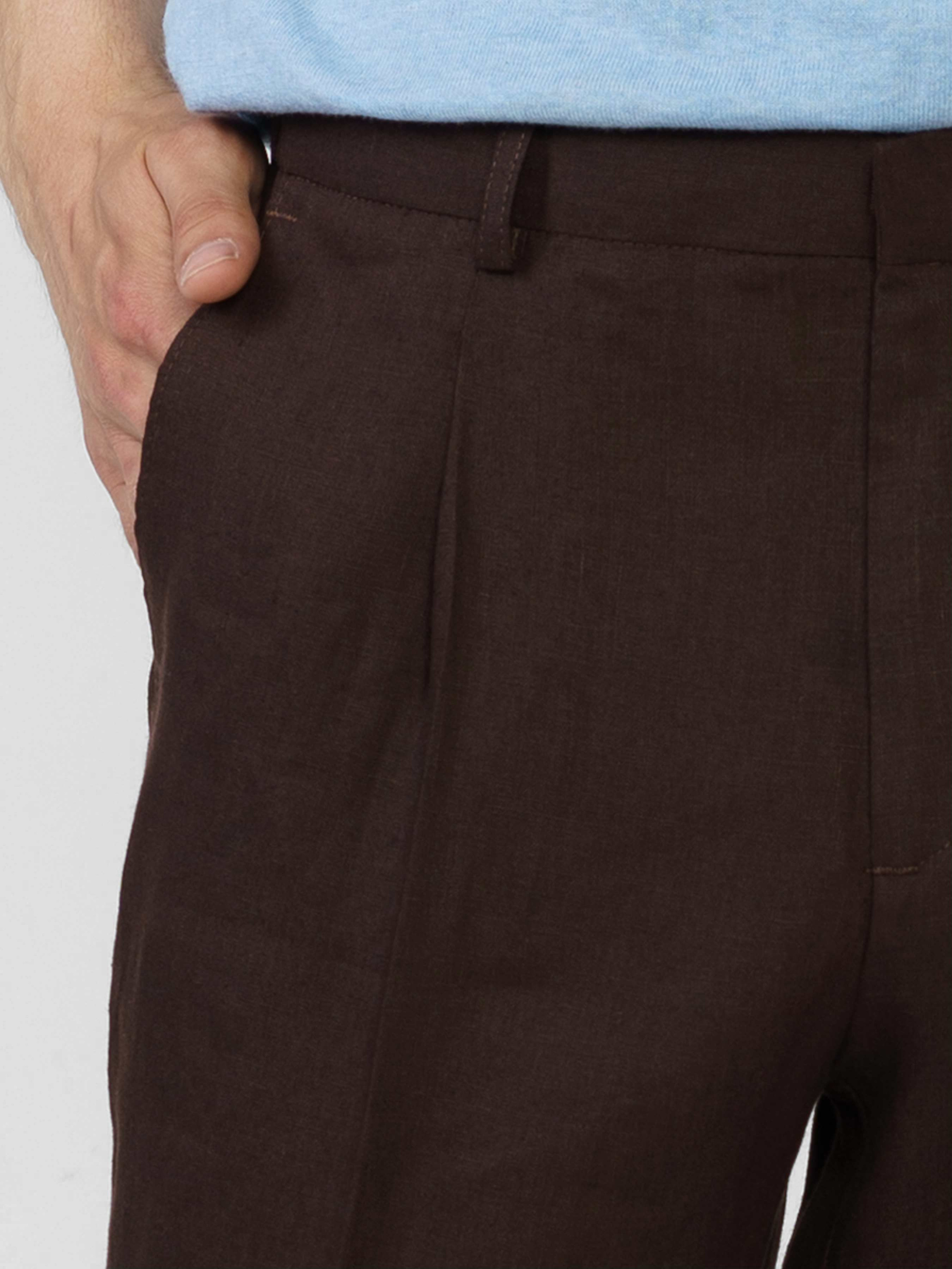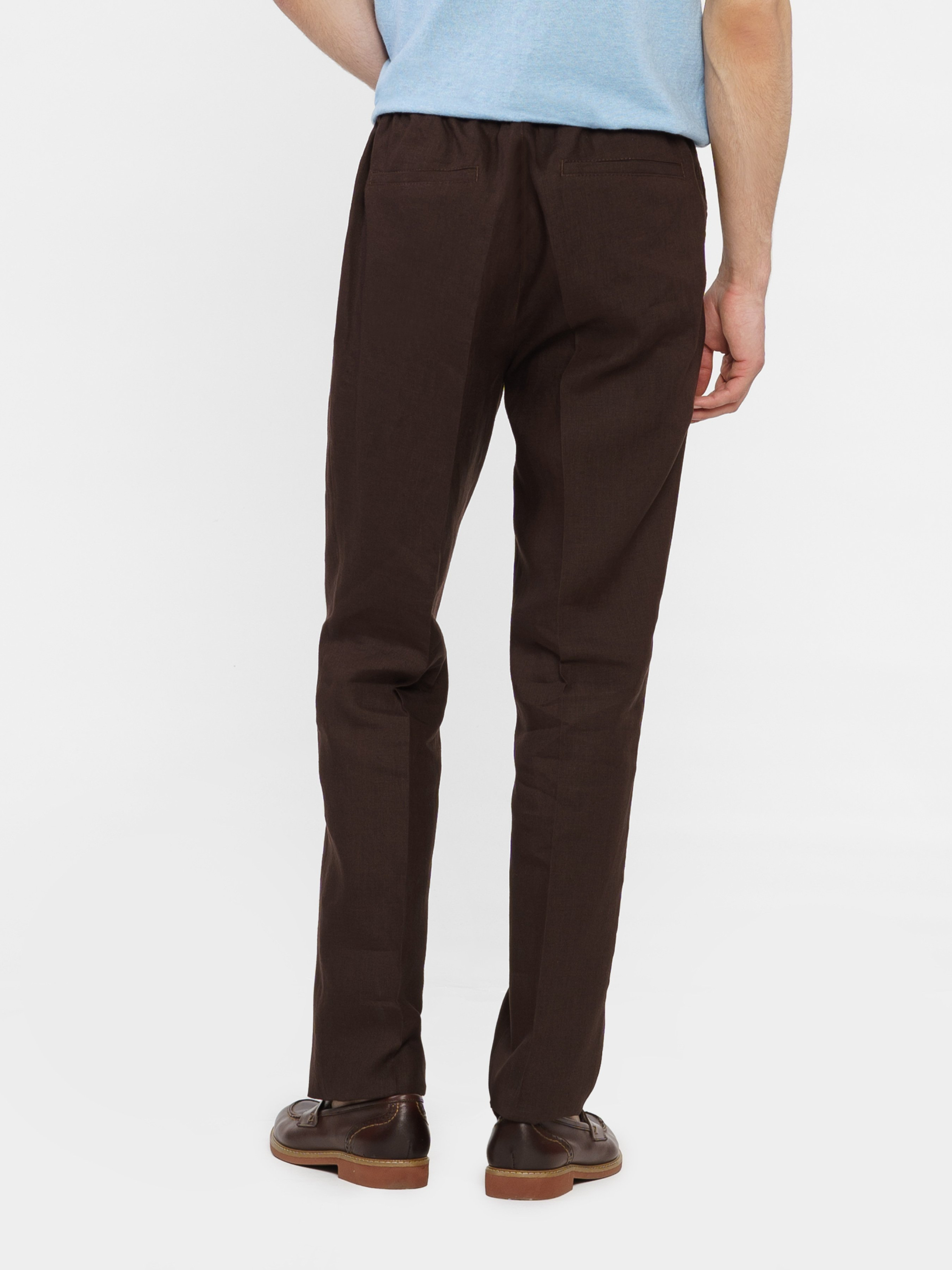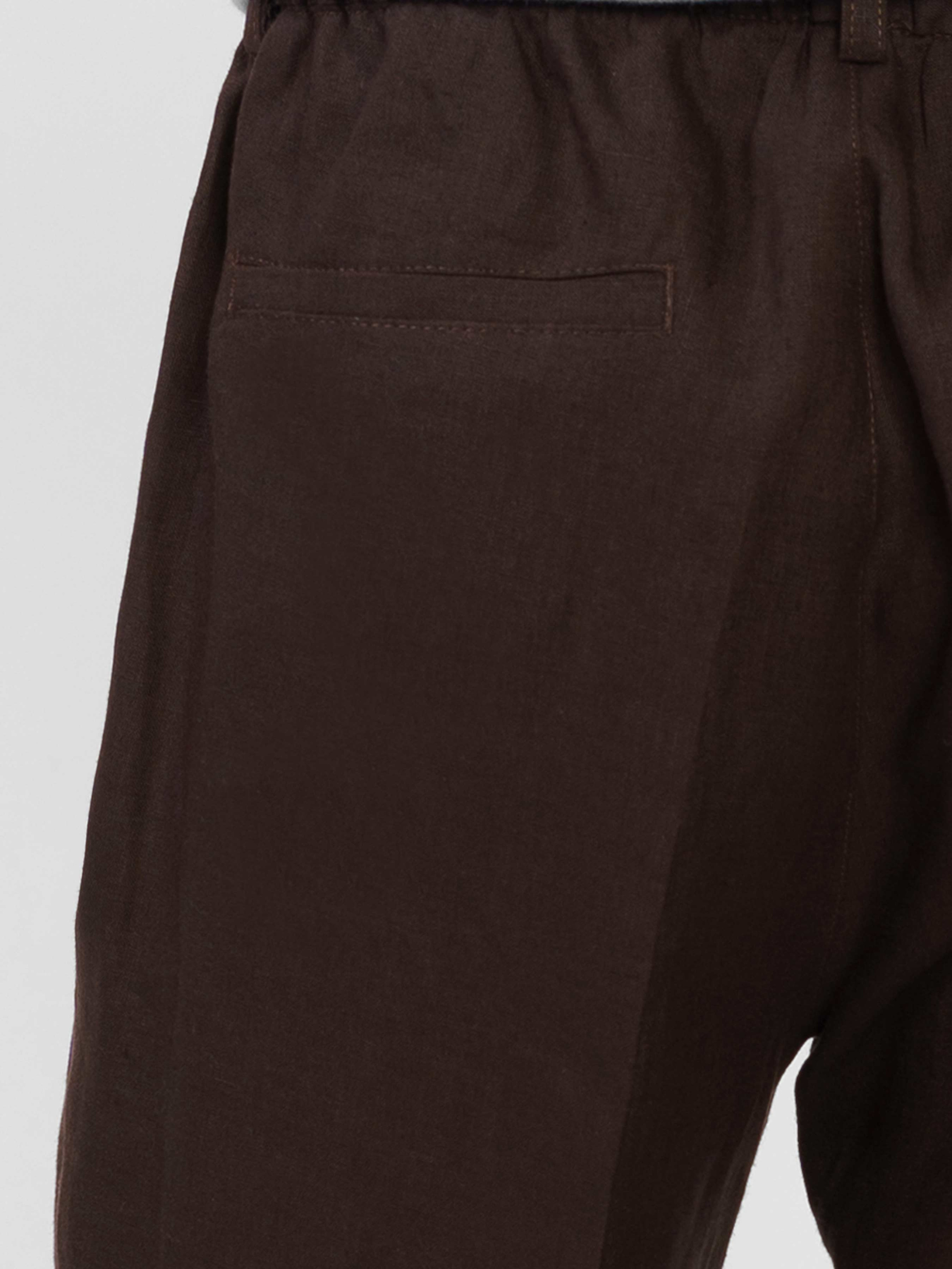 Чоловічі коричневі брюки Arber з натуральної екологічної лляної тканини - це ідеальне поєднання комфорту та витонченого повсякденного стилю. Завдяки властивостям натуральної тканини та розслабленому крою із зручним поясом на резинці зі шнурком, модель надзвичайно комфортна, що створює безтурботну привабливість. Брюки прямі, з двома похилими боковими кишенями і двома прорізними задніми. Вдало поєднуються з лляними піджаками, сорочками та трикотажем. Для комплекту можна поєднувати з піджаком із такої тканини M02.33.38.421.