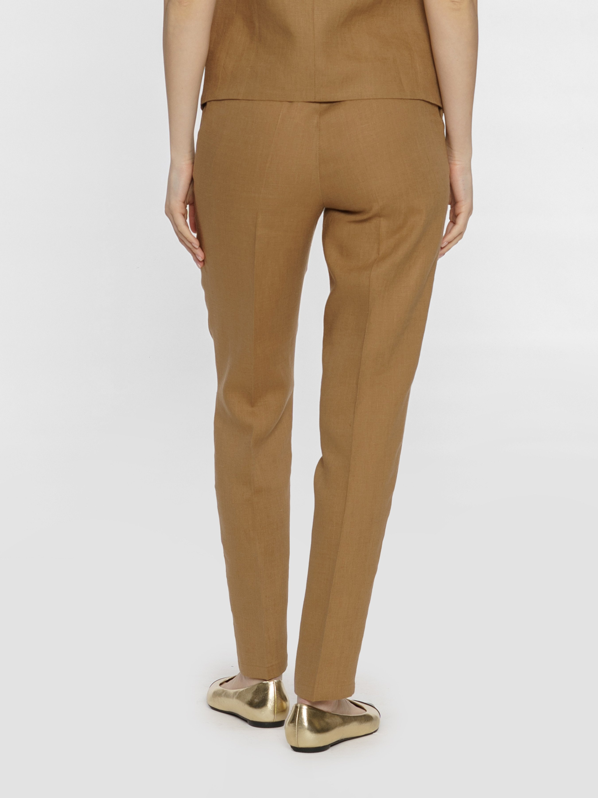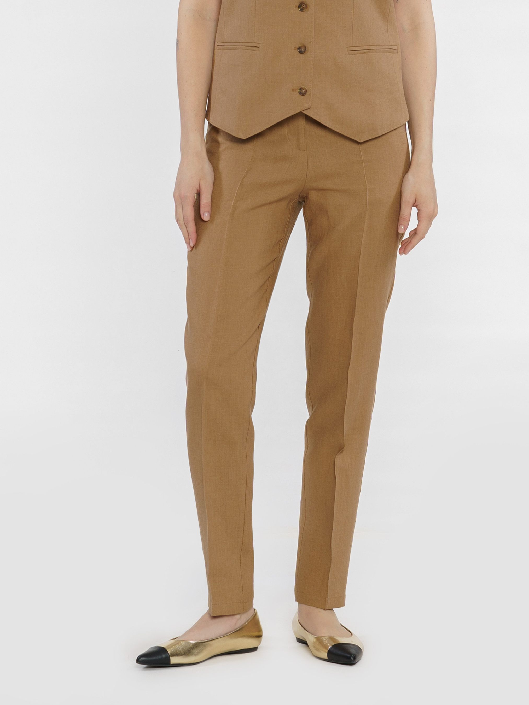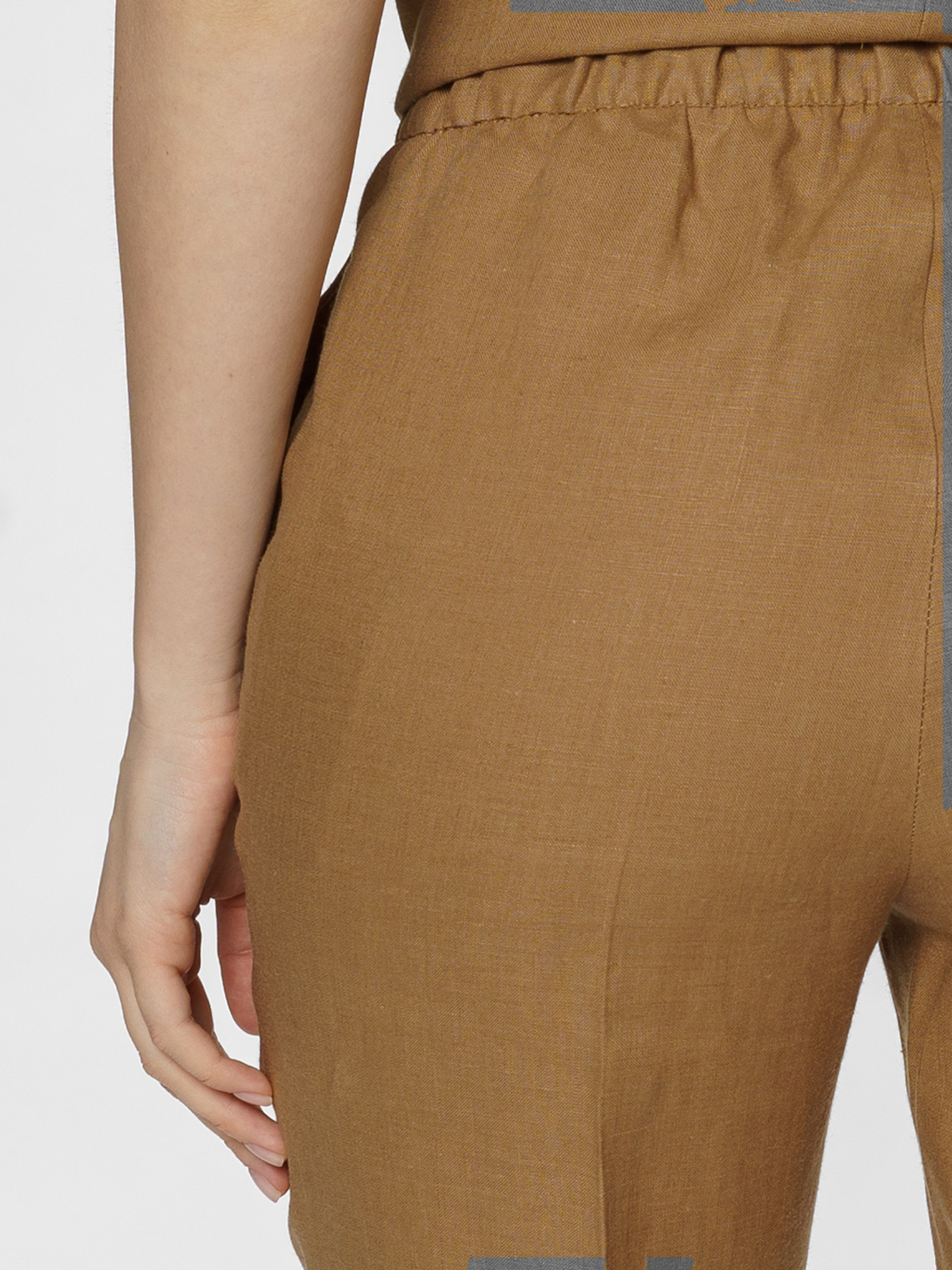Жіночі бежеві штани Arber з натуральної екологічно льняної тканини - це ідеальне поєднання комфорту і витонченого повсякденного стилю. Завдяки властивостям натуральної тканини та розслабленому крою зі зручним поясом на гумці ззаду, модель дуже комфортна, що створює безтурботну привабливість. Штани завужені до низу, з двома похилими бічними кишенями. Вдало поєднуються з льняними жакетами, сорочками й трикотажем. Для комплекту можна поєднувати з жакетом з такої ж тканини W02.14.16.421.