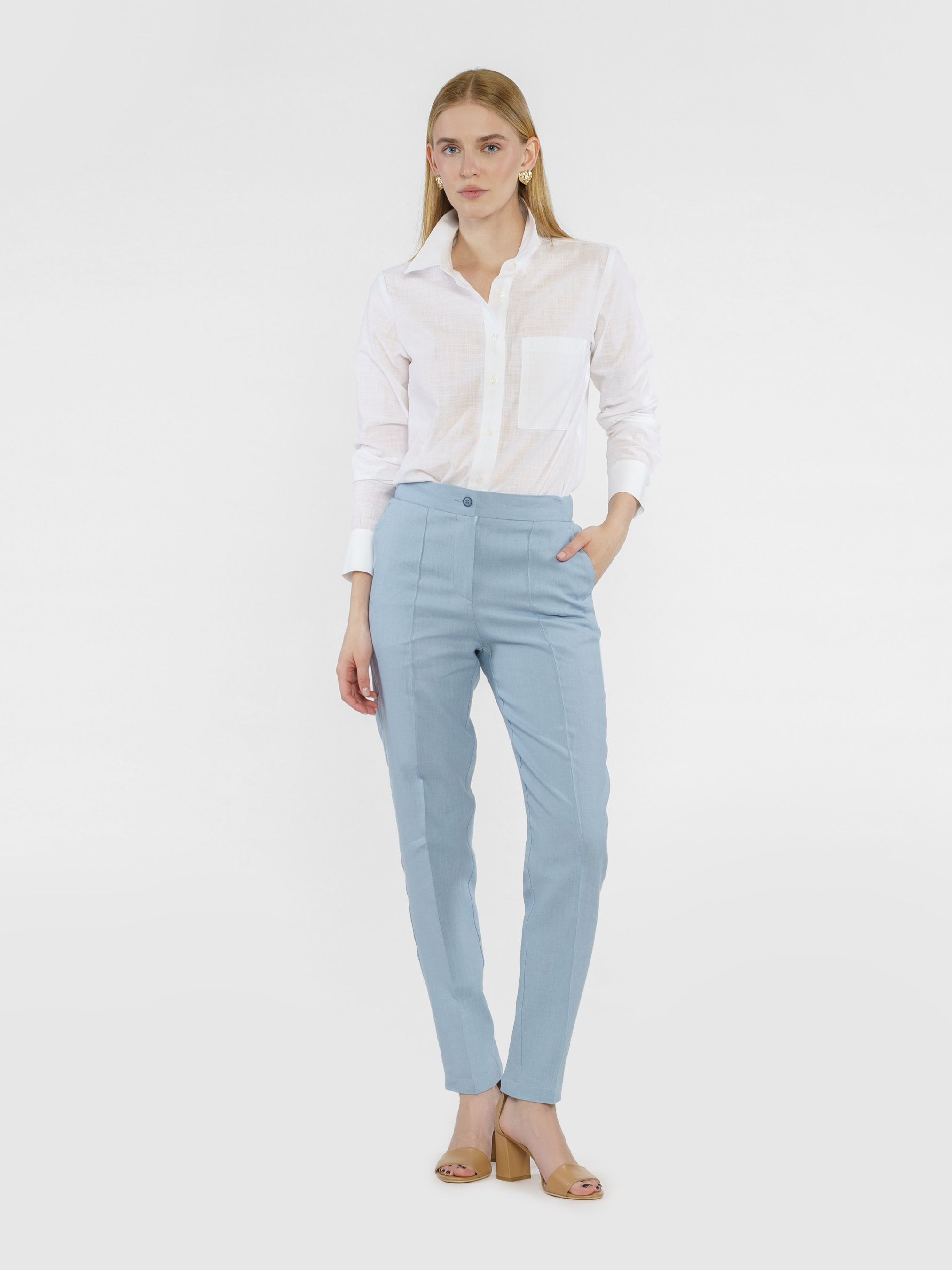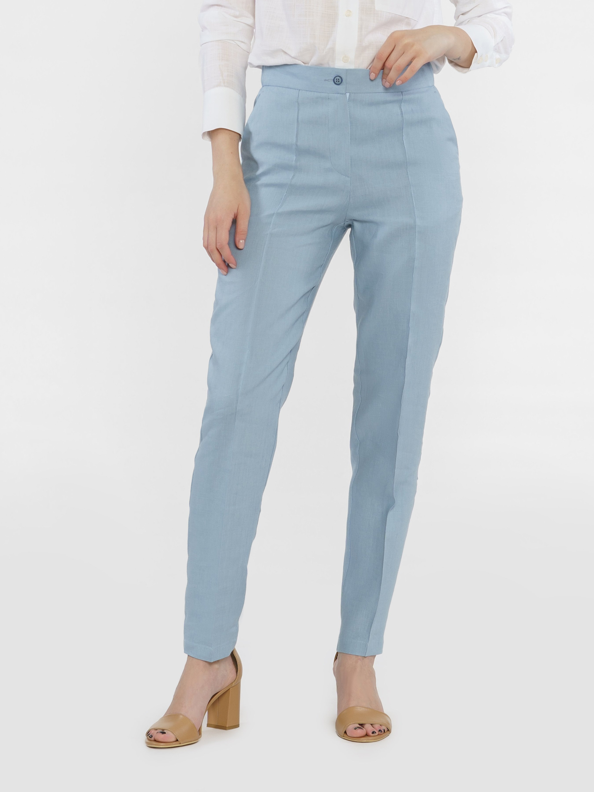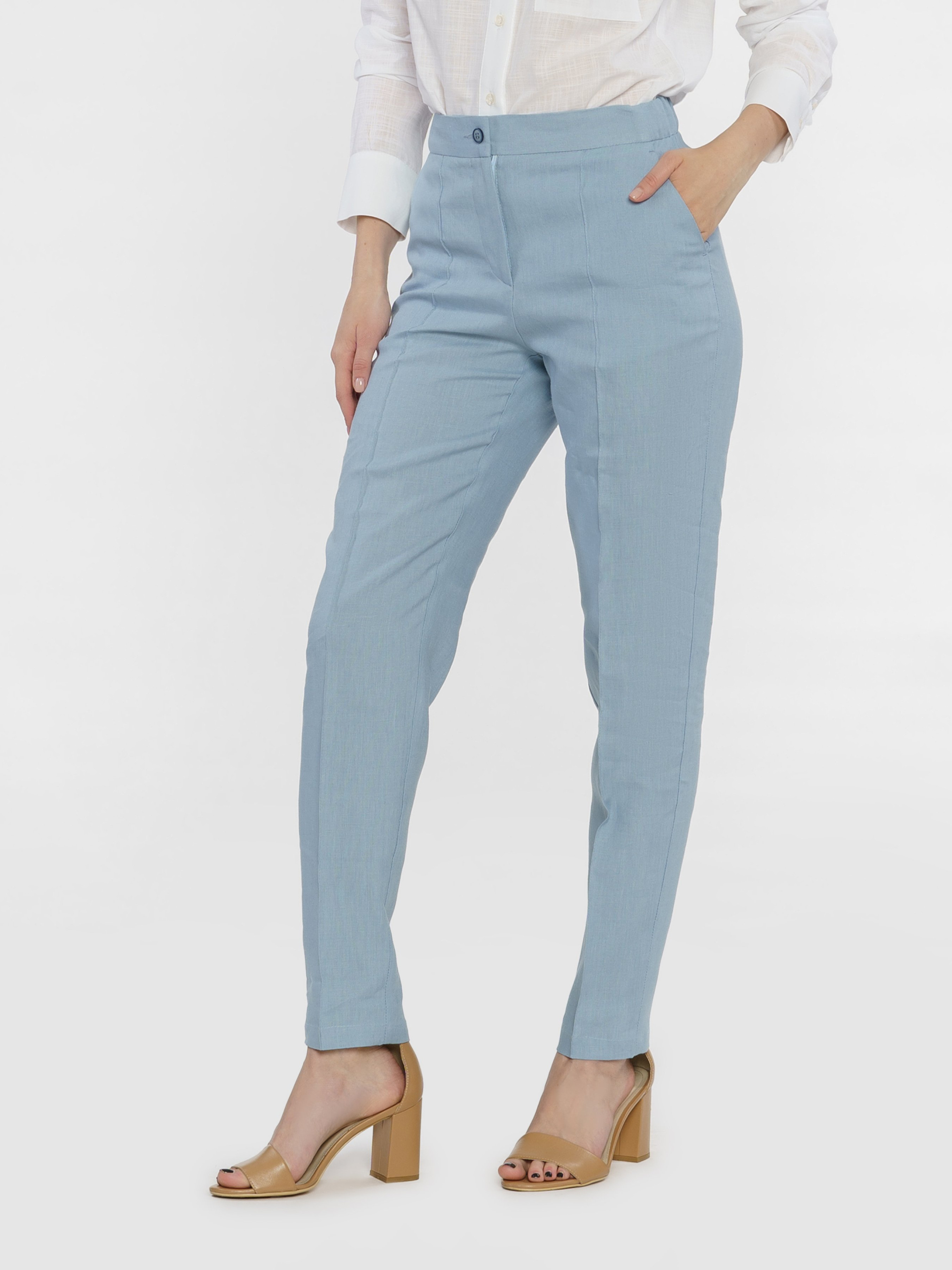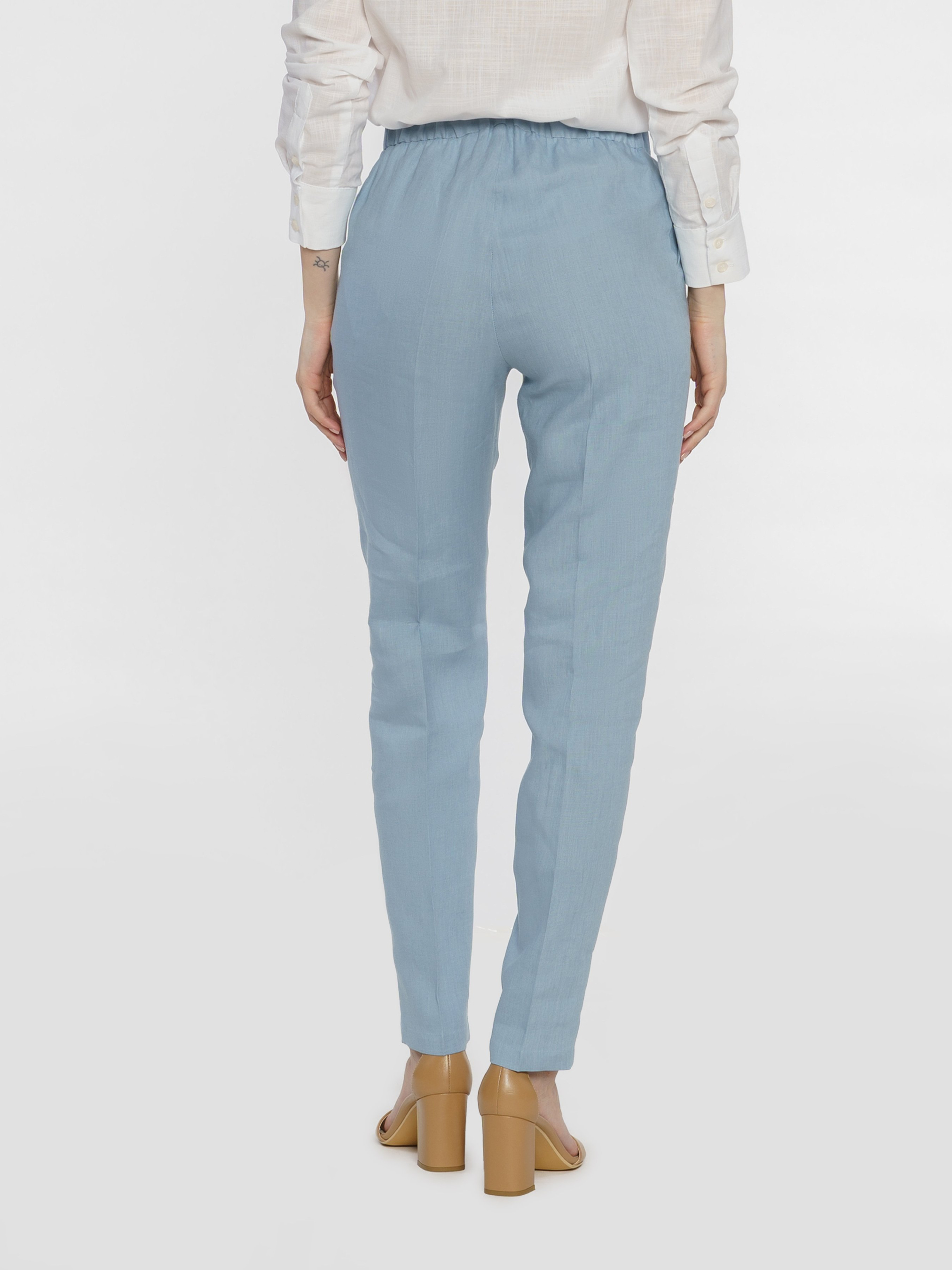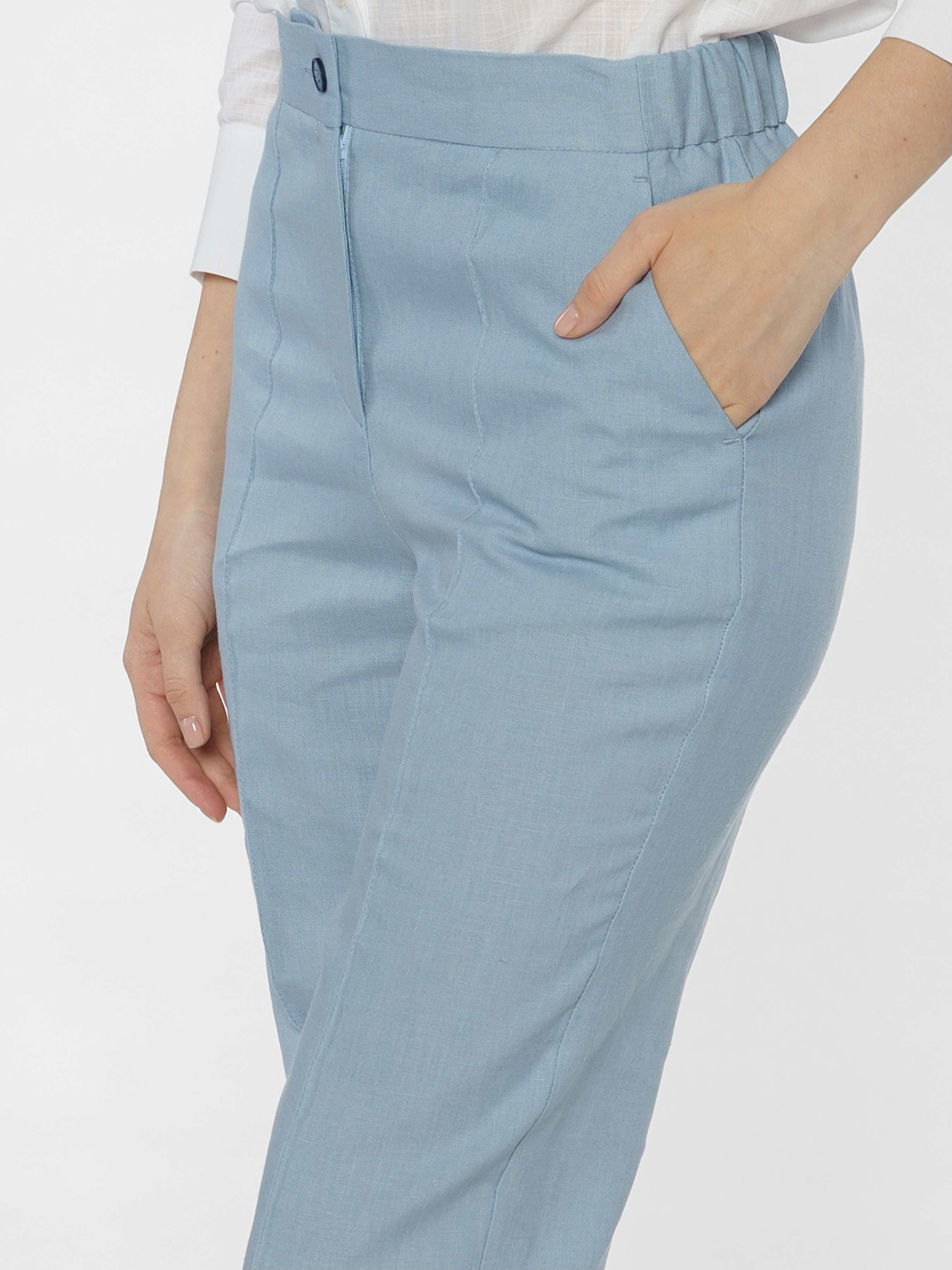Жіночі блакитні штани Arber з натуральної екологічно льняної тканини - це ідеальне поєднання комфорту і витонченого повсякденного стилю. Завдяки властивостям натуральної тканини та розслабленому крою зі зручним поясом на гумці ззаду, модель дуже комфортна, що створює безтурботну привабливість. Штани завужені до низу, з двома похилими бічними кишенями. Вдало поєднуються з льняними жакетами, сорочками й трикотажем. Для комплекту можна поєднувати з жакетом з такої ж тканини W02.15.23.422.