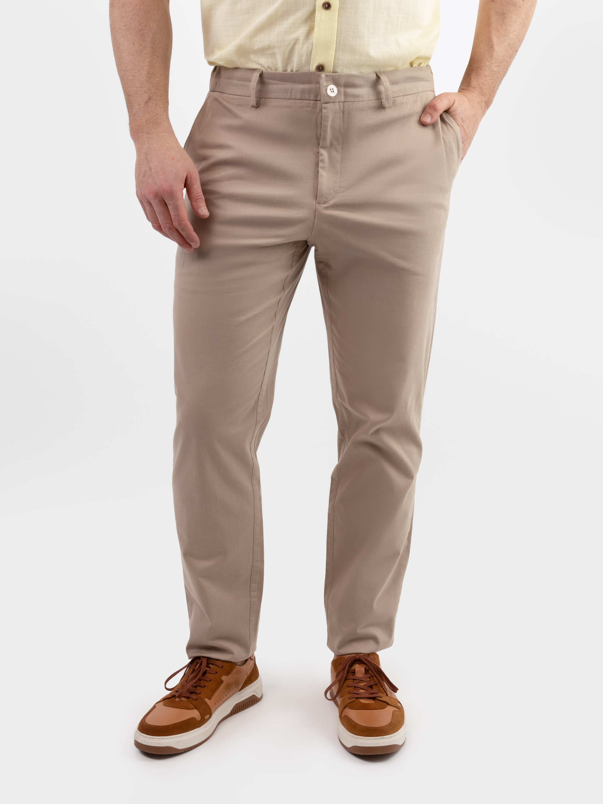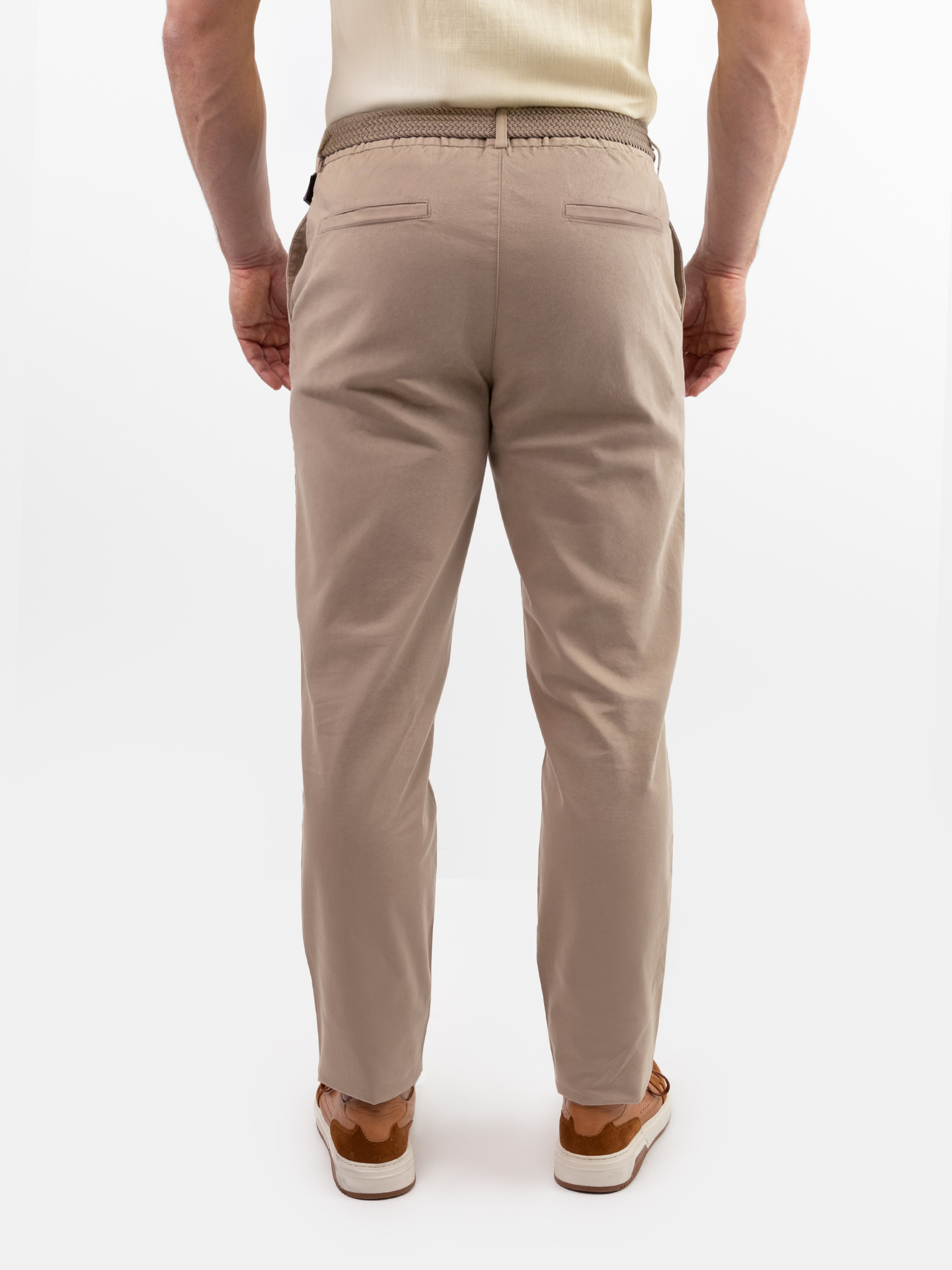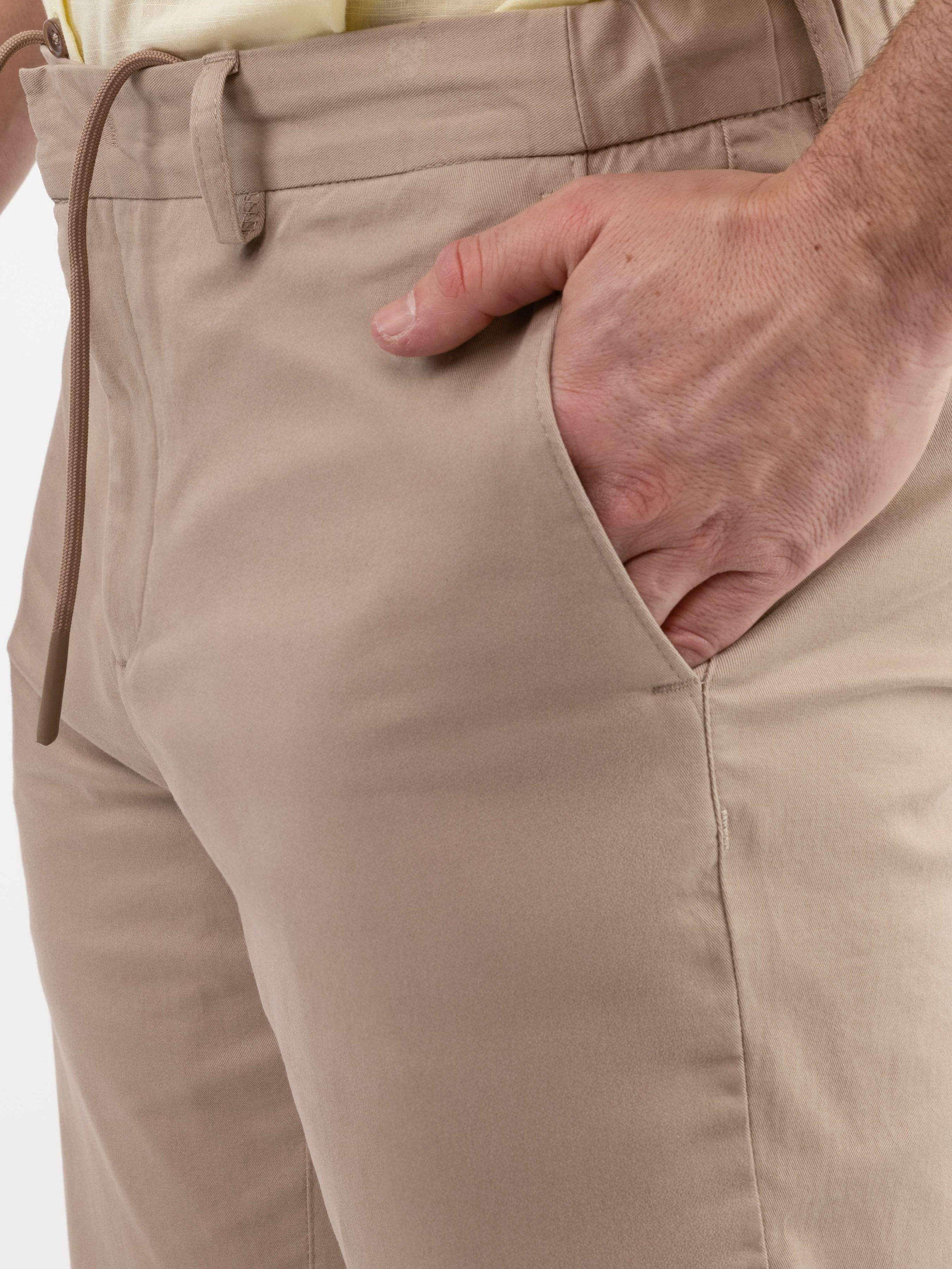 Чоловічі брюки chino Arber універсального бежевого кольору, створені з м'якої дихаючої бавовни з добавкою еластану. Завдяки властивостям натуральної тканини та розслабленому крою зі зручним поясом на гумці та шнурком, модель надзвичайно комфортна, що створює безтурботну привабливість. Брюки звужені до низу, з двома похилими боковими кишенями і двома прорізними задніми. Штани вдало впишуться в гардероб в стилі casual в поєднанні з поло, футболками та кедами, або з легким блейзером.