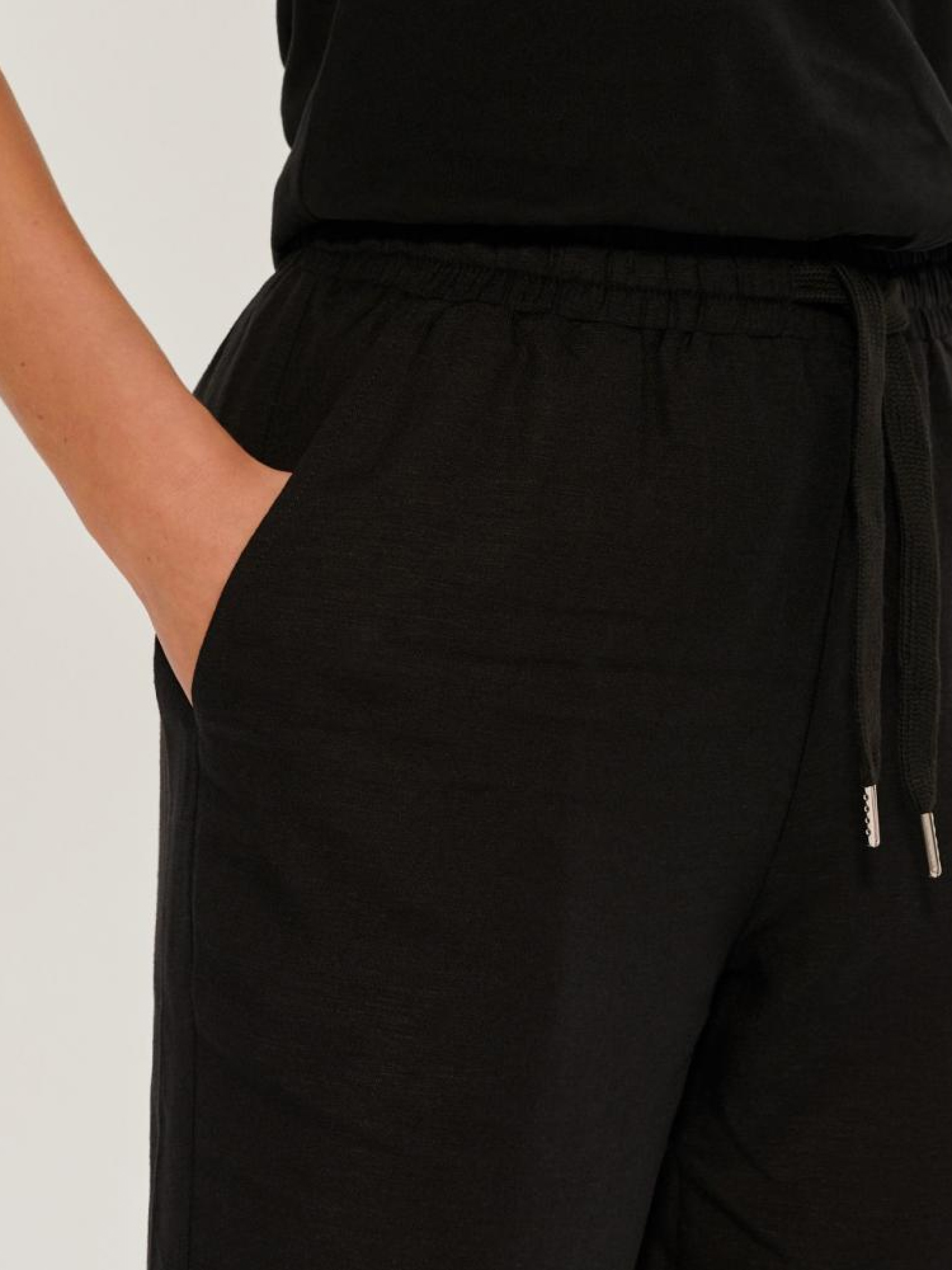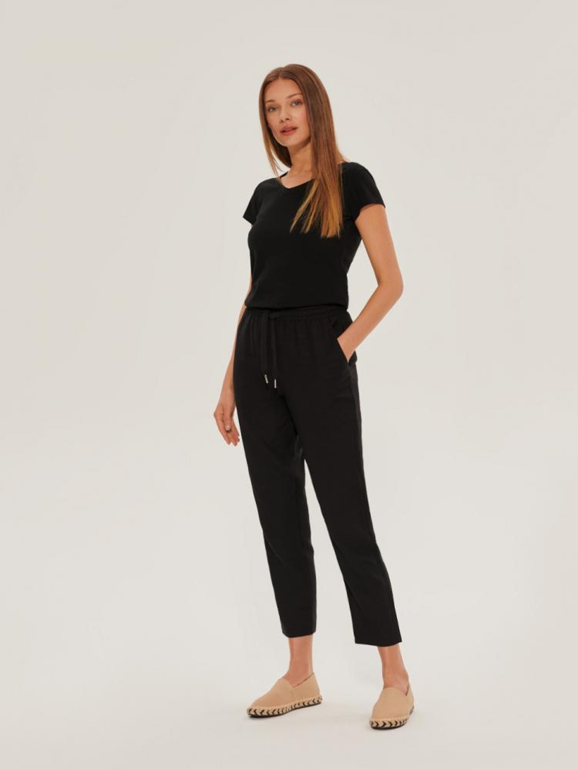 Тканинні штани із зав'язками на талії: - завужені до низу штанини, - зав'язуються на талії зав'язками, - з кишенями, - із завищеною талією, - доступні у чорному кольорі. Сезон: Весна / Літо. Склад: 75% віскоза, 25% льон. РОЗМІР: 34, 36, 38, 40, 42 . ШИРИНА ПОЯСА: 33,00 см, 35,00 см, 37,00 см, 39,00 см, 41,00 см . ДОВЖИНА ВНУТРІШНЬОЇ НОГИ 68,00 см, 68,00 см, 70,50 см, 73,00 см, 75,50 см . ШИРИНА СТЕГНА: 30,50 см, 31,50 см, 32,50 см, 33,50 см, 34,50 см . ШИРИНА НИЗУ: ШТАНИНИ 15,00 см, 16,00 см, 17,00 см, 18,00 см, 19,00 см