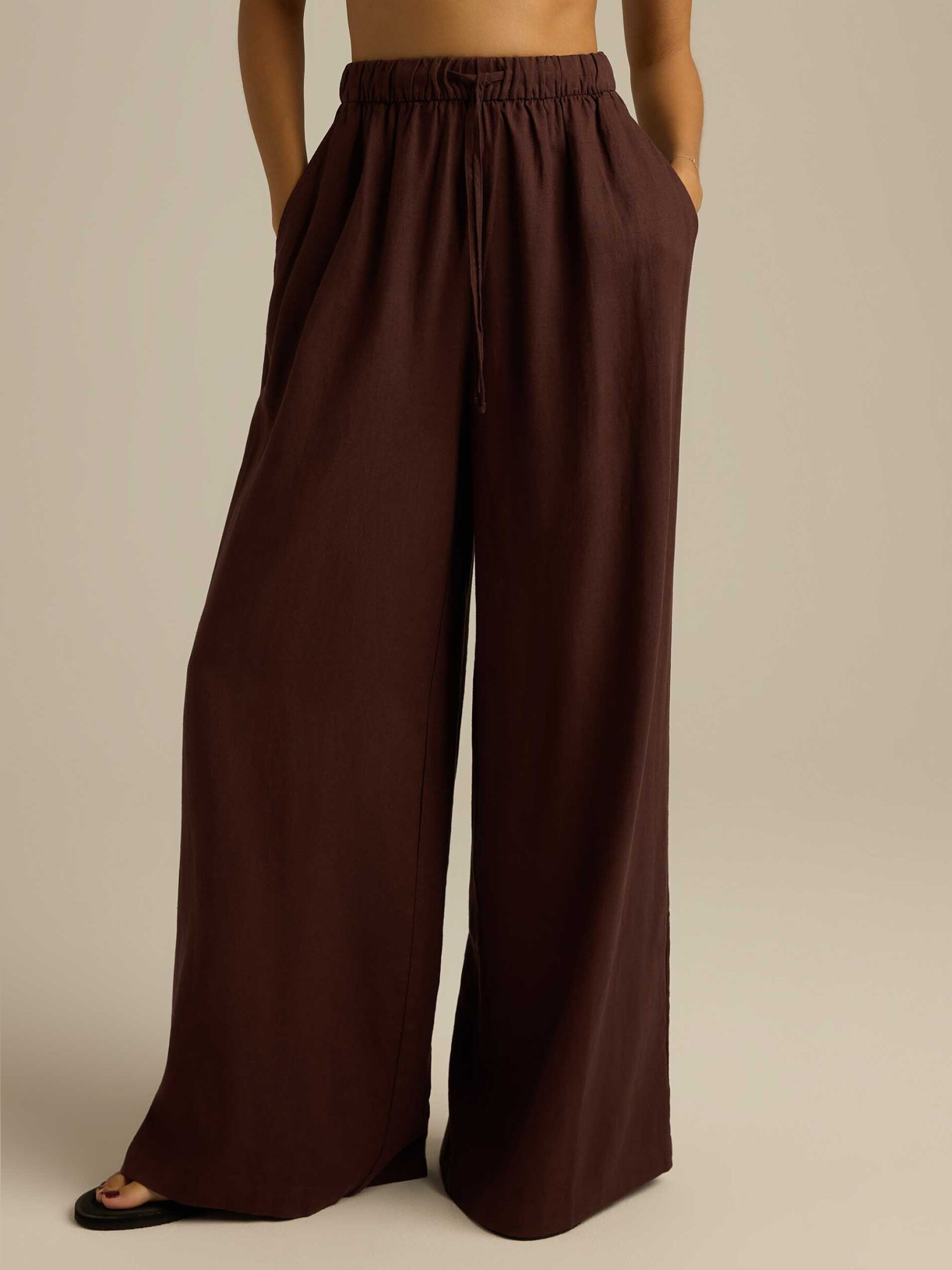 WORIA Штани з лляно-віскозної тканини: - вільного крою, - висока талія з гумкою та зав'язкою на талії, - широкі, довгі штанини, - кишені з боків. Cклад: 55% льон 45% віскоза Сезон: Весна/Літо Догляд: - прання при максимум 30 °С - не відбілювати - не сушити в сушильній машині - прасувати максимум при темп. 150 °С - не хімчистка