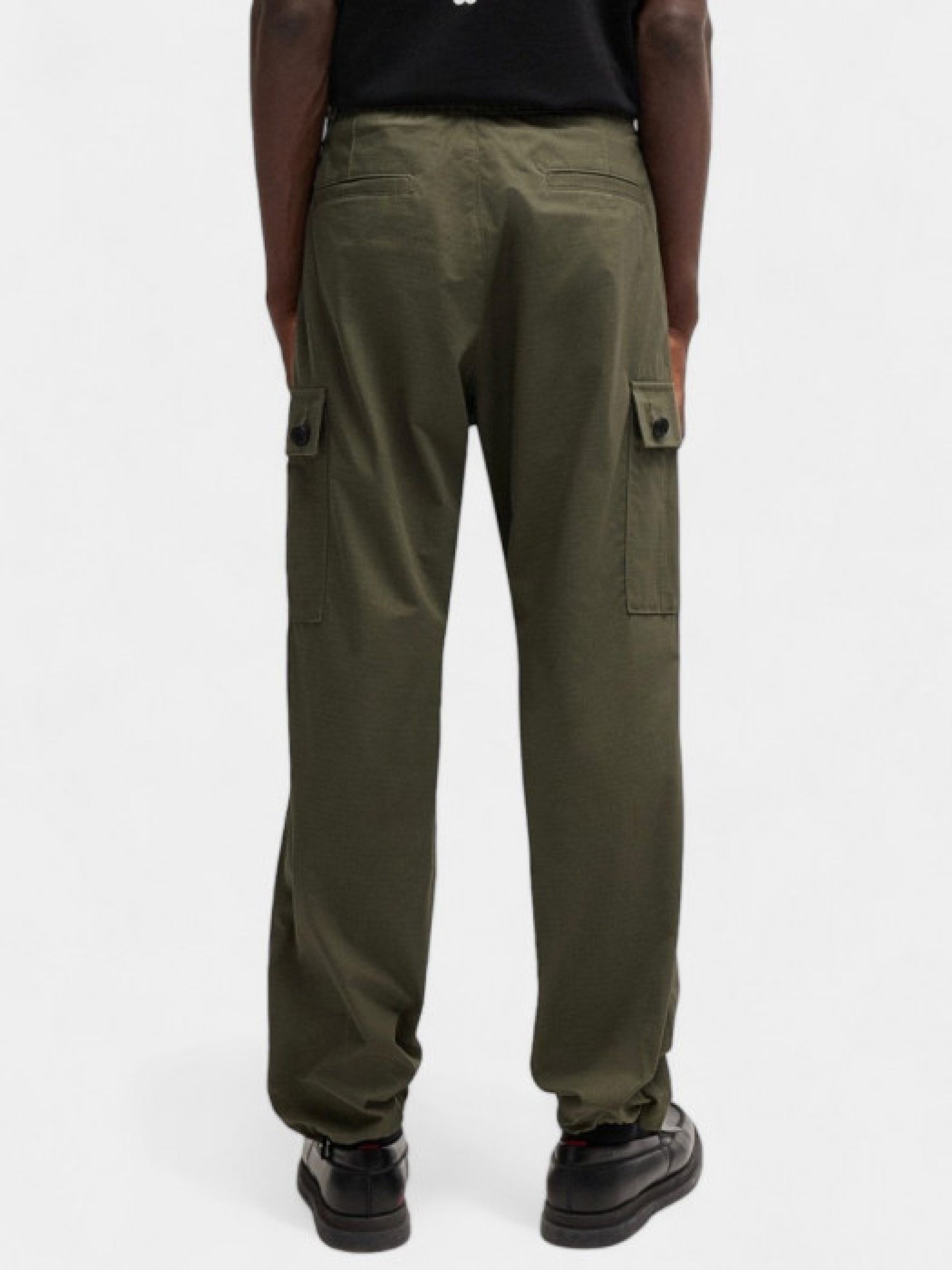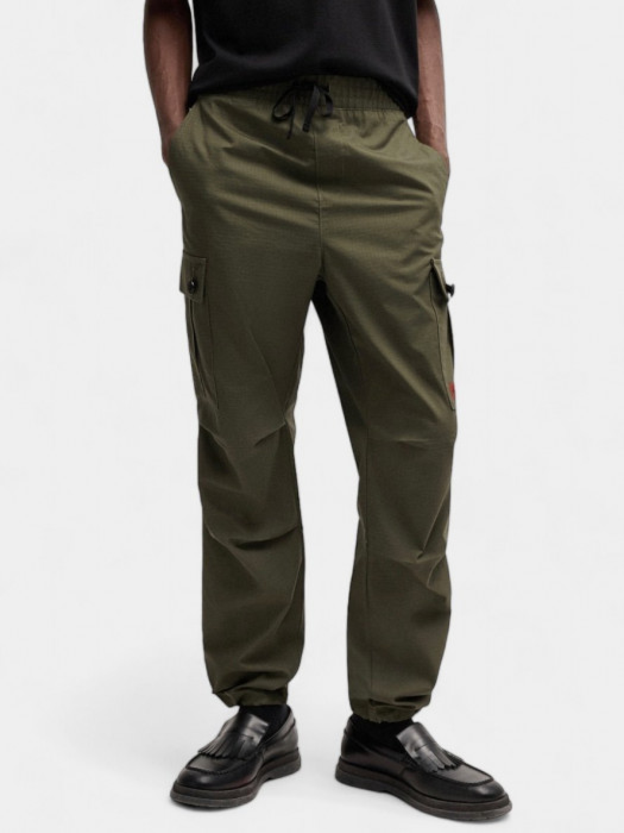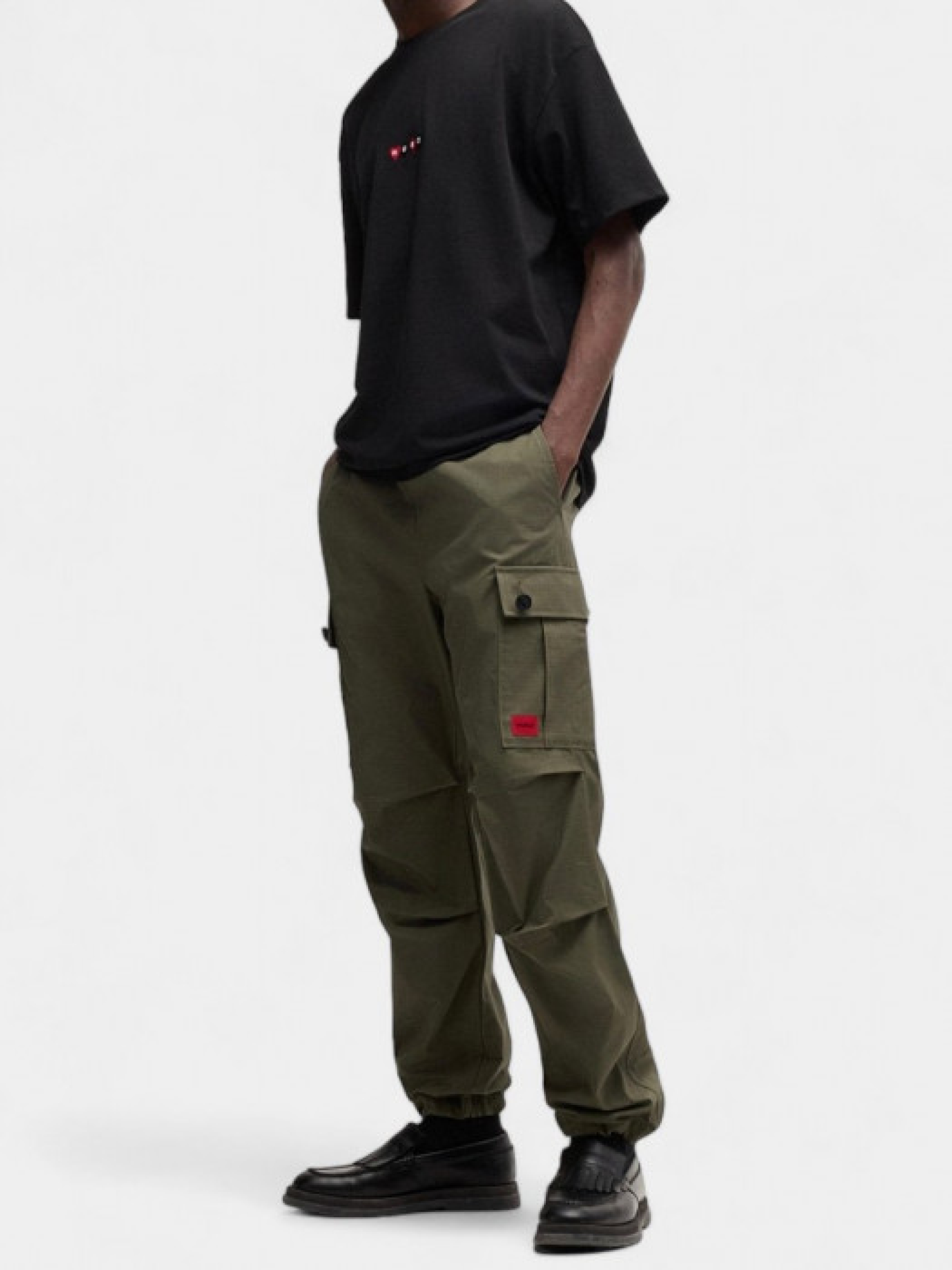 Карго Garlo233 від HUGO, виготовлені з міцної бавовняної тканини ripstop, яка забезпечує додаткову міцність. Мають стандартний крій та середню посадку, що робить їх зручними для повсякденного носіння. Карго оснащені кількома кишенями, включаючи бічні кишені з ґудзиками та задні кишені з клапанами, що додає функціональності та стильного вигляду. На брюках також присутній червоний логотипний ярлик HUGO. Зріст моделі - 191 см, на моделі розмір 48.