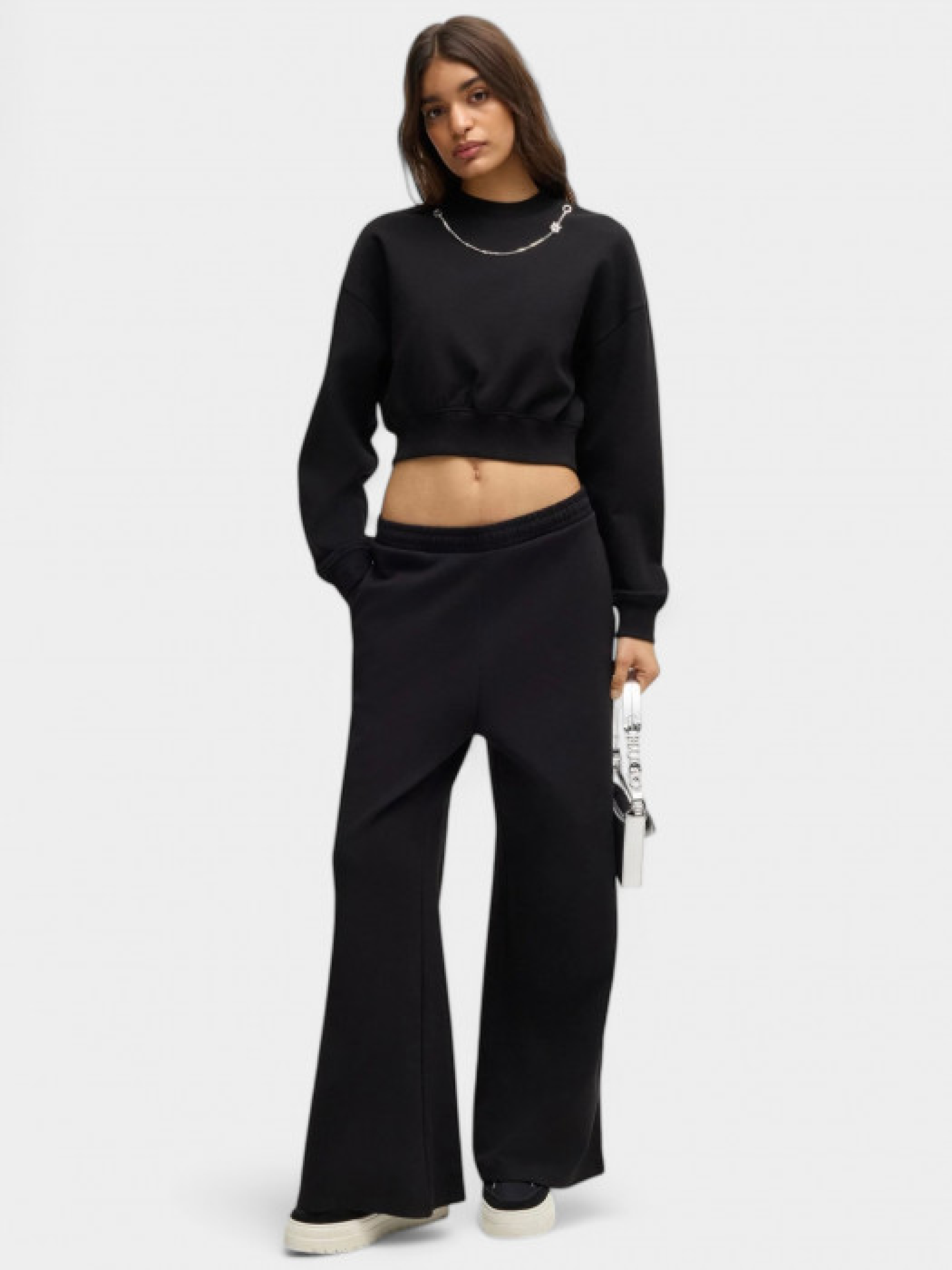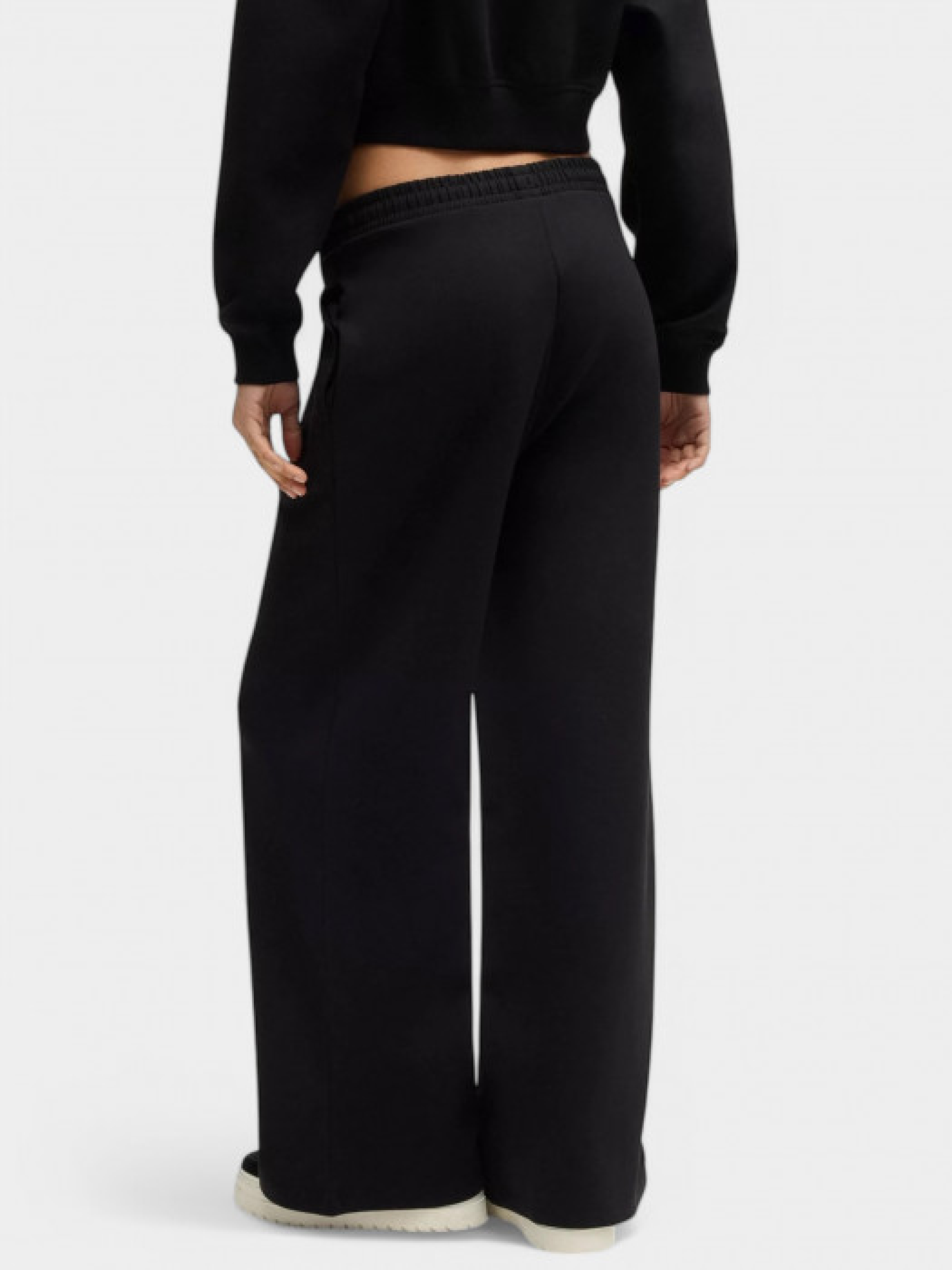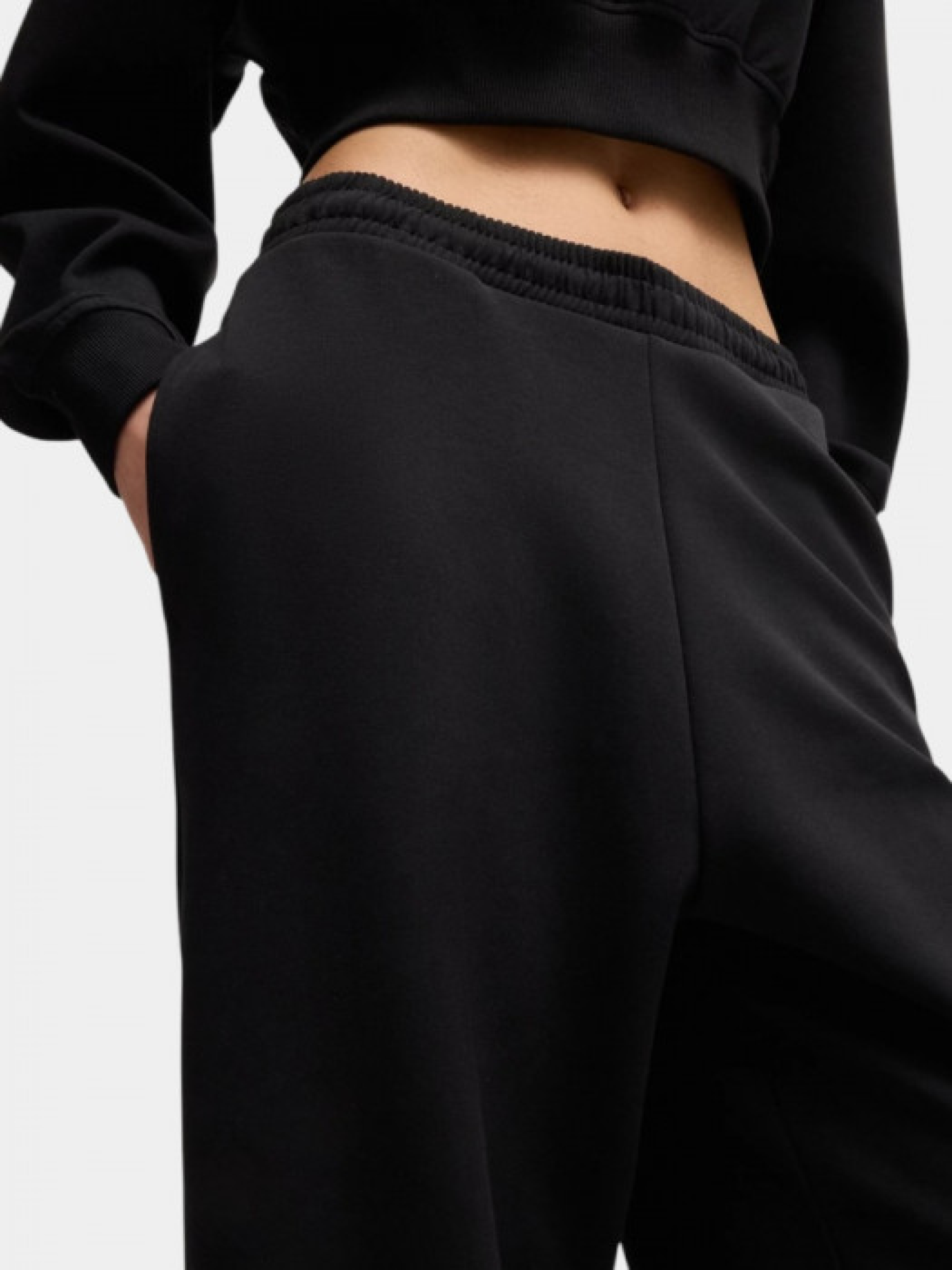 Спортивні штани від HUGO Womenswear у вільному крої з широкими штанинами. Виконані з бавовняної еластичної тканини для зручності під час руху. Оснащені поясом на резинці зі шнурком, бічними прорізними кишенями та мають середню посадку. Параметри моделі: 78-60-89 см, зріст 178 см. На моделі розмір S.