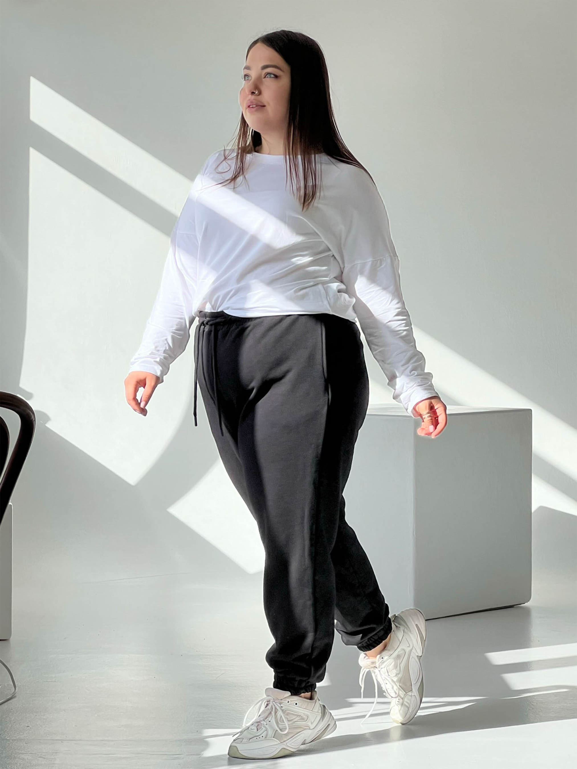 Вільні унісекс джоггери. На поясі гумка плюс шнурок. Посадка може бути висока, на талії, і низька на стегнах. Є вільні кишені для рук. На манжетах штанин - резинки Тканина: футер петля класу пен'є Турция. На ліцевій поверхні не утроворюються ніяких катишок навіть після пів року регулярного використання. Заміри виробу для джоггерів: 0 розмір: обхват стегон 115 см, довжина по зовнішньому шву 90 см, по внутрішньому 60 см 1 розмір (оптимально на зріст до 173 см): обхват стегон 120 см, довжина по зовнішньому шву 94 см, по внутрішньому 63 см 2 розмір (оптимально на зріст від 175 см): обхват стегон 124 см, довжина по зовнішньому шву 100 см, по внутрішньому 67 см 3 розмір: обхват стегон 140 см, довжина по зовнішньому шву 105 см, по внутрішньому 70 см На фото: Меланія 165 см зріст, параметри 90-60-80 см -1 розмір Ксенія 160 см зріст, параметри 118-93-111см-2 розмір (петля), 3 розмір (фліс)