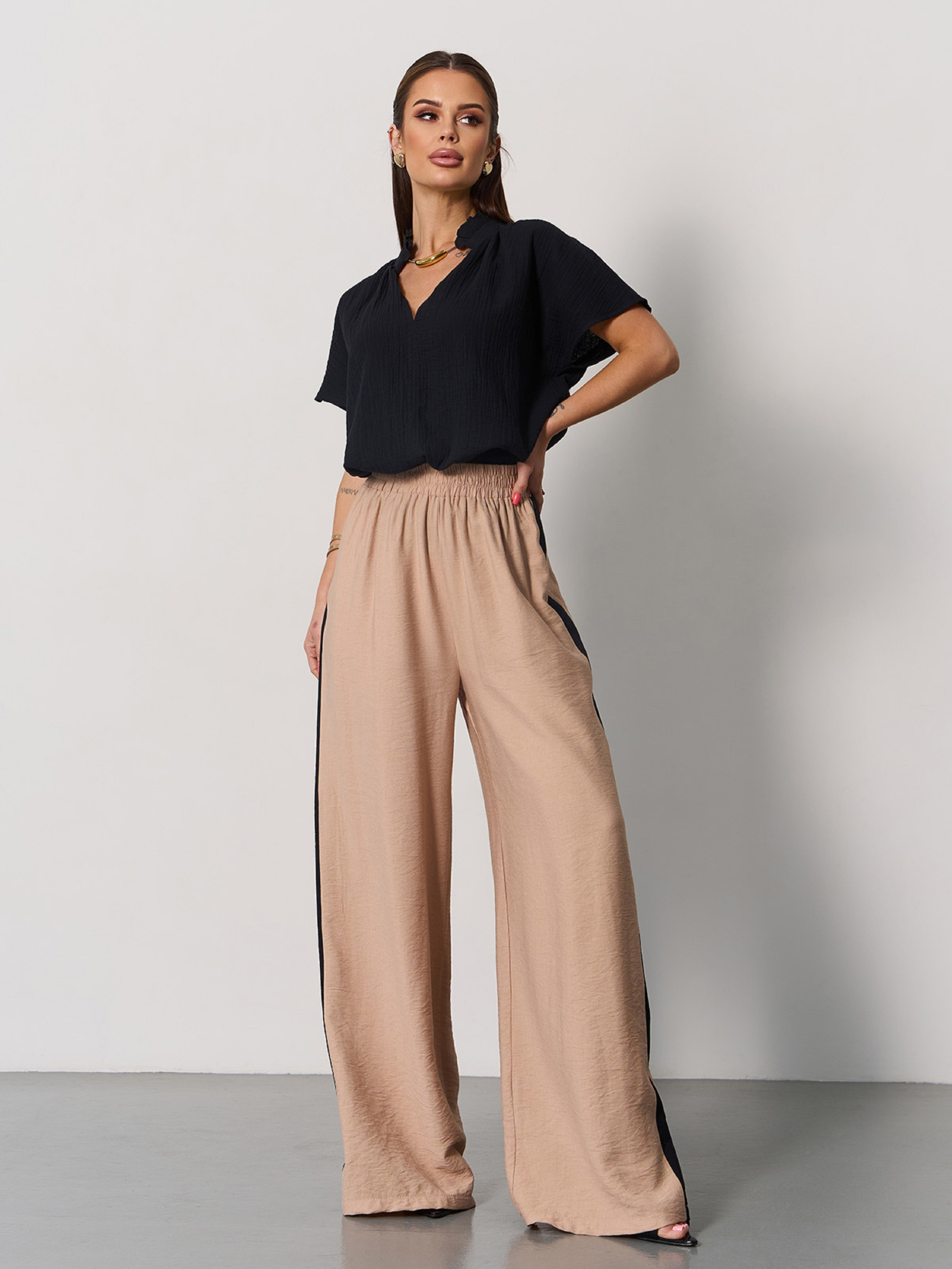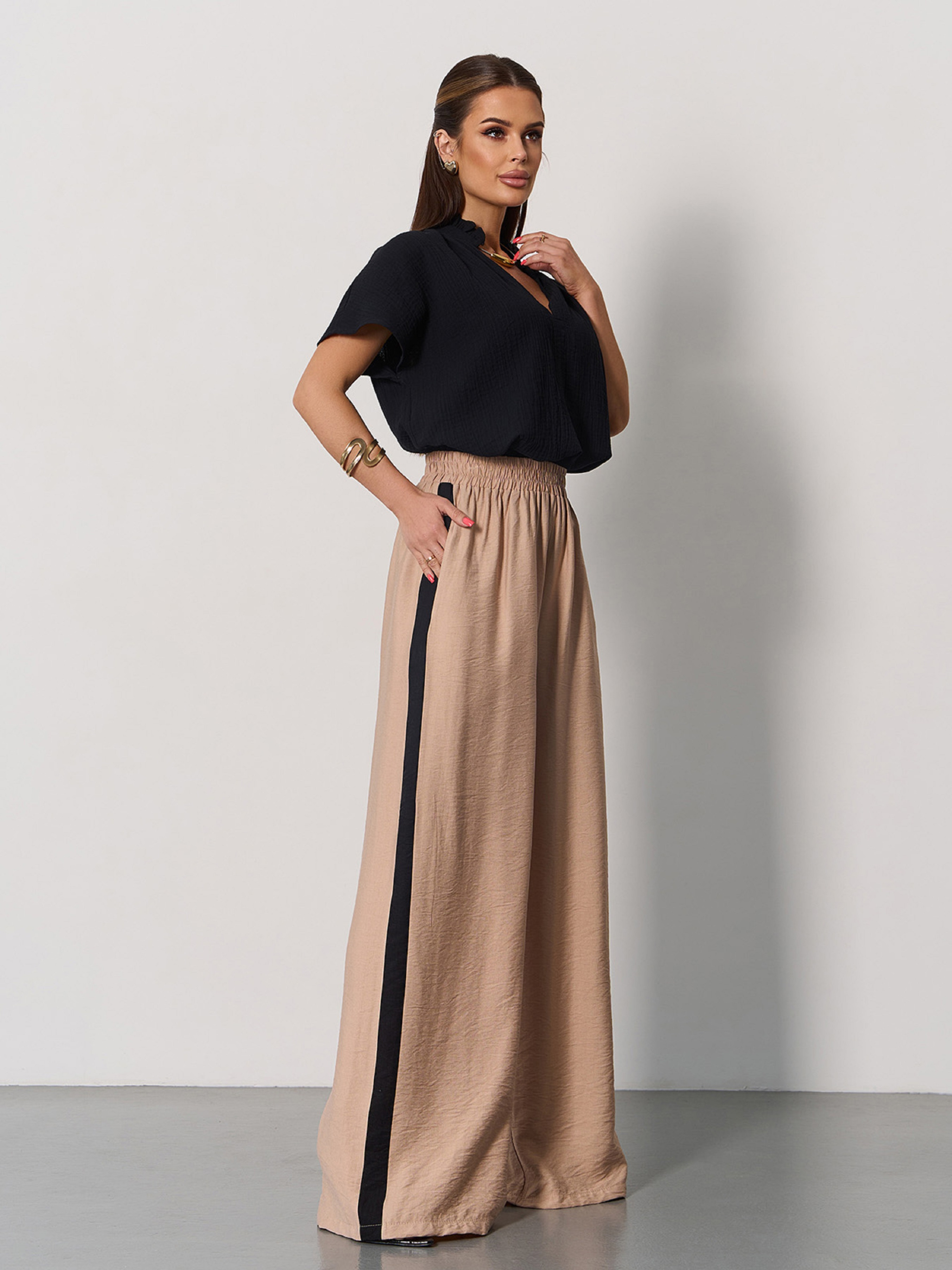 Бежево-чорні льняні брюки прямого крою з бічними лампасами. Модель високої посадки на талії зі шнурком на резинці. Штани із бічними кишенями. Напівобхват: Талія: S (30-40), M (32-42), L (34-44), XL (36-46), Стегна: S (60), M (62), L (64), XL (66), Довжина виробу - 106, Довжина внутрішнього шва - 75, Тканина: Низької еластичності. Склад: 65% льон, 20% бавовна, 15% поліестер