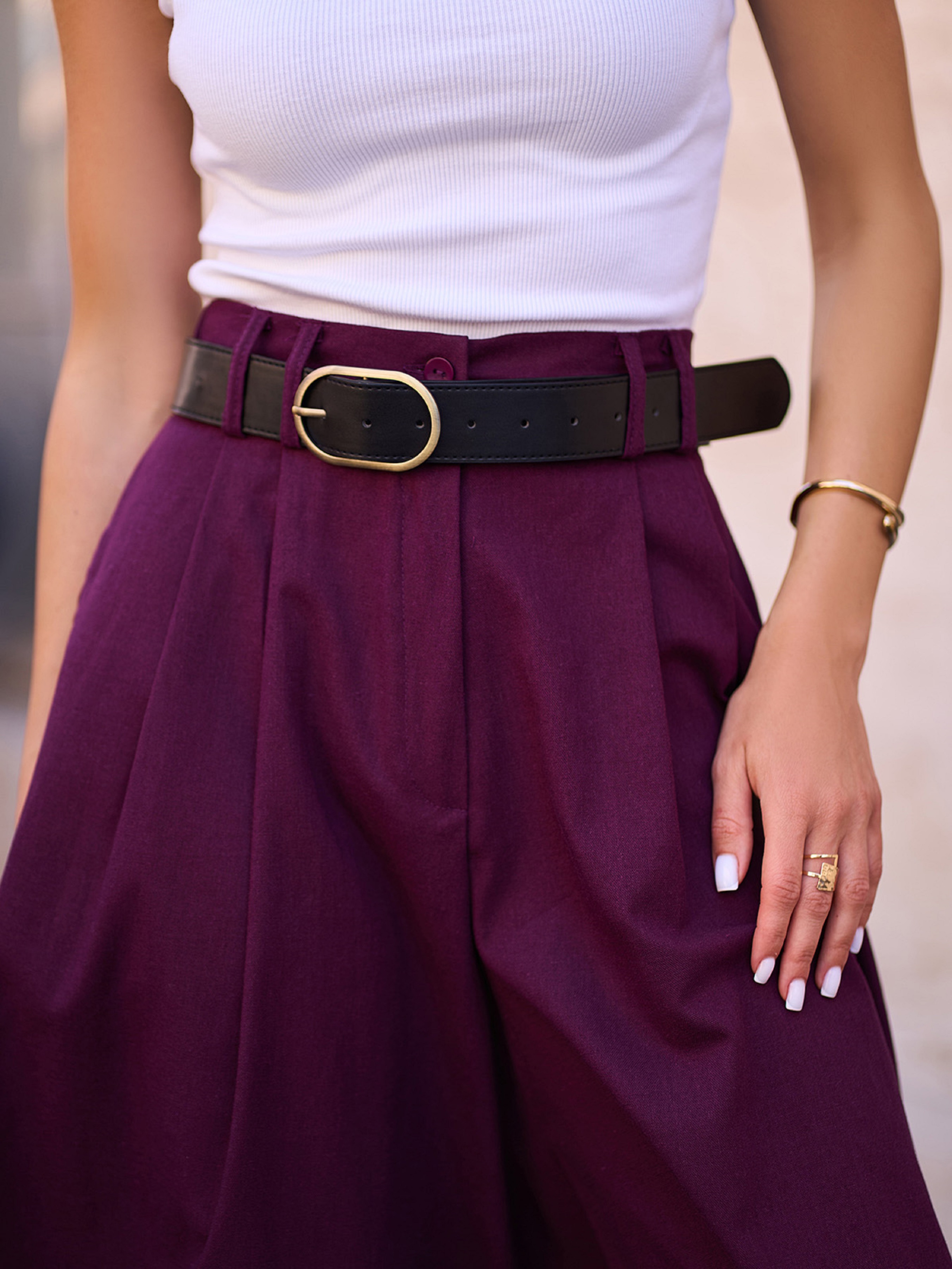 Фіолетові розкльошені кюлоти з кишенями, виконані з однотонного льону. Виріб з гумкою ззаду на поясі, защипами біля талії та поясними шльовками. Модель з довжиною нижче колін і застібкою-блискавкою з двома ґудзиками. Напівобхват: Талія: S (32), M (34), L (37), XL (39), XXL (41), 3XL (43); Стегна: S (59), M (61), L (63), XL (65), XXL (67), 3XL (69); Довжина виробу - 69; Довжина по внутрішньому шву - 36; Тканина: Низької еластичності.