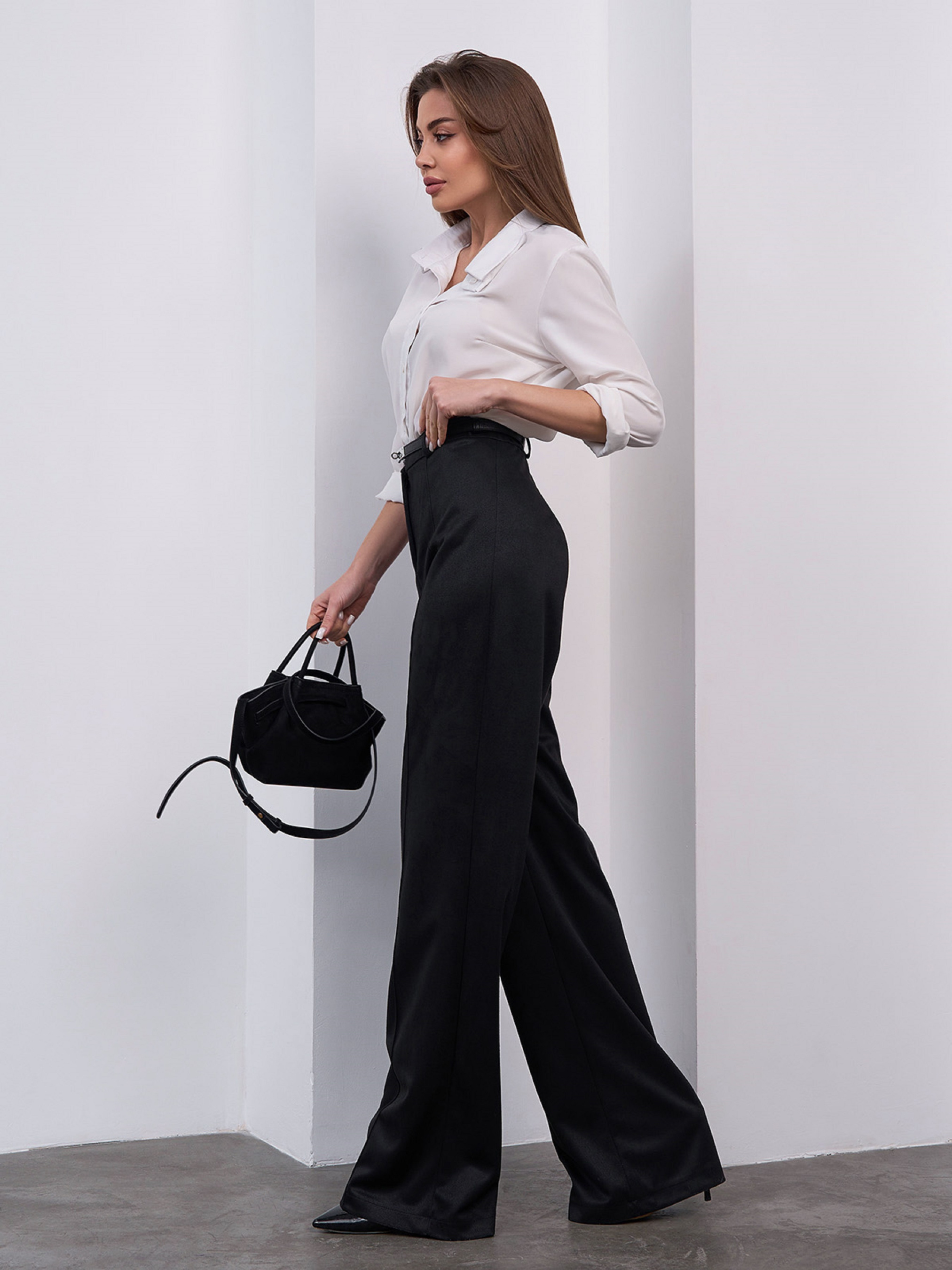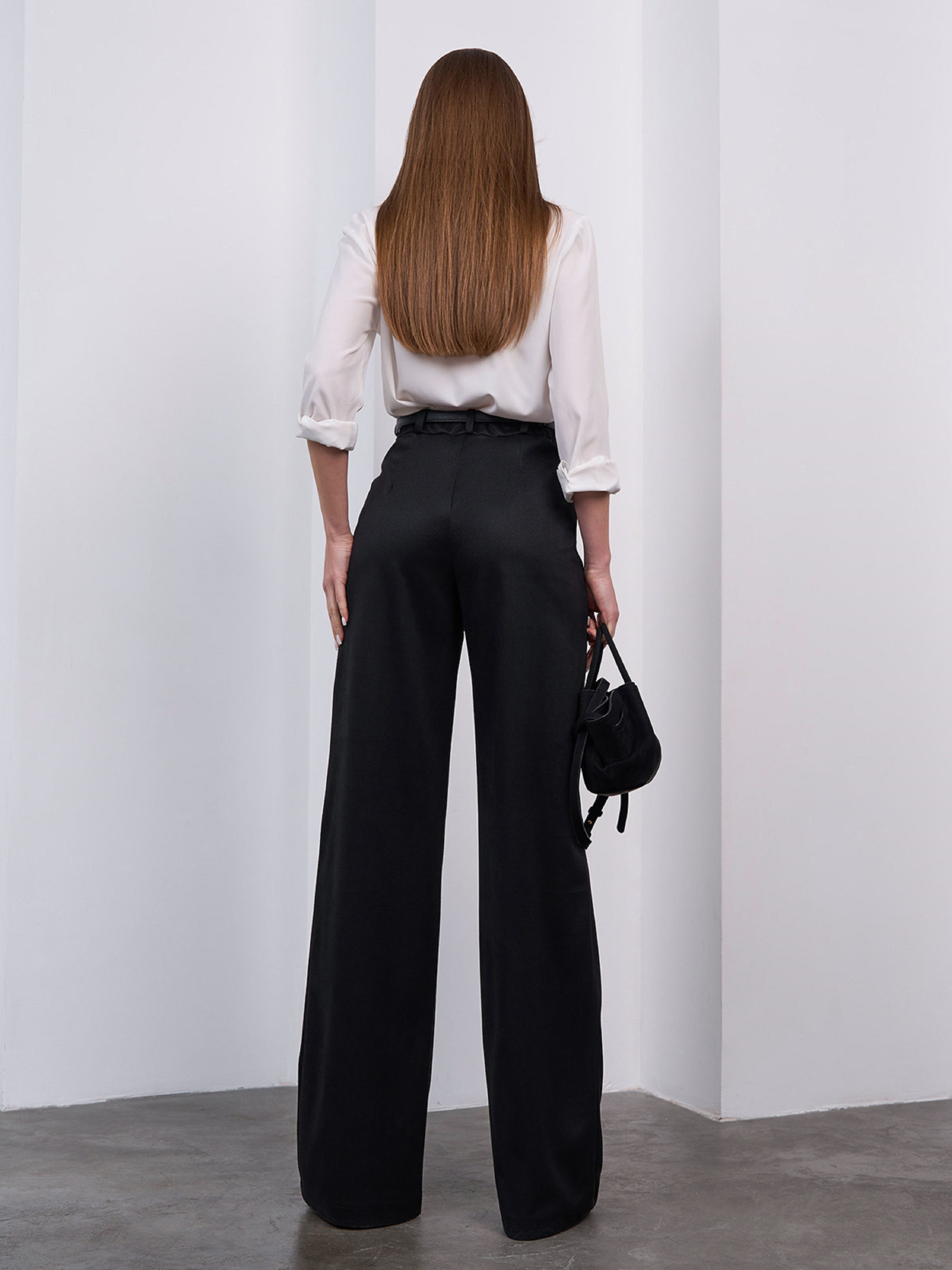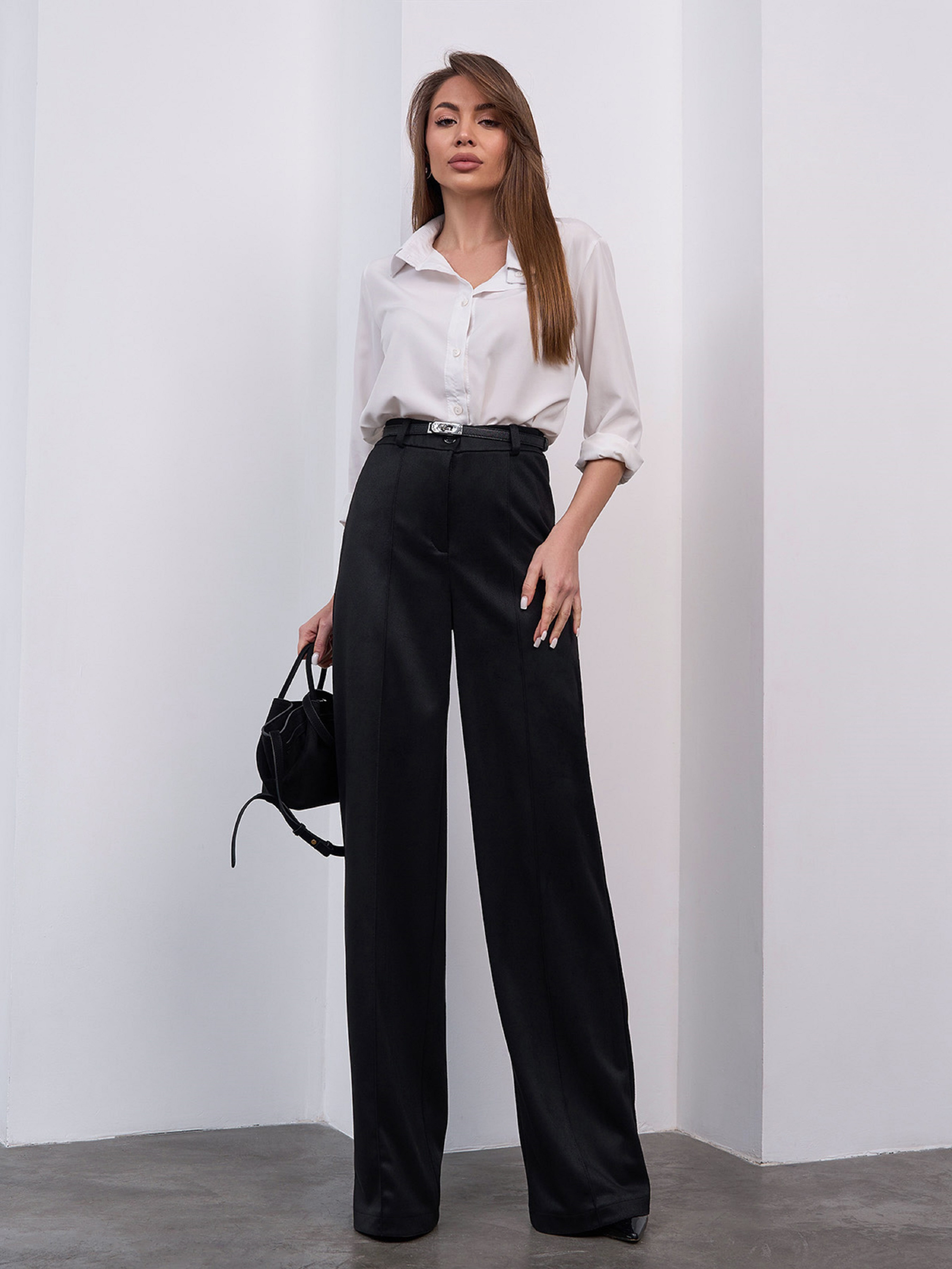 Чорні брюки високої посадки, виконані з однотонної еко-замші та декоровані стрілками. Модель прямого вільного крою з гумкою ззаду на поясі та застібками на блискавку та гудзик. Напівобхват: Талія: S (34), M (36), L (38), XL (40), XXL, (42), 3XL (44), Стегна: S (48), M (50), L (52), XL (54), XXL (56), 3XL (58), Довжина виробу — 110-113*, Довжина по внутрішньому шву — 80, Тканина: Низької еластичності.