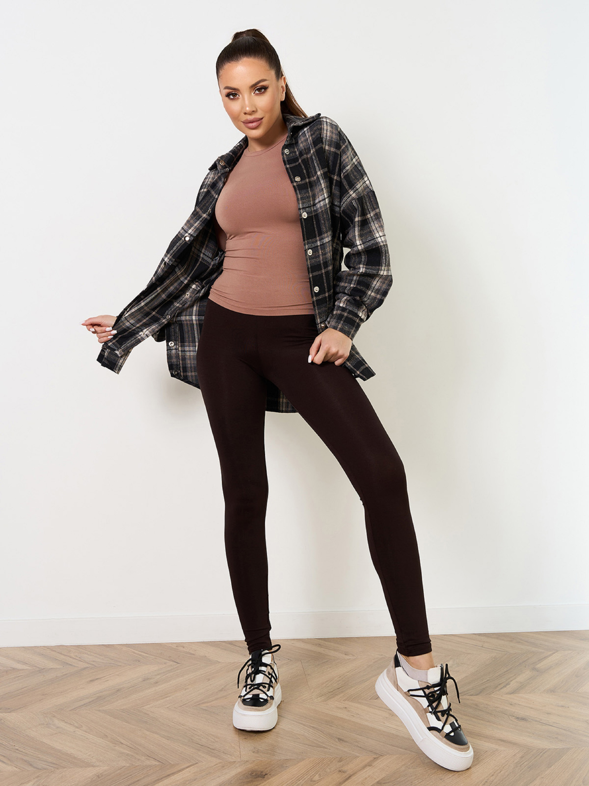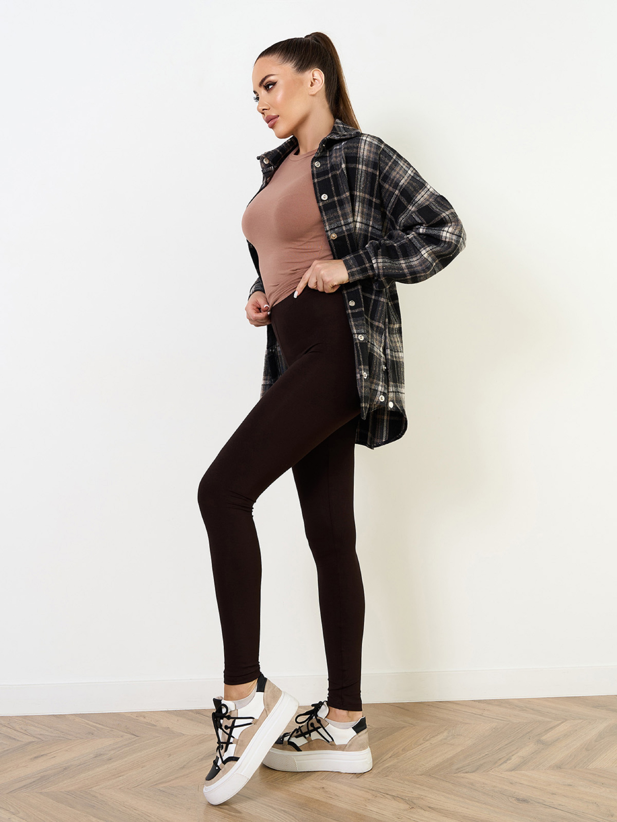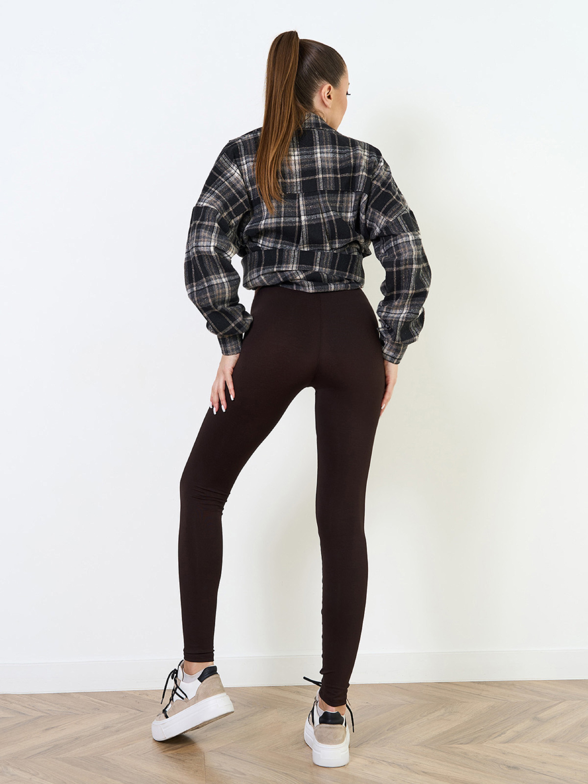 Темно-коричневі легінси з еластичного віскозного трикотажу. Модель облягаючого крою з високою посадкою на талії та поясною гумкою. Напівобхват: Талія: S (28-38), M (30-40), L (32-42), XL (34-44), Стегна: S (39-46), M (42-48), L (44-50), XL (46-52), Довжина виробу - 90, Довжина по внутрішньому шву - 70, Тканина: Високоїй еластичності.