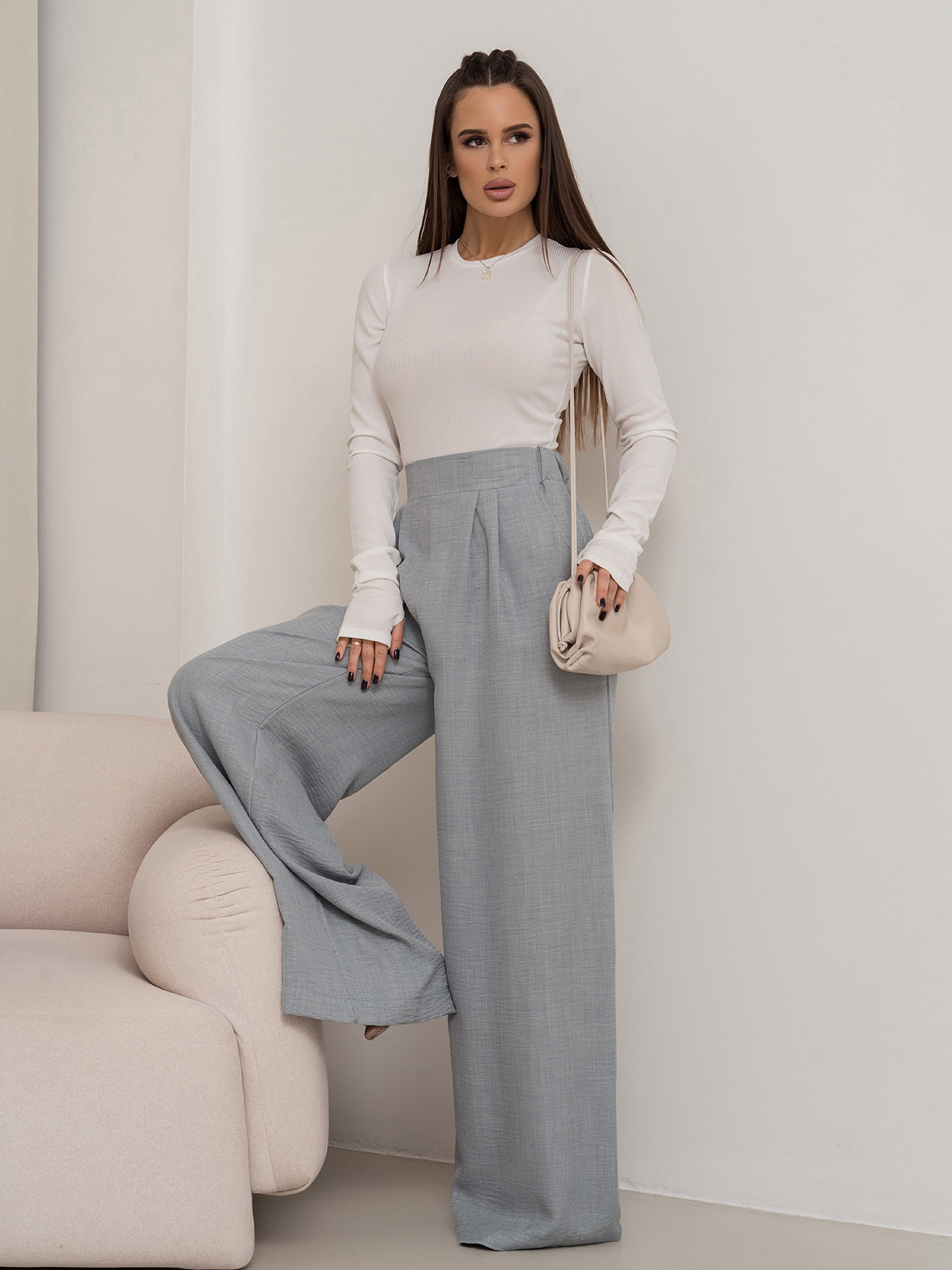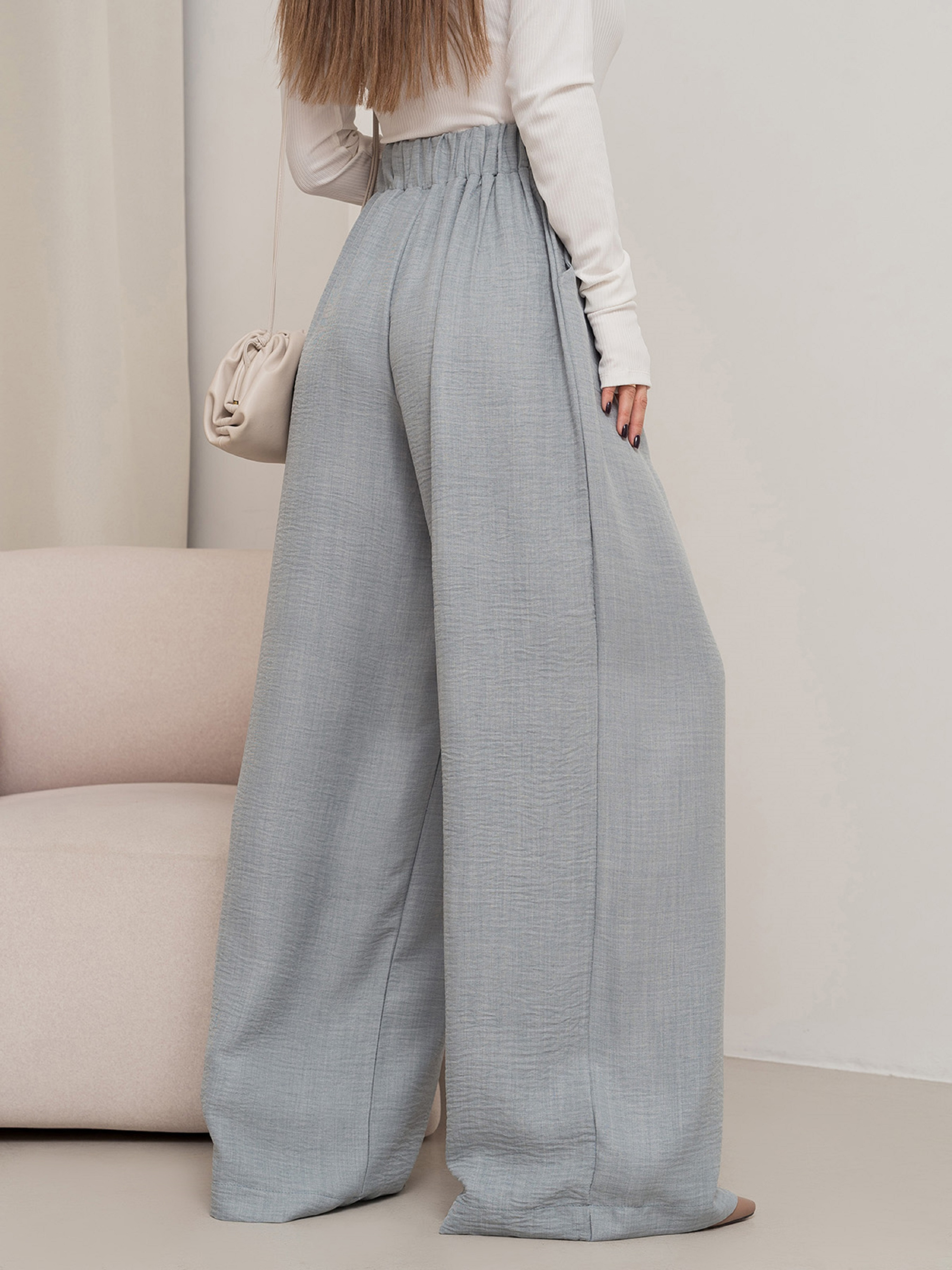 Текстуровані лляні штани палаццо сірого кольору. Штани прямого широкого крою із защипами в районі талії. Модель з кишенями та високою посадкою оснащена поясною задньою гумкою.Напівобхват: Талія: S (32-36), M (34-38), L (36-40), XL (38-42), Стегна: S (56), M (58), L (60), XL (62), Довжина виробу - 110, Довжина внутрішнього шва - 83, Тканина: Низька еластичність.