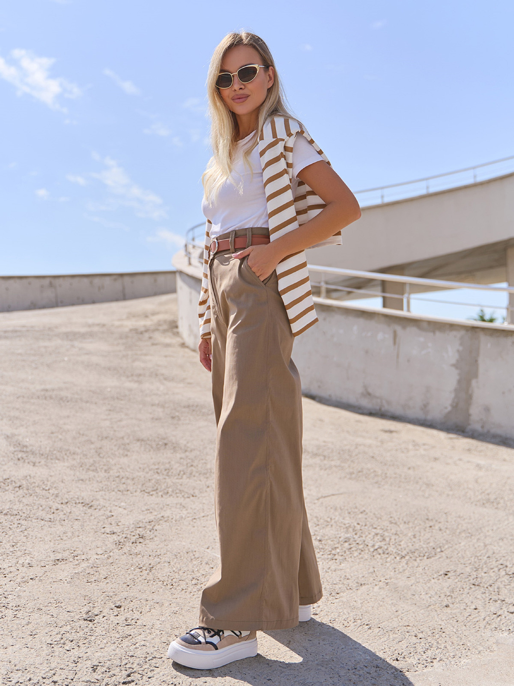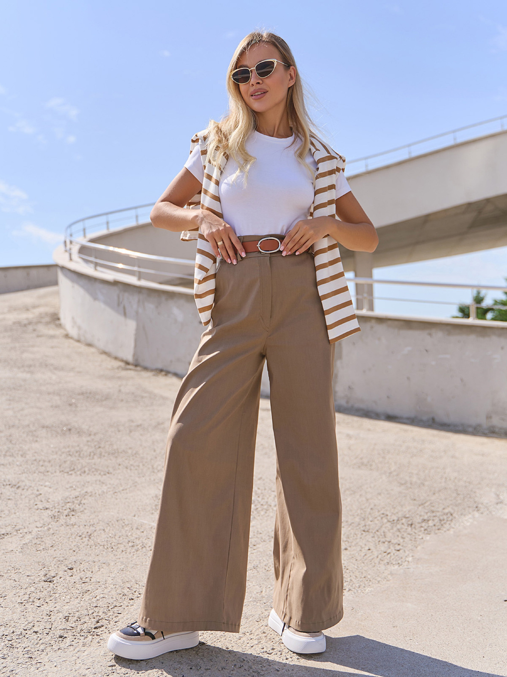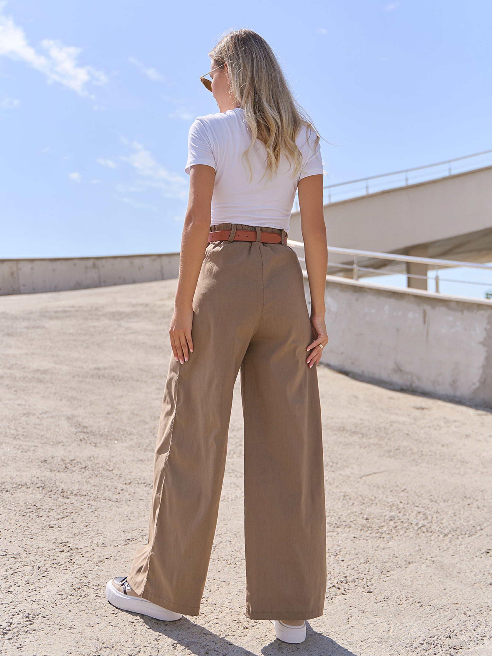 Бежеві повсякденні штани прямого широкого крою з високою посадкою на талії. Модель з кишенями оснащена застібками на гудзики та блискавку, поясними шльовками та гумкою ззаду на поясі. Модель виконана з однотонного джинс-котону. Ремінь у комплект не входить. Напівобхват: Талія: S (34), M (36), L (37), XL (38), Стегна: S (51), M (53), L (55), XL (54), Довжина виробу - 106, Довжина по внутрішньому шву - 73, Тканина: Високої еластичності.