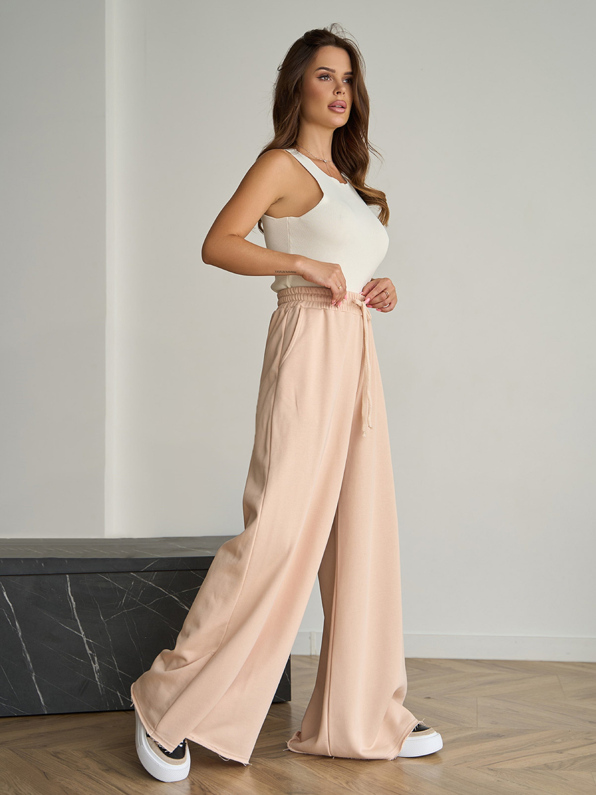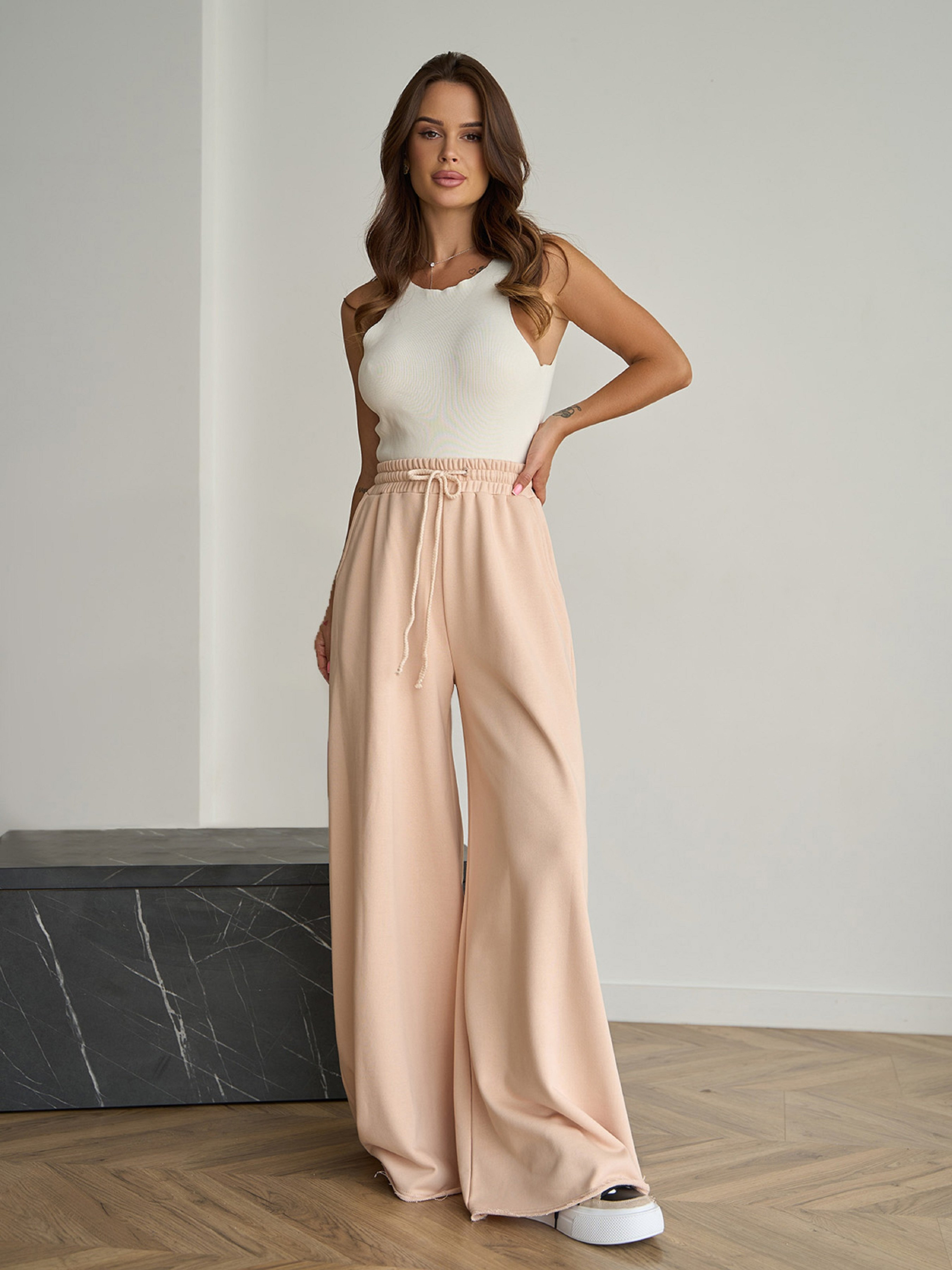 Вільні спортивні штани з трикотажної бежевої трьохнитки з поясною гумкою та шнурівкою. Модель прямого широкого крою з необробленими швами низом та кишенями. Виріб високої посадки. Напівобхват: Талія: S (30-35), M (32-37), L (34-39), XL (36-41), Стегна: S (60), M (62), L (64), XL (66), Довжина виробу - 108, Довжина внутрішнього шва - 78, Тканина: Низька еластичність.