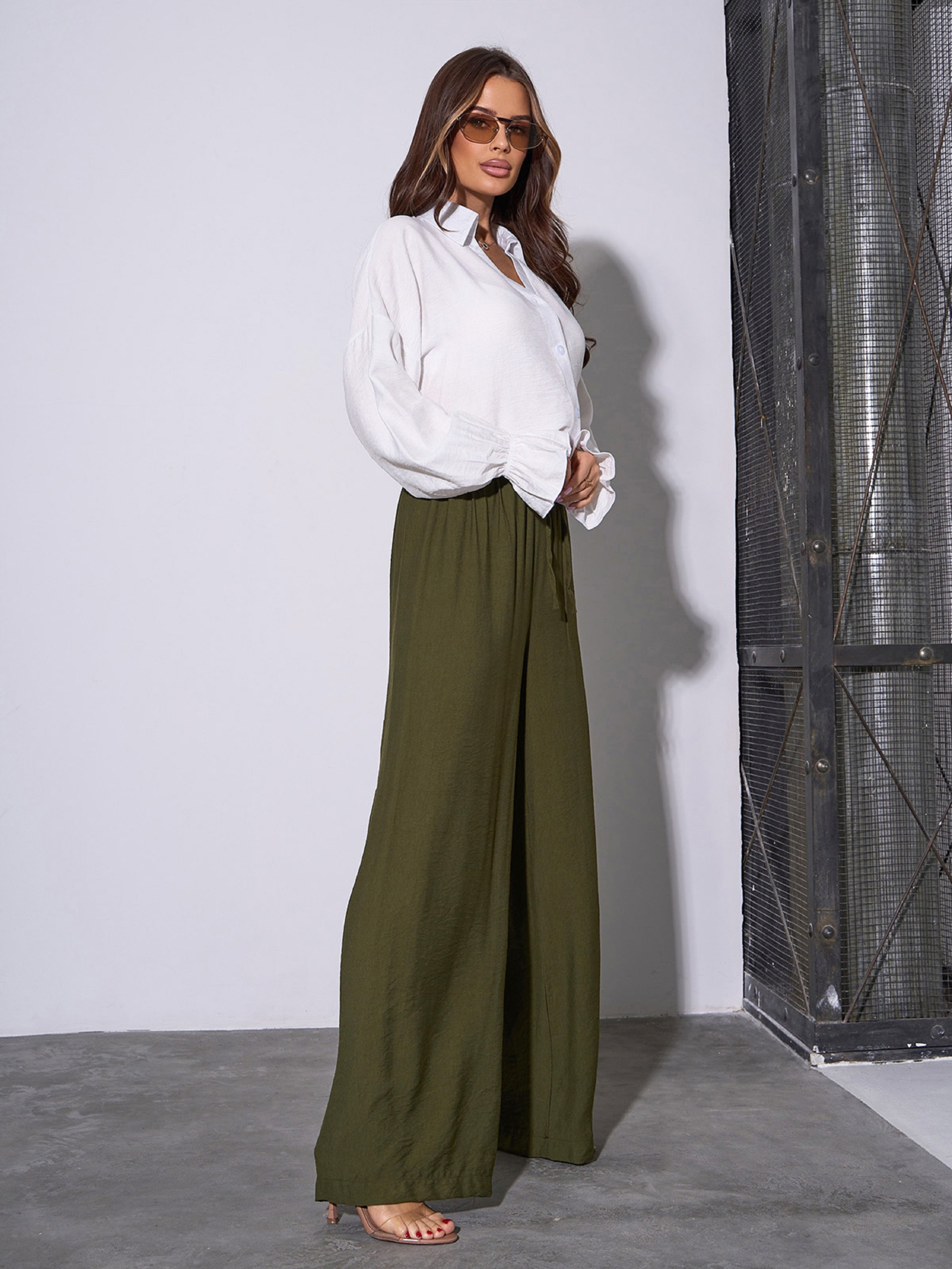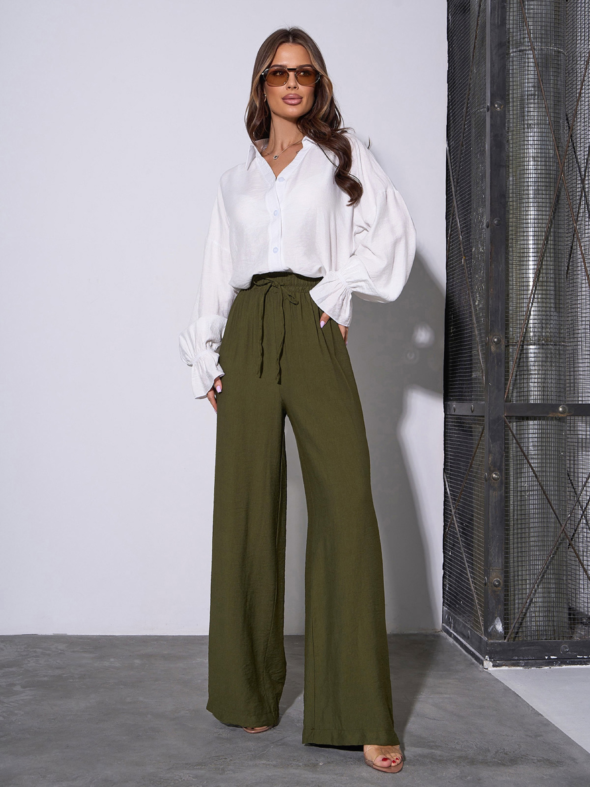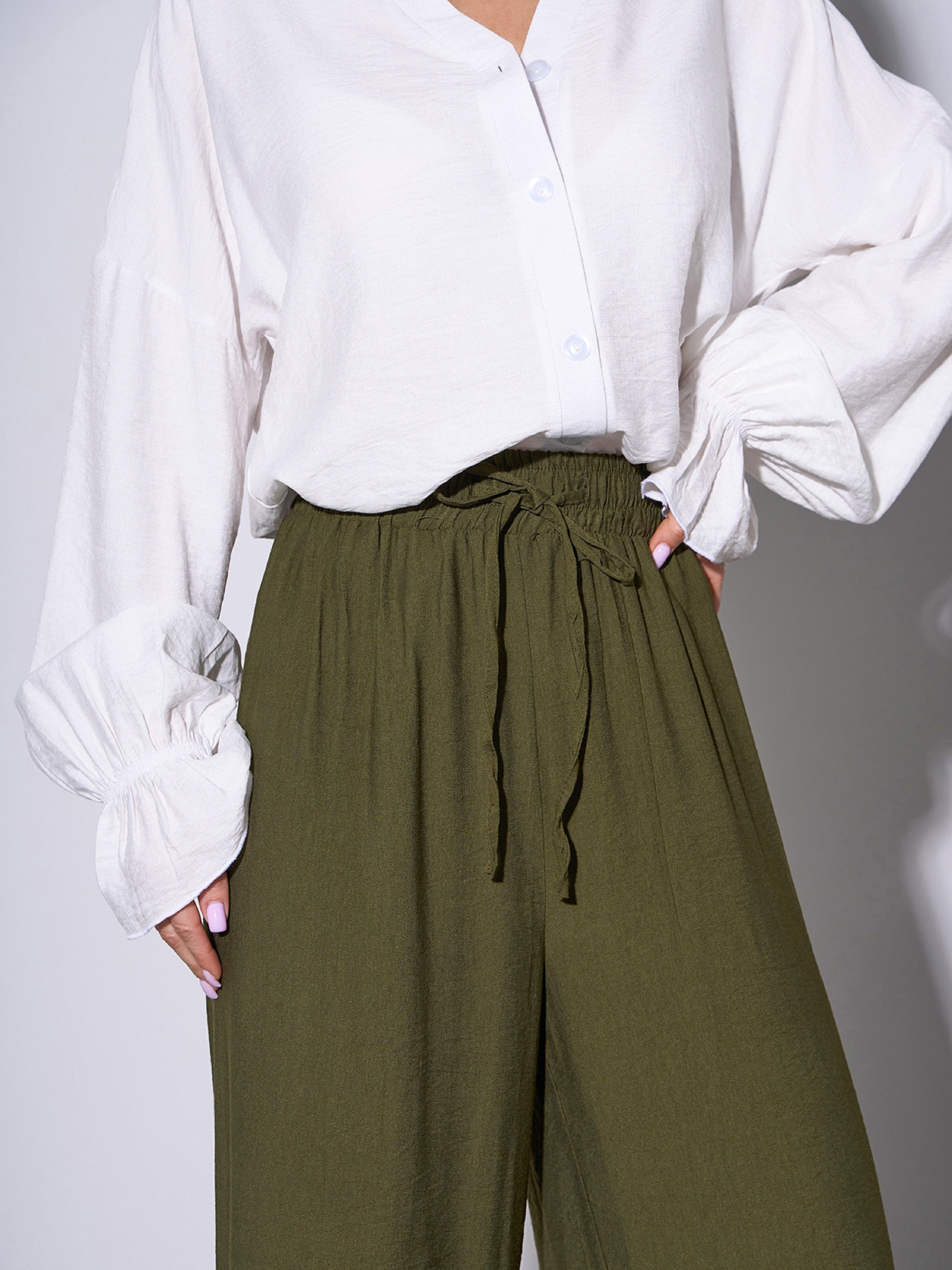 Льняные брюки цвета хаки с эластичной поясной резинкой и шнурком. Модель широкого прямого кроя с высокой посадкой на талии. Полуобхват: Талия: S (31-40), M (33-42), L (35-44), XL (37-46), XXL (39-44), 3XL (41-46), 4XL (42-47), 5XL (44-49), Бедра: S (56), M (58), L (60), XL (62), XXL (64), 3XL (66), 4XL (68), 5XL (70), Длина изделия – 105-110*, Длина по внутреннему шву – 72-77*, Ткань: Низкой эластичности.