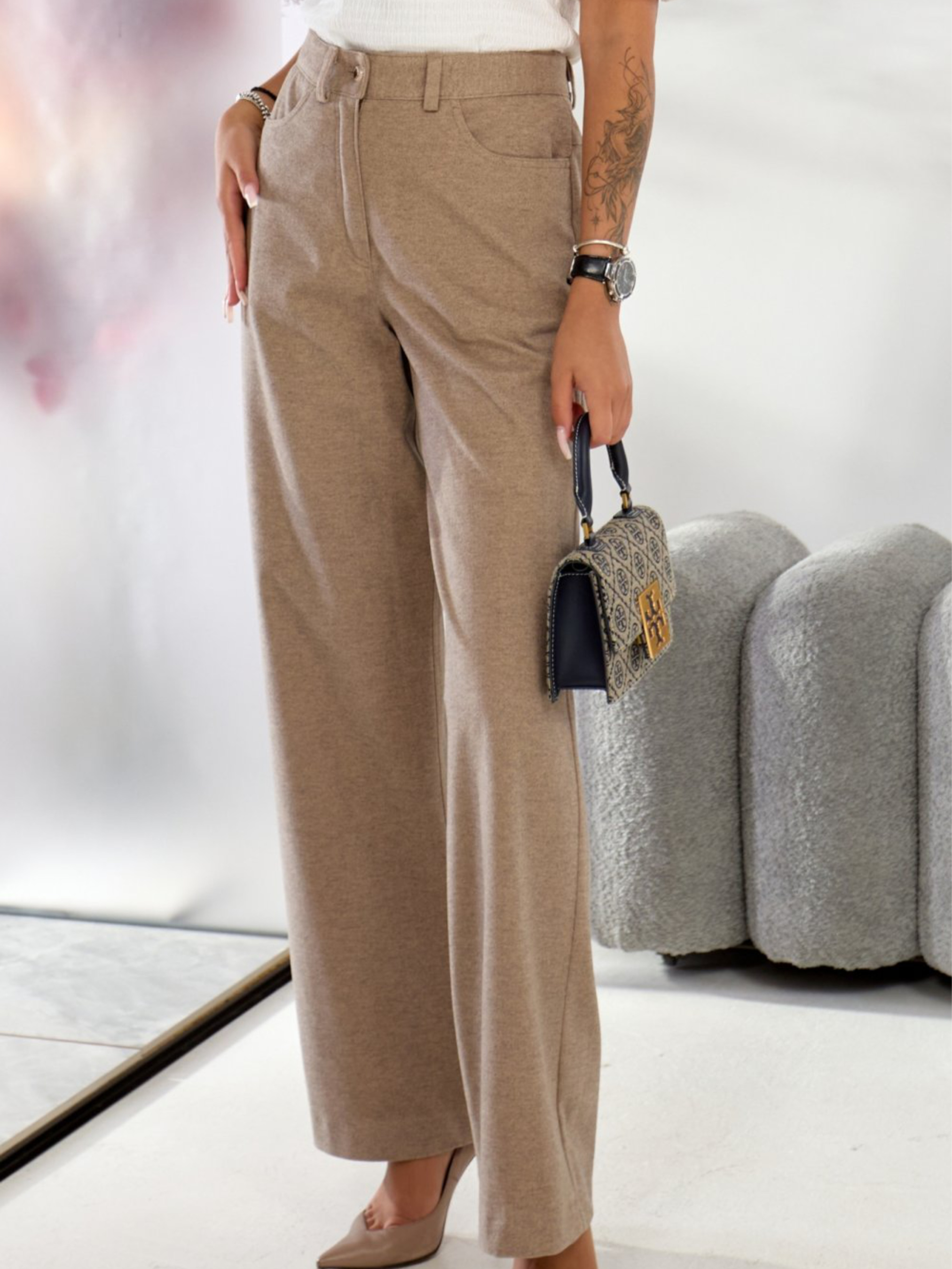 Стильні жіночі теплі брюки прямі від стегна бежевого кольору із вовняної тканини створені для максимального комфорту в холодну пору року. Модель має прямий широкий крій, що пасує фігурі та забезпечує свободу рухів. Спереду штани застібаються на блискавку та ґудзик, оснащені втачним поясом зі шльовками для ременя. Функціональні кишені з боків та накладні кишені ззаду доповнені акуратною кокеткою. Довжина виробу — 103 см. Характеристики Тканина: вовна, утеплена Склад: 57% віскоза, 40% вовна, 3% еластан Еластичність тканини: трохи тягнеться Колір: бежевий Посадка: висока Особливості моделі: з кишенями, прямий крій, широкий крій Блискавка: спереду Візерунок тканини: однотонна Бренд: LadyLike Країна виробник: Україна Догляд • Машинне або ручне прання у делікатному режимі при температурі до 30°C • Прасування при температурі до 110°C • Не використовувати відбілювач • Не сушити в сушильній машині • Допускається хімчистка за допомогою PCE або розчинників на нафтовій основі Ці теплі зимові брюки мають прямий крій від стегна, забезпечуючи комфорт та свободу рухів. Спереду розташована класична застібка на блискавку та ґудзик, з боків — зручні кишені. Ззаду передбачена невелика кокетка та накладні кишені, що додає моделі акуратної посадки. Пояс втачний зі шльовками — можна доповнити ременем за бажанням. Довжина виробу — 103 см.