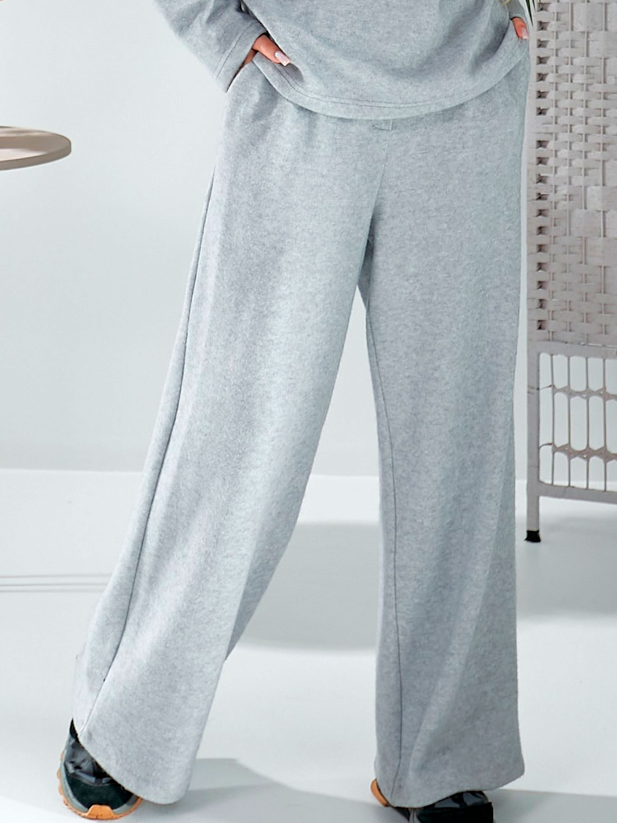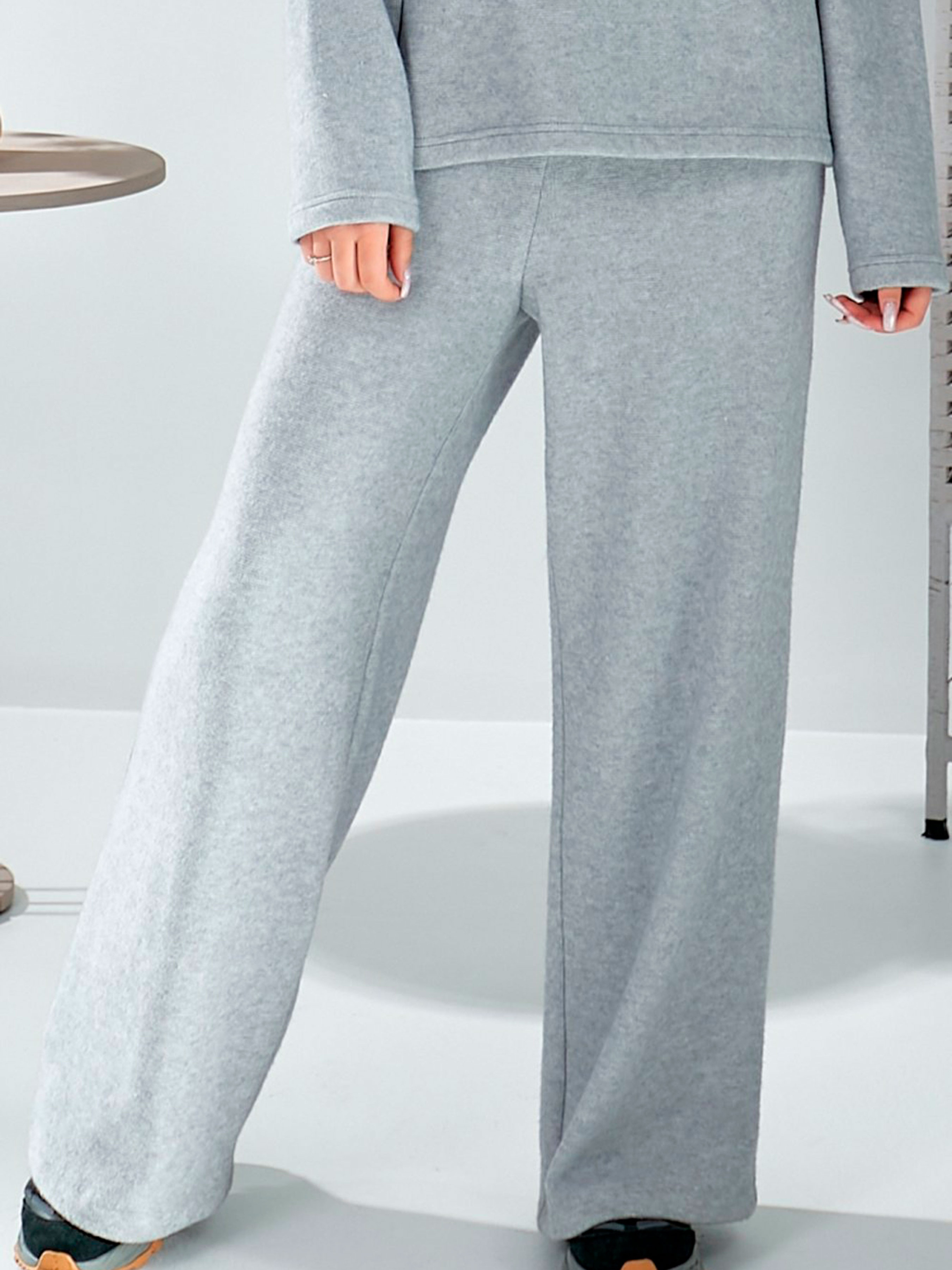 Жіночі трикотажні брюки із ангори — це ідеальне рішення для тих, хто прагне виглядати стильно, не жертвуючи власним комфортом у холодну пору року. Модель виконана в універсальному сірому кольорі, що робить її базовим елементом для гардероба в стилі casual або loungewear. Прямий широкий крій від стегна створює актуальний розслаблений силует, а висока посадка на м'якій гумці забезпечує ідеальну зручність протягом усього дня. Естетична деталь у вигляді гульфіка-обманки додає штанам вигляду класичних брюк, зберігаючи при цьому всі переваги затишного трикотажу. Матеріал: Утеплений трикотаж ангора (Warm & Soft Touch) Преміальний склад (30% вовна, 40% бавовна): Завдяки поєднанню натуральної вовни та бавовни, штани мають високі теплоізоляційні властивості. Вони надійно зігрівають у морози, дозволяючи шкірі дихати. Ніжність віскози (25%): Віскоза робить ангору надзвичайно приємною до тіла, прибираючи зайву колючість вовни та додаючи тканині м'якості. Відмінна еластичність (5% еластан): Матеріал добре тягнеться, що гарантує свободу рухів та відсутність деформації на колінах навіть при тривалому носінні. Елегантний силует: Довжина 110 см у поєднанні з широким кроєм візуально витягує ноги, створюючи ефектний образ як із взуттям на низькому ходу, так і з платформою. Практичні деталі: Дві зручні прорізні кишені по боках додають моделі функціональності. Виробництво Україна: Якісне трикотажне плетіння та надійна фіксація поясної гумки від національного виробника. Характеристики Колір: Сірий (Melange Grey) Матеріал: Утеплений трикотаж ангора Склад: 30% вовна, 40% бавовна, 25% віскоза, 5% еластан Довжина: 110 см (по зовнішньому шву) Посадка: Висока (на гумці) Фасон: Прямі широкі (wide leg) Кишені: Дві прорізні по боках Еластичність: Добре тягнеться Країна виробник: Україна З чим поєднувати сірі штани з ангори? Ці штани стануть основою вашого улюбленого костюма або самостійним акцентом: Затишний монохром: Створіть ідеальний комплект із сірою ангоровою тунікою з коміром-хомутом. Sport Chic: Поєднуйте з сірою кофтою з ангори на блискавці та кросівками або масивними черевиками. Contrast Look: Одягайте з білим трикотажним гольфом та улюбленим вовняним пальто. Home Luxury: Носіть із м'яким кашеміровим джемпером для максимального затишку вдома або на відпочинку за містом. Рекомендації з догляду Прання: Тільки делікатний або ручний режим при температурі не вище 30°C. Вивертайте штани навиворіт перед пранням. Засоби: Використовуйте спеціальні рідкі гелі для вовни та делікатних тканин. Уникайте відбілювачів. Сушіння: Сушити тільки в розправленому вигляді на горизонтальній поверхні. Уникайте підвішування на прищіпки, щоб не деформувати пояс та край штанин. Прасування: Замість праски краще використовувати вертикальний відпарювач на низькій потужності, щоб зберегти пухнасту фактуру ангори.