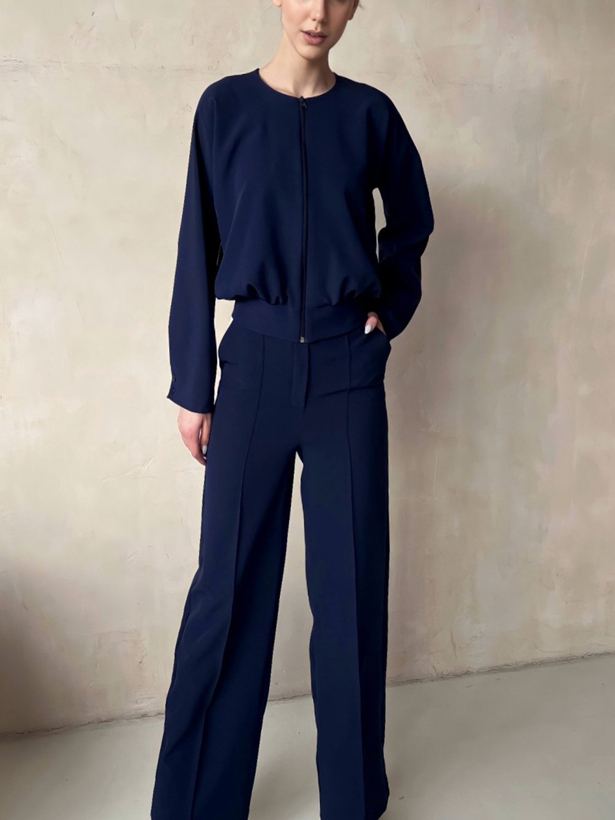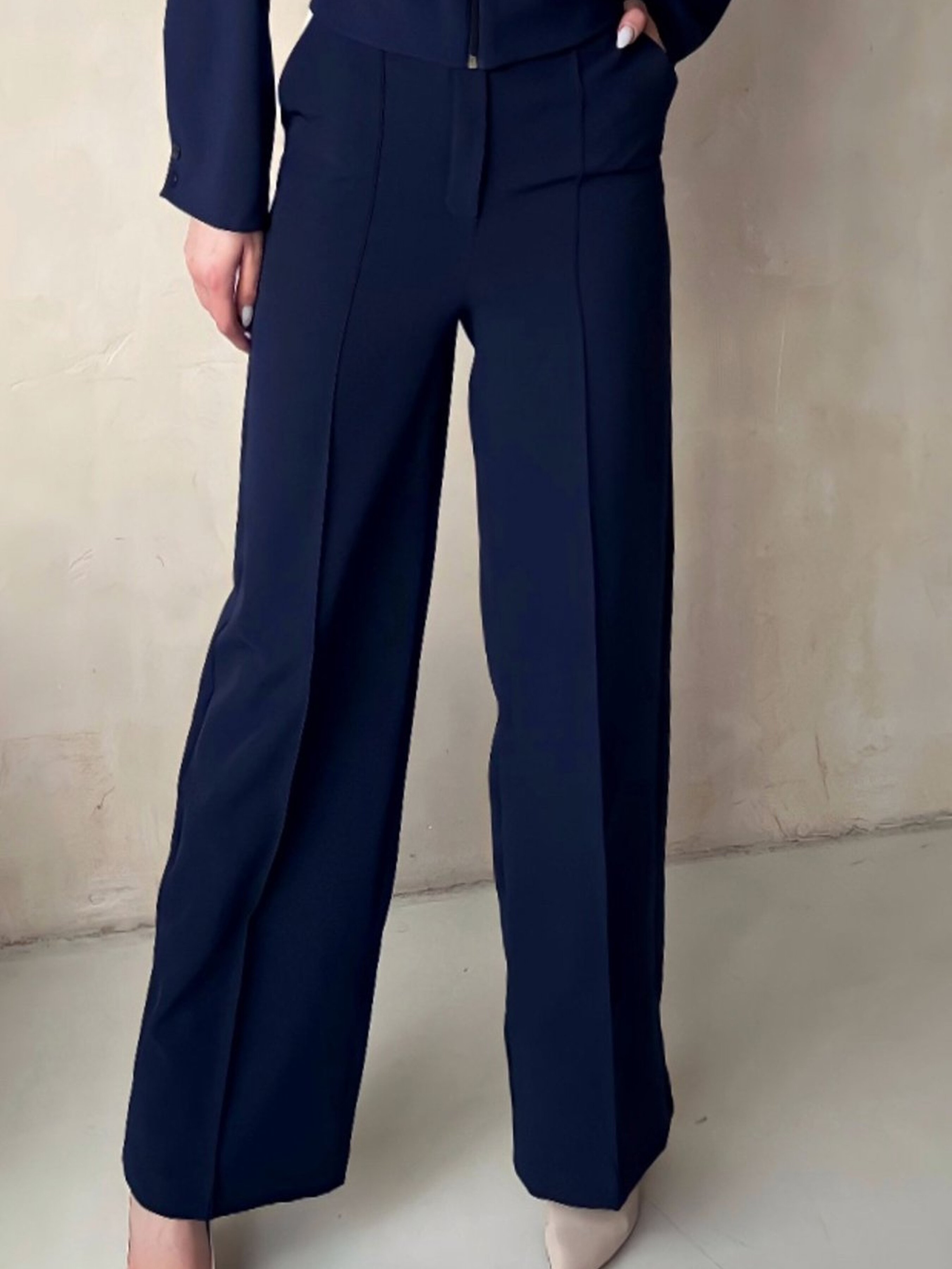 Жіночі сині брюки з кишенями, широким кроєм, на резинці Ці сині брюки з широким кроєм і кишенями — ідеальний вибір для тих, хто шукає комфорт і стиль в одному виробі. Широкий крій забезпечує вільний, але елегантний силует, а резинка на талії дарує зручність і підтримку протягом усього дня. Кишені додають функціональності та стильного акценту. Синій колір є класичним і універсальним, що дозволяє легко комбінувати брюки з різними топами та аксесуарами. Особливості: Широкий крій: створює елегантний і розслаблений вигляд, підходить для різних типів фігури. Синій колір: універсальний і стильний відтінок, який легко комбінується з іншими кольорами. Резинка на талії: забезпечує комфортну посадку і зручність носіння. Кишені: зручні для зберігання дрібниць. Молнія: зручна застібка для легкості носіння. Рекомендації по стилізації: Для розслабленого образу носіть ці брюки з футболкою або топом і кедами чи сандалями. Для більш елегантного вигляду поєднуйте їх з блузою або жакетом і туфлями на підборах. Завершіть образ стильними аксесуарами, такими як сумка або ремінь. Ці сині брюки з широким кроєм і кишенями — відмінний вибір для тих, хто хоче виглядати стильно і зручно в будь-якій ситуації.