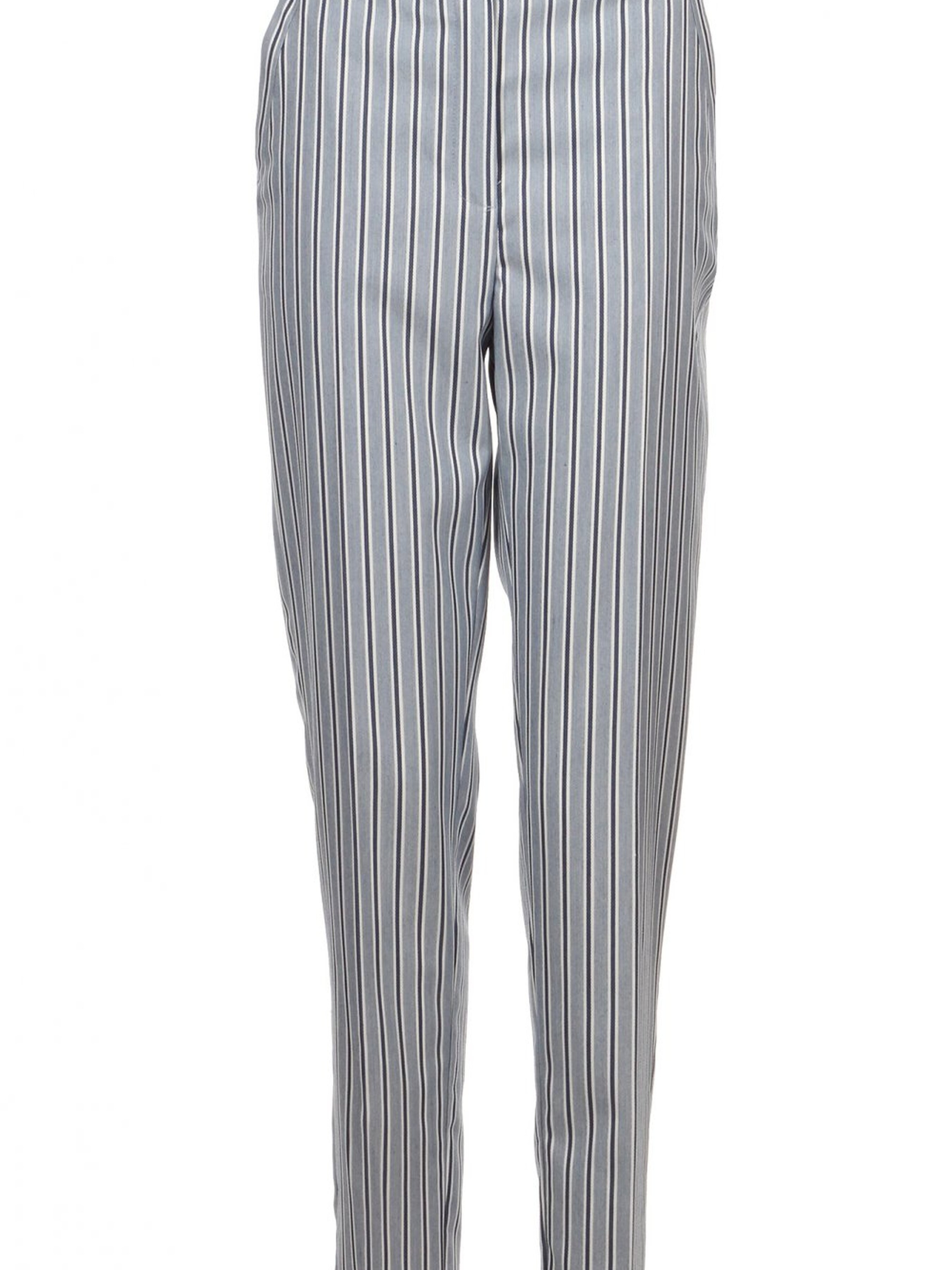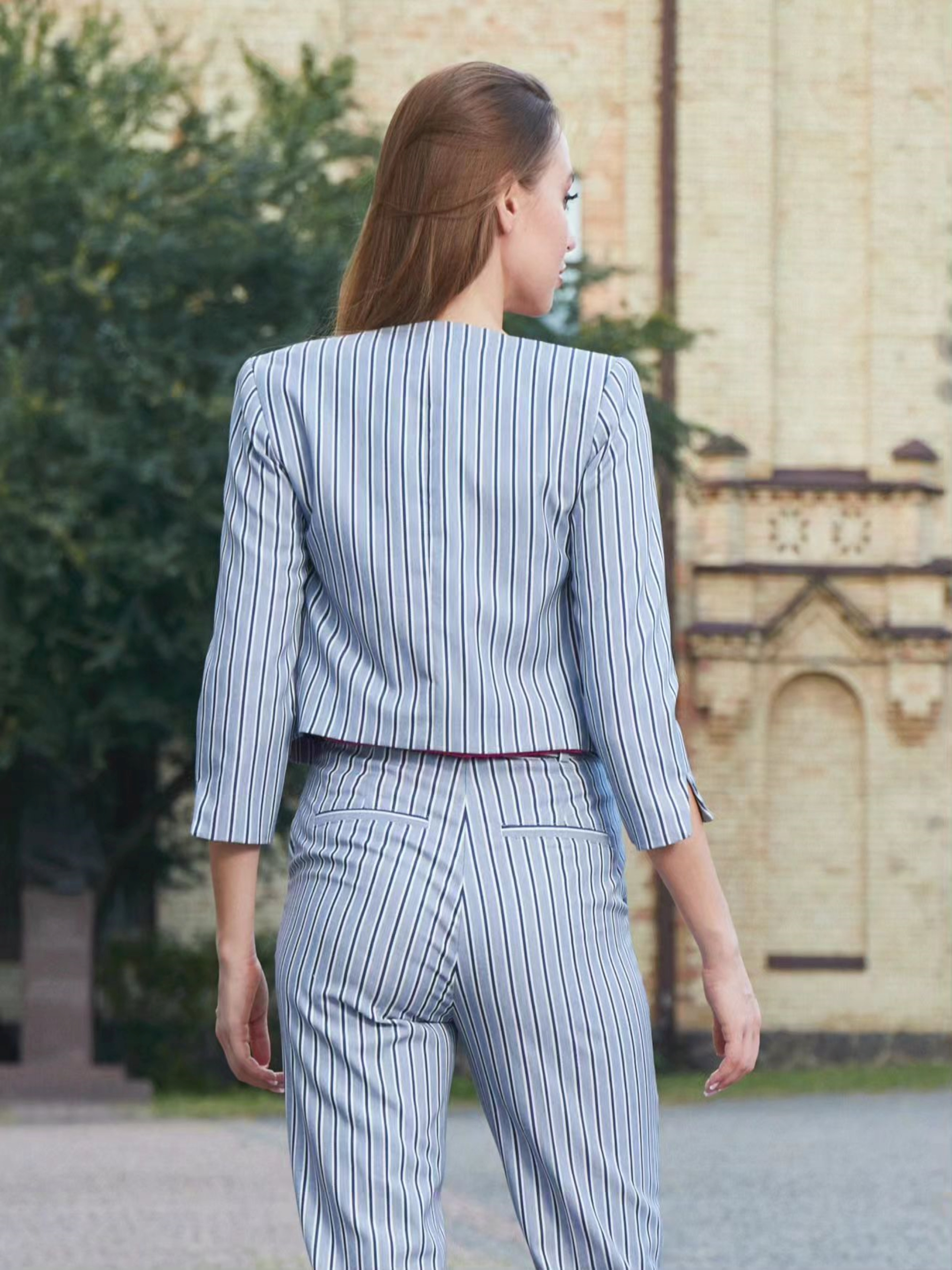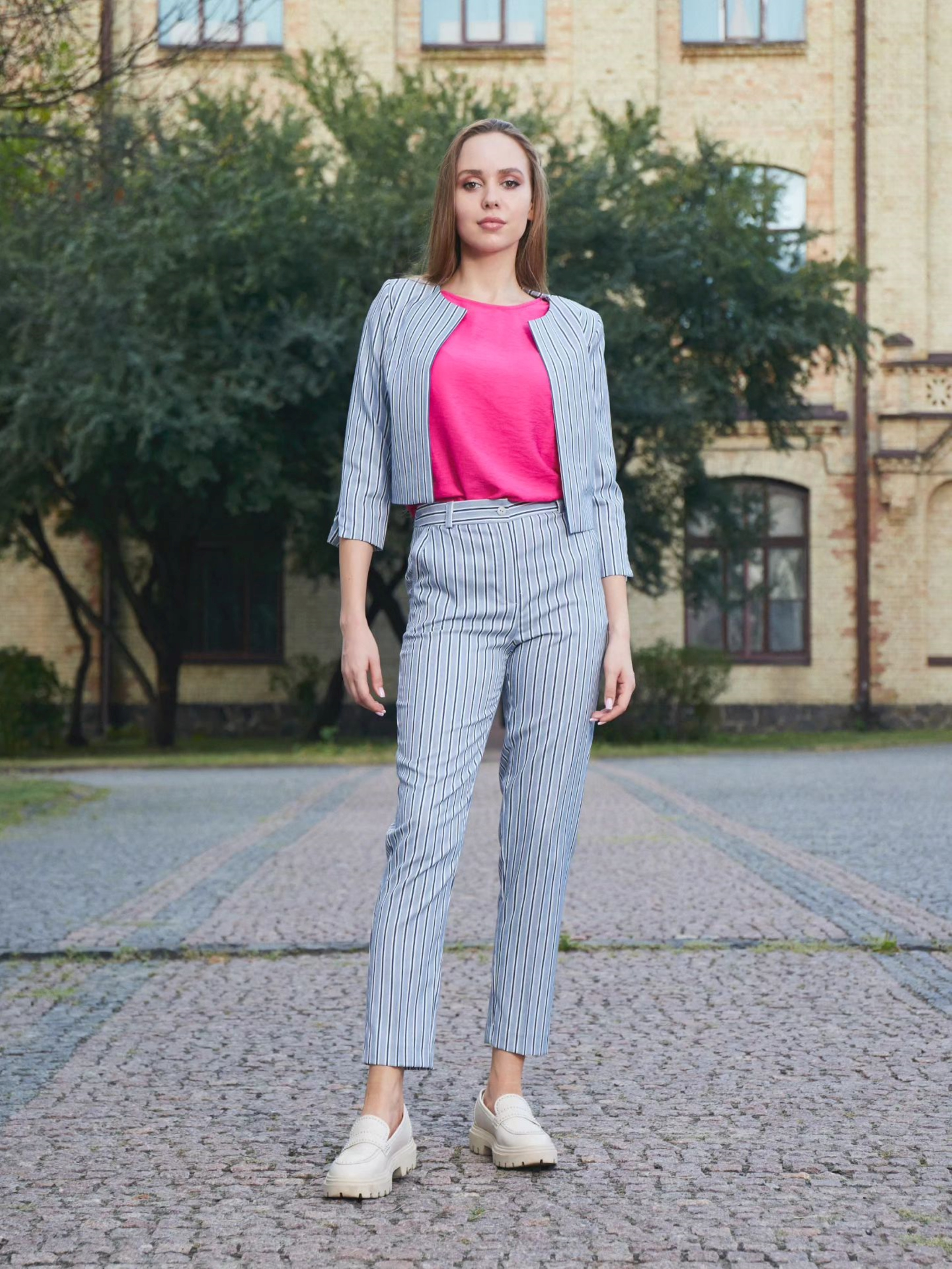 Жіночі блакитні брюки в смужку з кишенями, прямий крій Ці елегантні жіночі брюки в блакитну смужку — ідеальний вибір для тих, хто хоче виглядати стильно і відчувати себе комфортно в будь-якій ситуації. Прямий крій надає класичного вигляду, а смужка додає нотку динамічності та вишуканості. Брюки оснащені зручними кишенями та застібаються на молнію, що забезпечує зручність і функціональність. Особливості: Прямий крій: класичний і лаконічний силует, що підходить для різних типів фігур. Блакитна смужка: стильний малюнок, який додає брючному комплекту елегантності та візуально подовжує ноги. Кишені: зручні для зберігання дрібниць, практичні і стильні. Молнія: надійна застібка, яка додає ще більшої елегантності. Рекомендації по стилізації: Для офісного стилю комбінуйте ці брюки з білою сорочкою або блузою та класичними туфлями. Для більш розслабленого образу поєднуйте брюки з простим топом або футболкою та кедами або лоферами. Додайте аксесуари, такі як елегантна сумка чи шарф, для завершення вигляду. Ці брюки — чудовий варіант для створення як класичних, так і більш сучасних образів. Вони поєднують стиль і комфорт, що робить їх незамінними у вашому гардеробі.