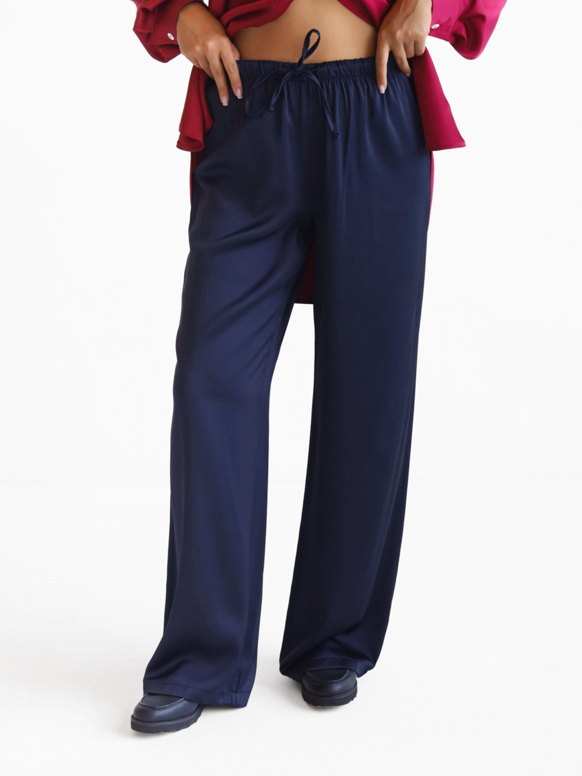 Легкі та хвилясті штани з сатину - must-have для стильного і комфортного образу. Модель виконана з приємної до тіла м'якої тканини, яка гарно лягає по фігурі та дарує відчуття легкості протягом дня. Штани мають вільний крій, еластичний пояс на гумці із зав'язками для зручної посадки. Ідеально комбінуються з базовими футболками, топами, піджаками та кросівками або взуттям на підборах. Підійдуть як для міських прогулянок, так і для домашнього затишку або подорожей.