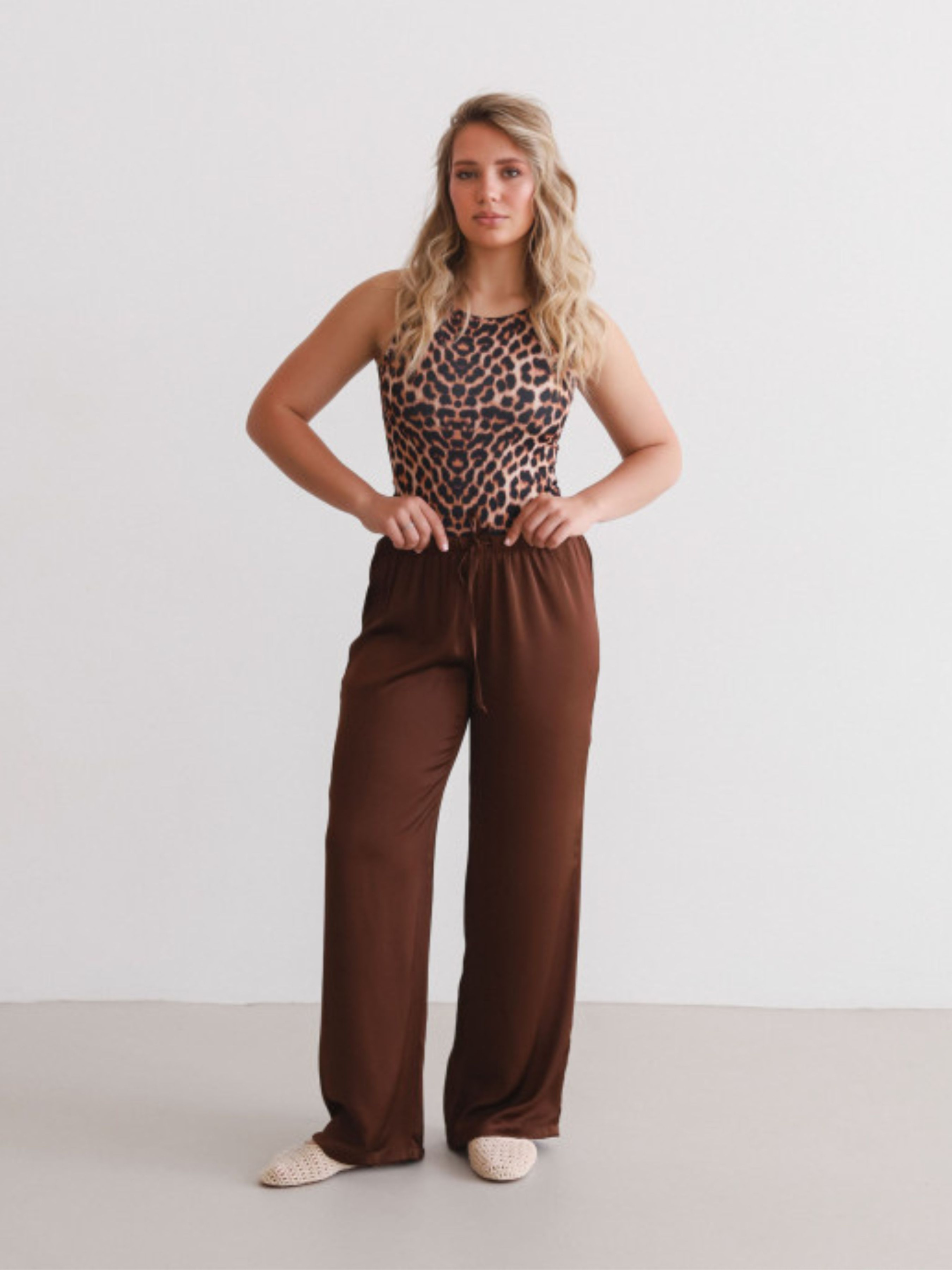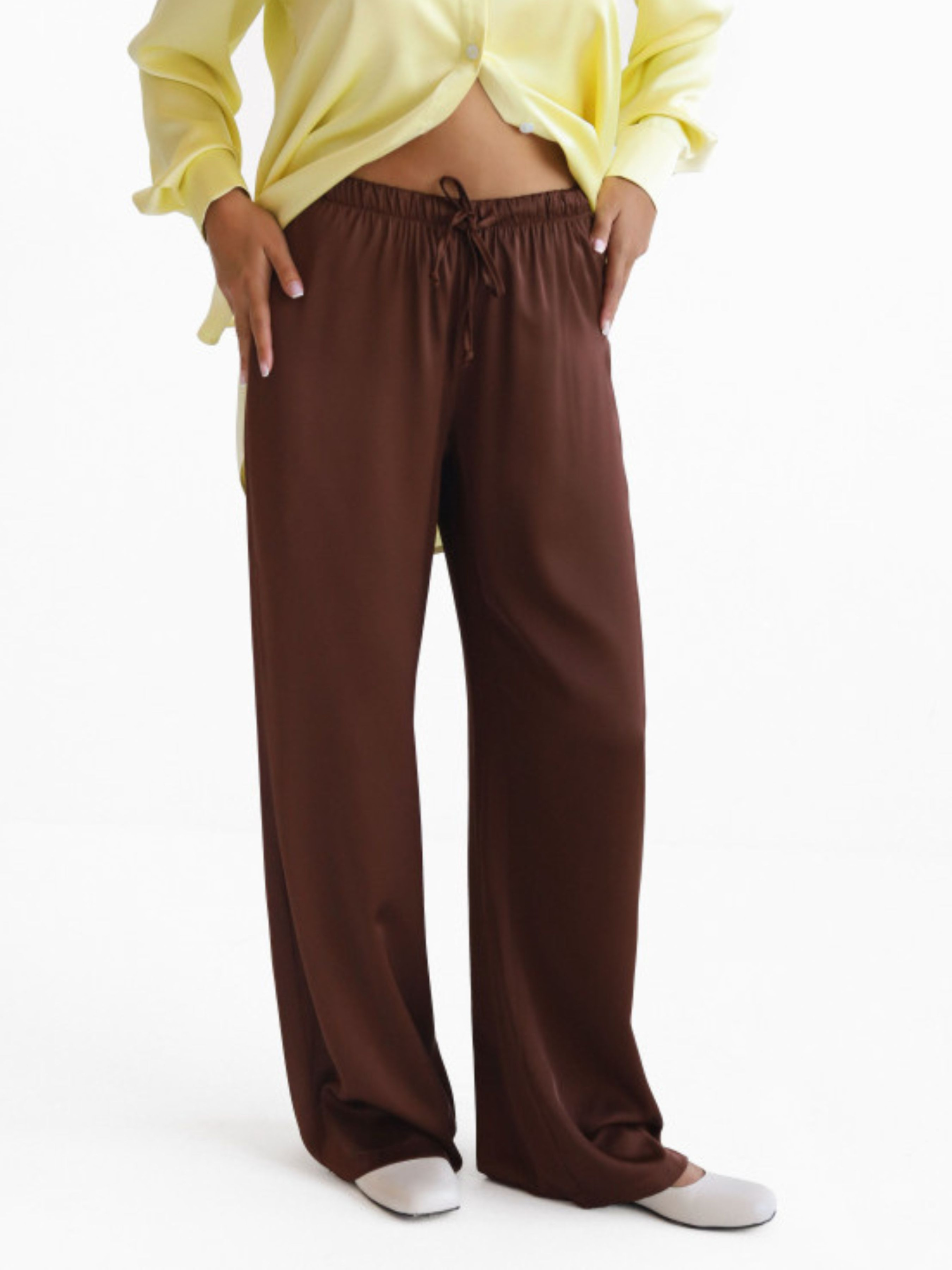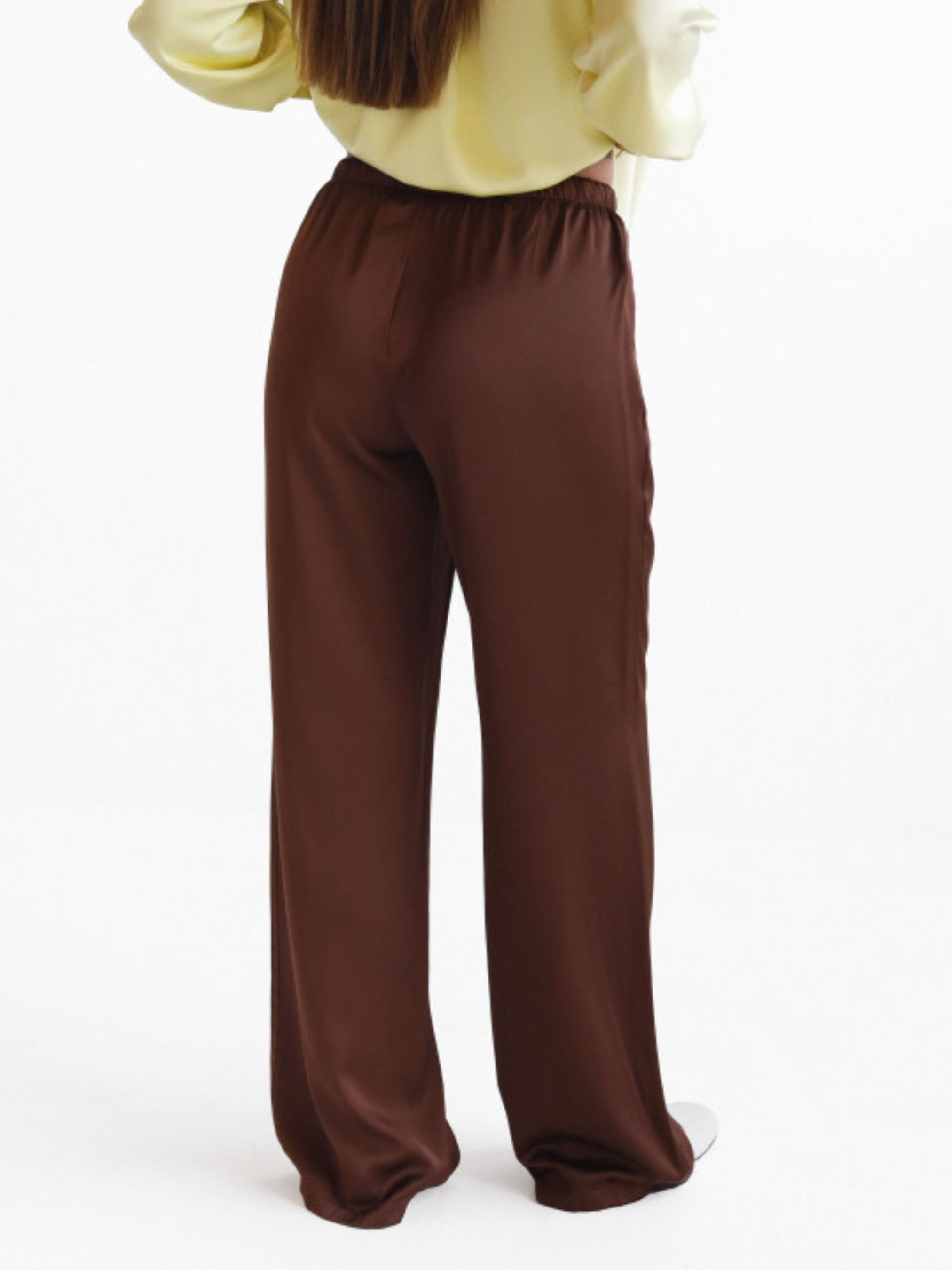 Легкі та хвилясті штани з сатину - must-have для стильного і комфортного образу. Модель виконана з приємної до тіла м'якої тканини, яка гарно лягає по фігурі та дарує відчуття легкості протягом дня. Штани мають вільний крій, еластичний пояс на гумці із зав'язками для зручної посадки. Ідеально комбінуються з базовими футболками, топами, піджаками та кросівками або взуттям на підборах. Підійдуть як для міських прогулянок, так і для домашнього затишку або подорожей.