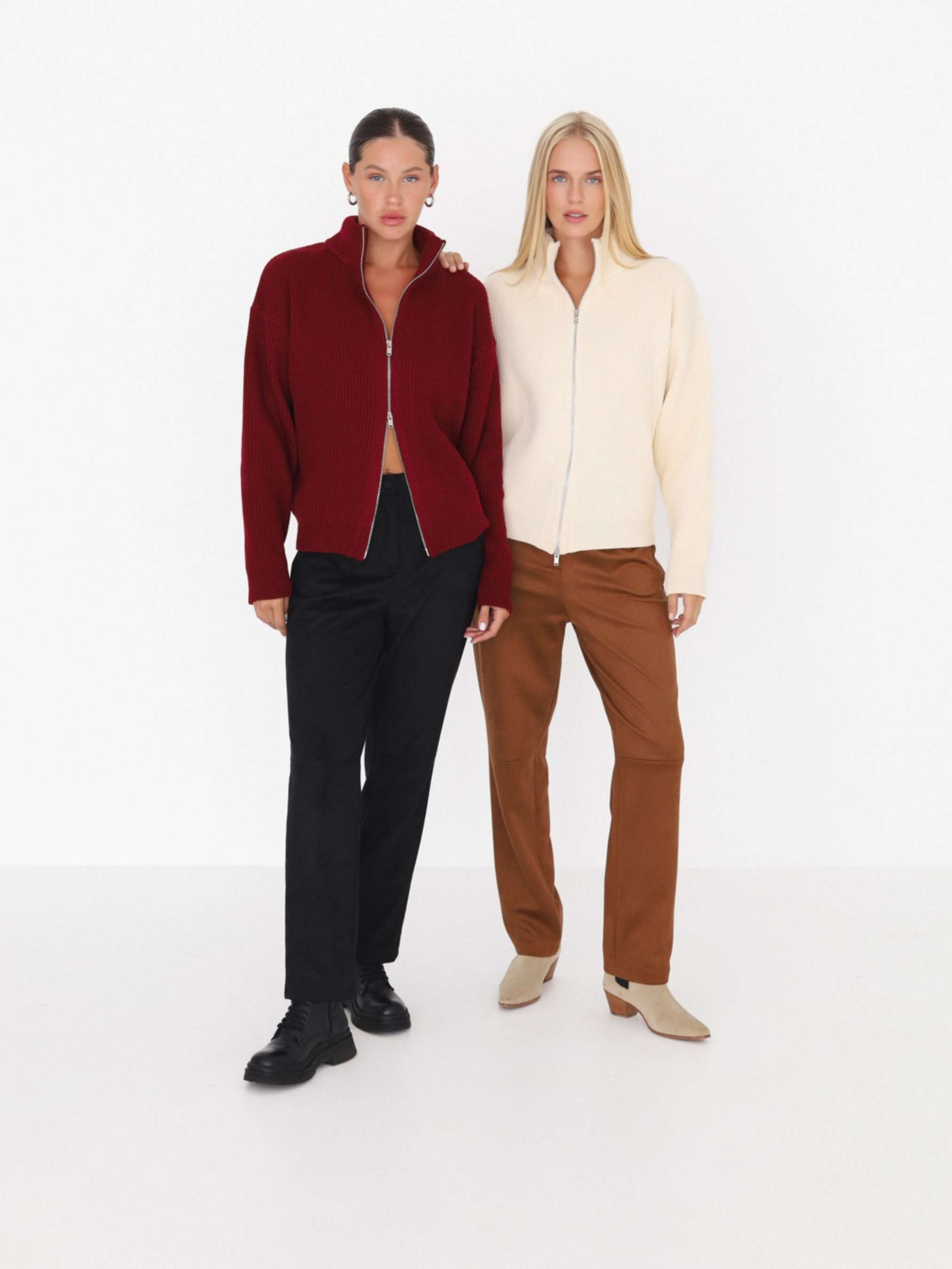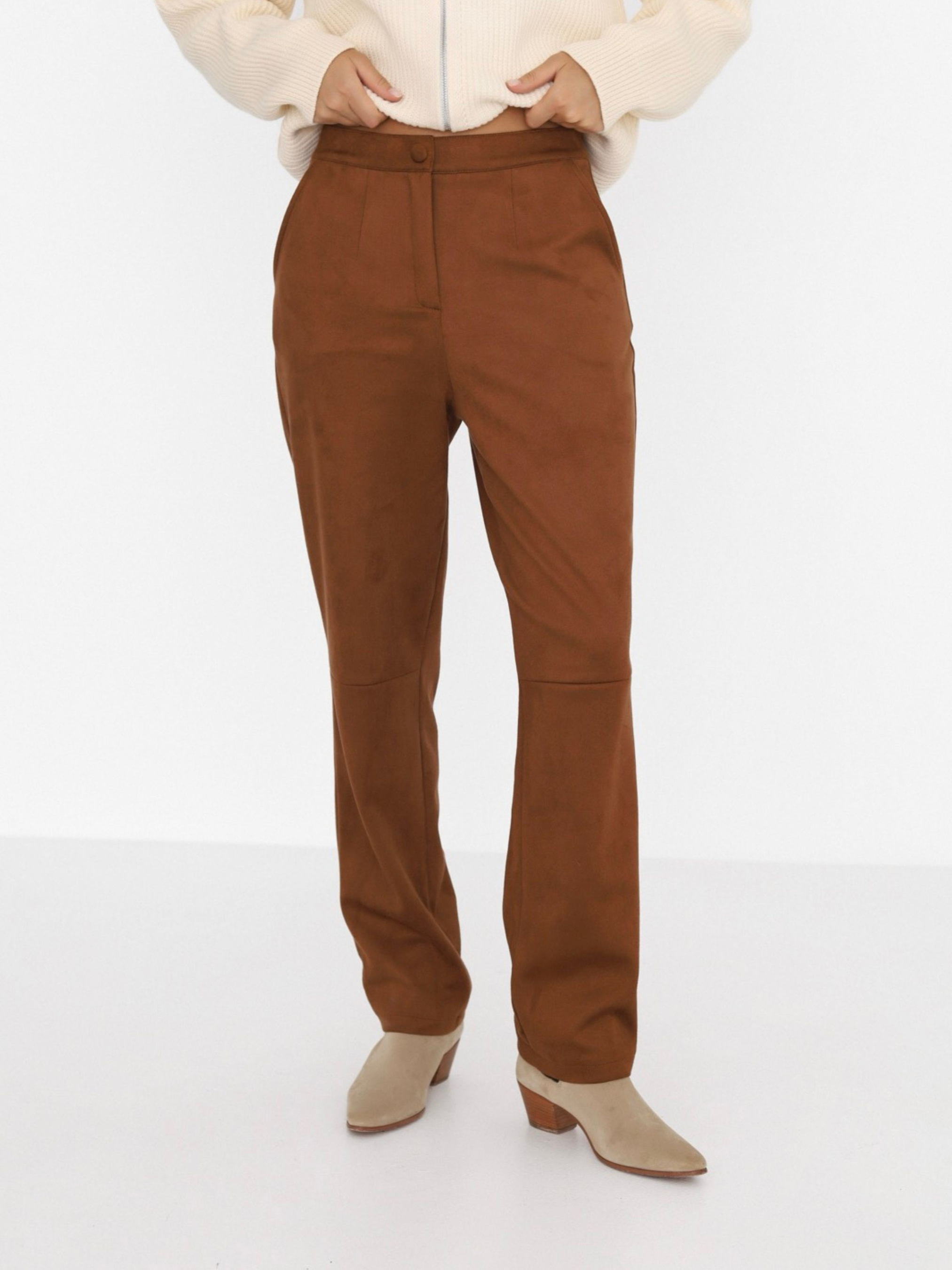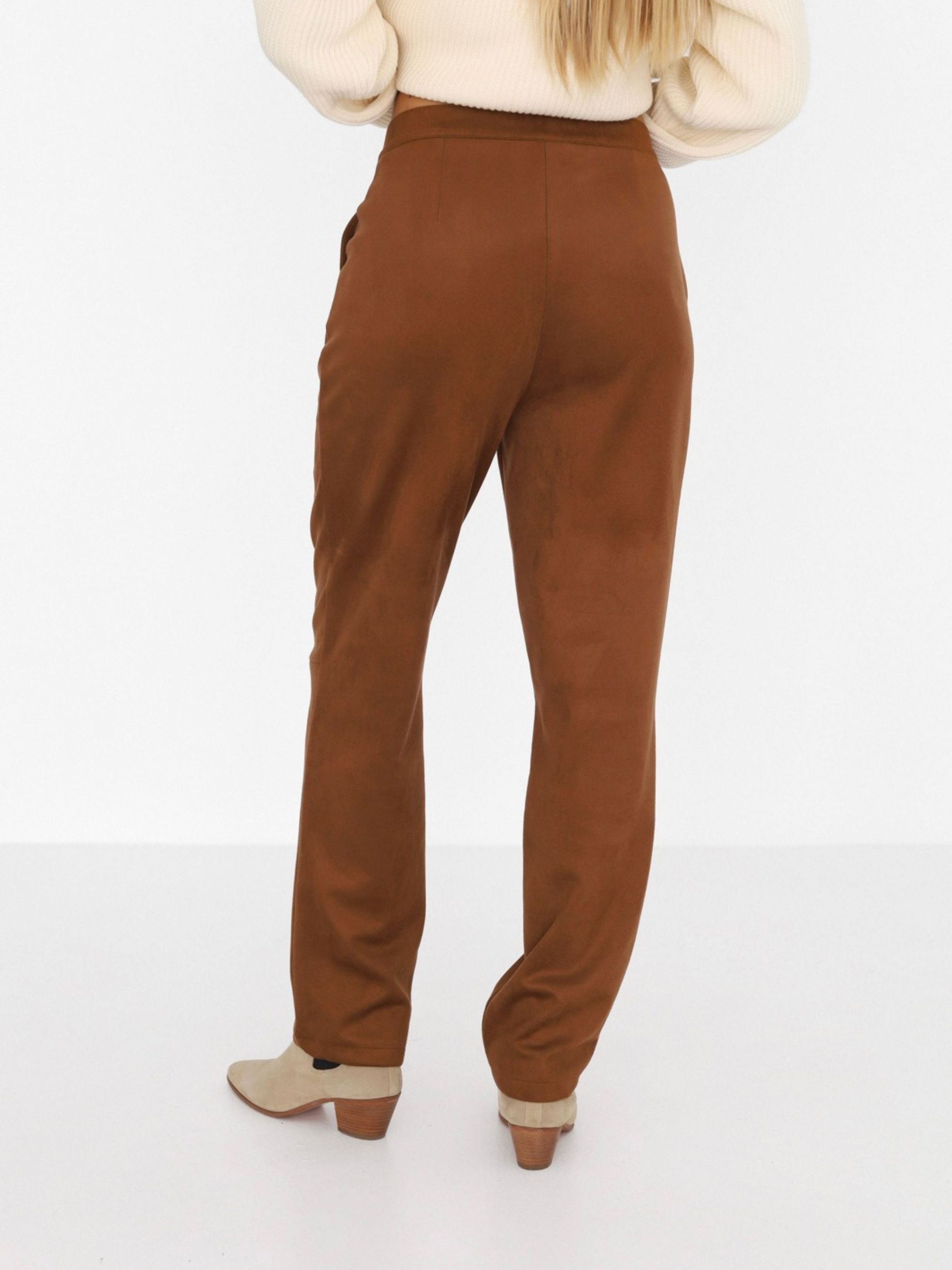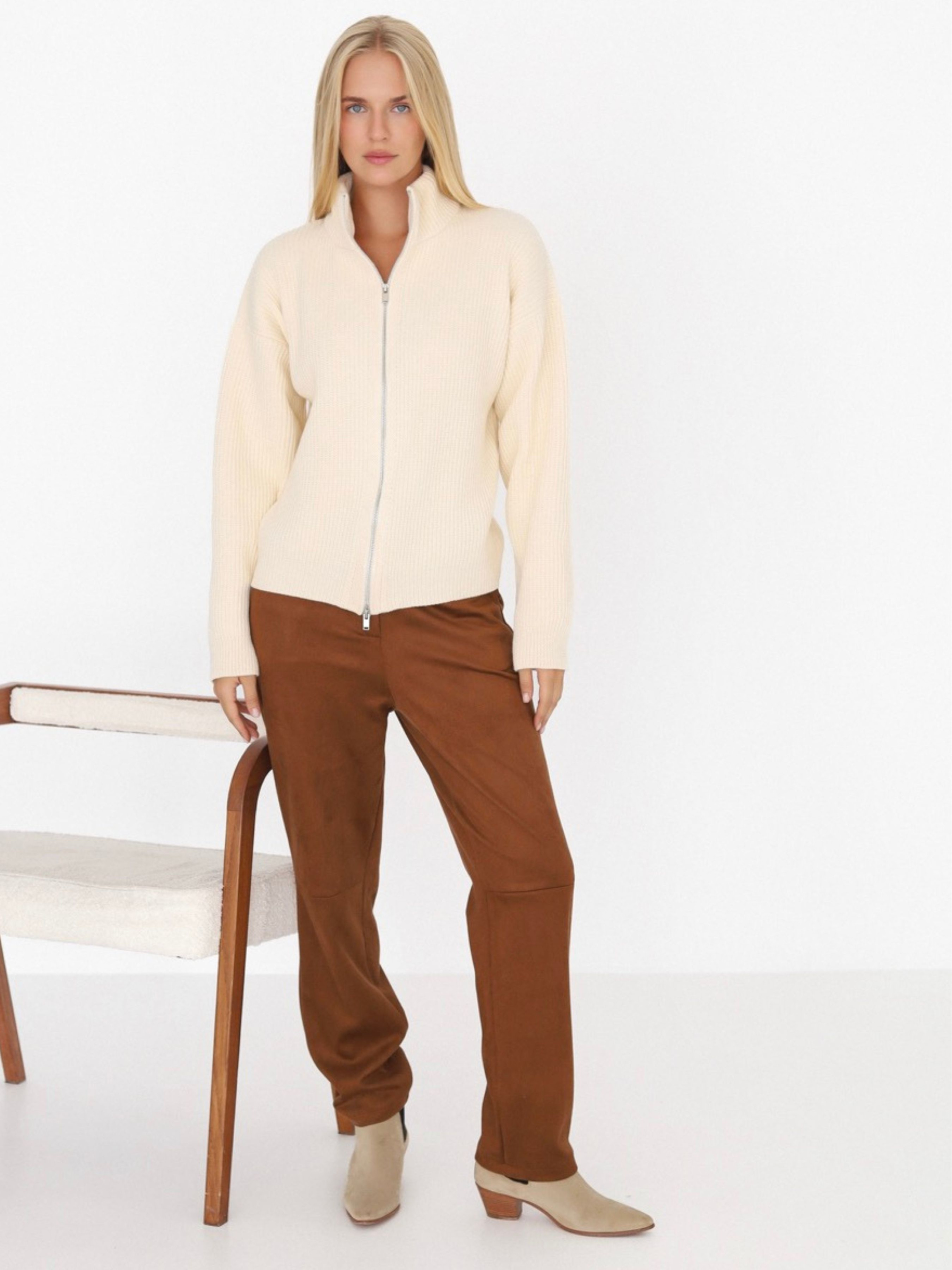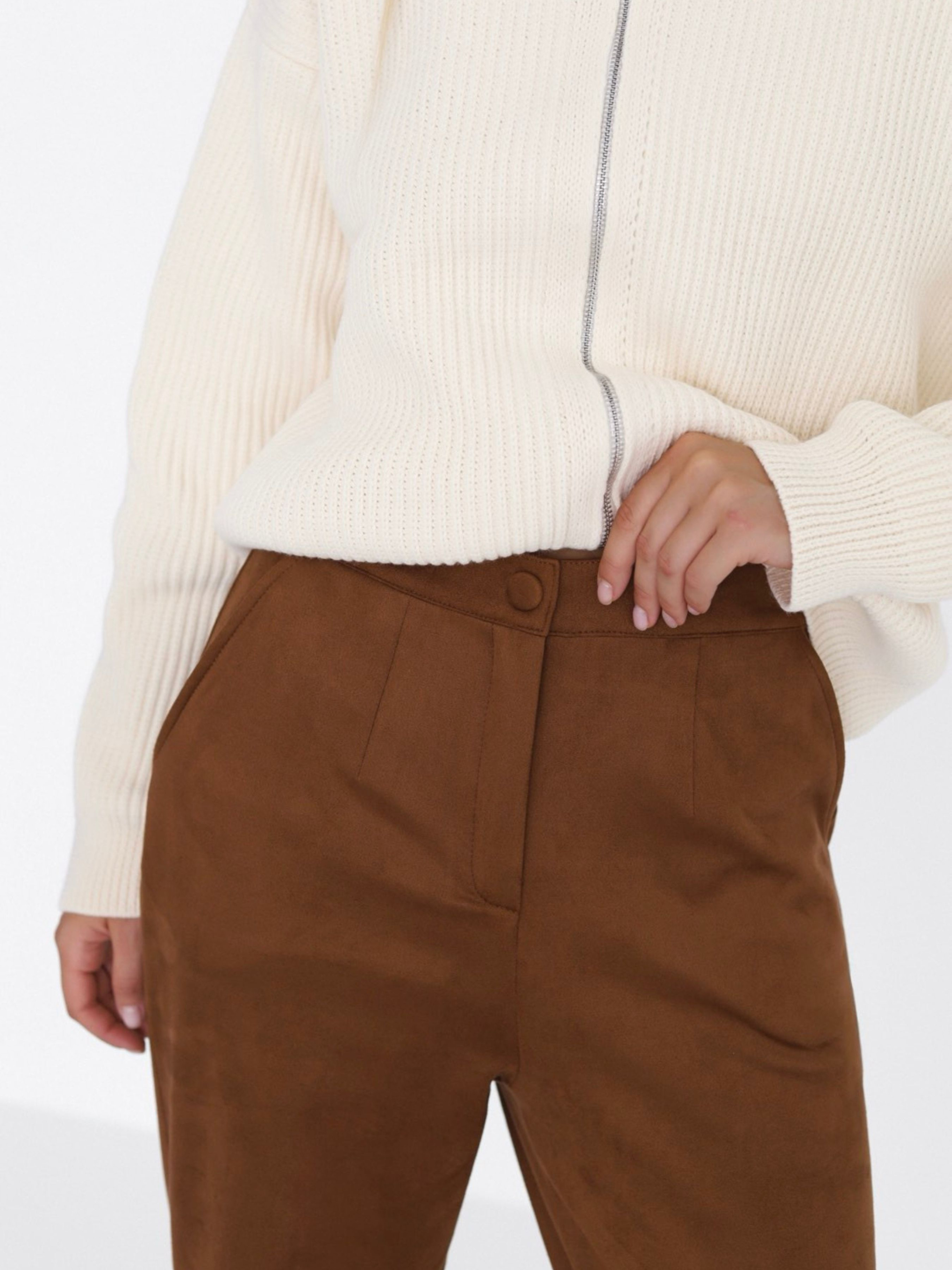 Ці штани – про відчуття. М'які, делікатні, злегка обволікаючі. Вони створені для того, щоб ти почувала себе комфортно, але при цьому виглядала зібрано і стильно. Завдяки штучній замші, вони мають той самий ніжний дотик, якого так не вистачає у буденності. Прямий крій, середня посадка, деталі без зайвого шуму – це база для повсякденного гардеробу. З ними хочеться на прогулянку в улюбленому светрі, каву в центрі міста або просто залишитися вдома у улюбленому стані «нічого не планую, але дивлюся класно».
