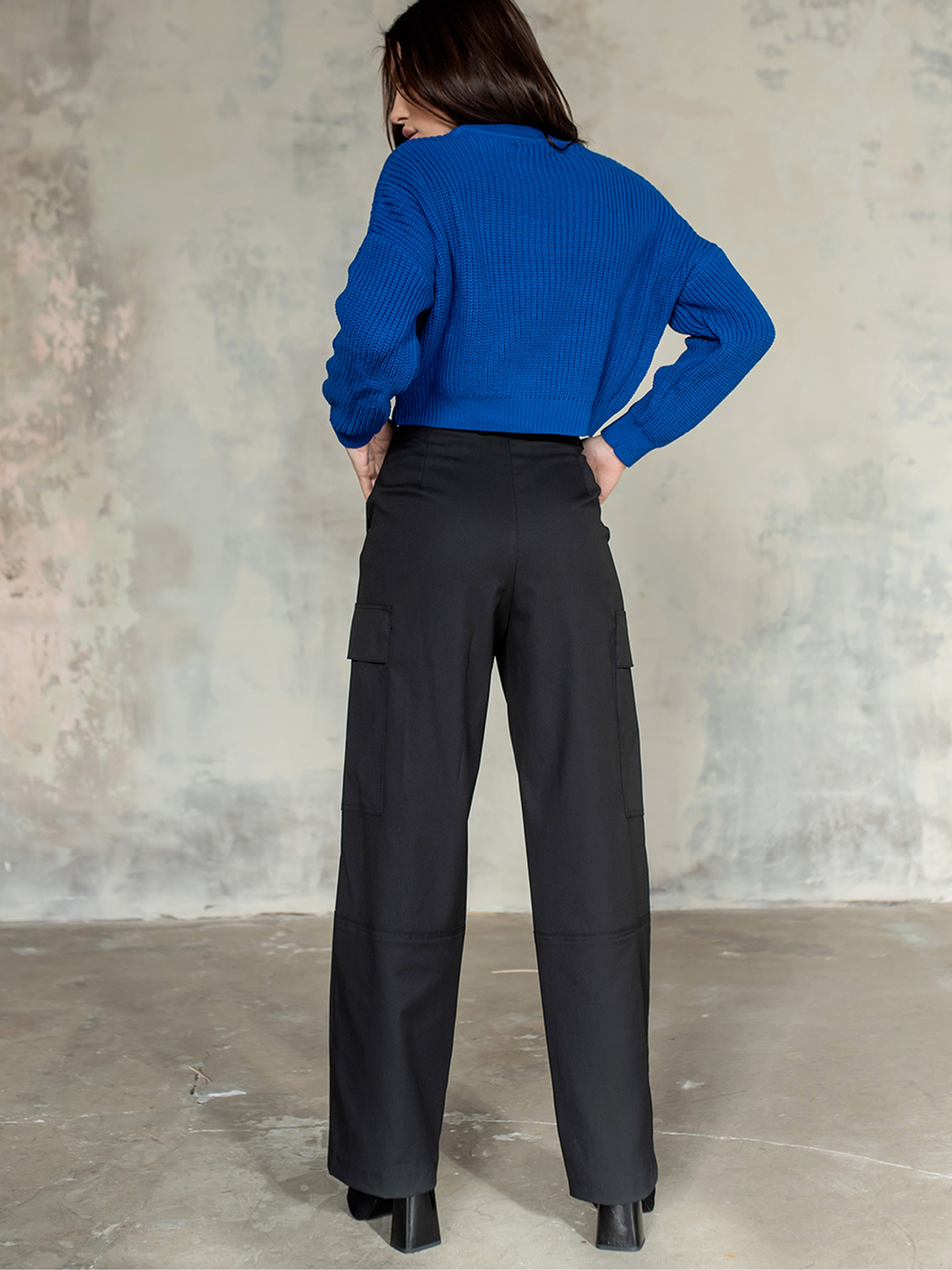 Трендові штани-карго з високою посадкою Модель з боковими прорізними кишенями, з двома накладними кишенями. Рівний оброблений низ, застібаються на блискавку спереду. Ідеально підійдуть під светр, футболку, гольф. Склад: Віскоза 31%, поліестер 62%, еластан 7%