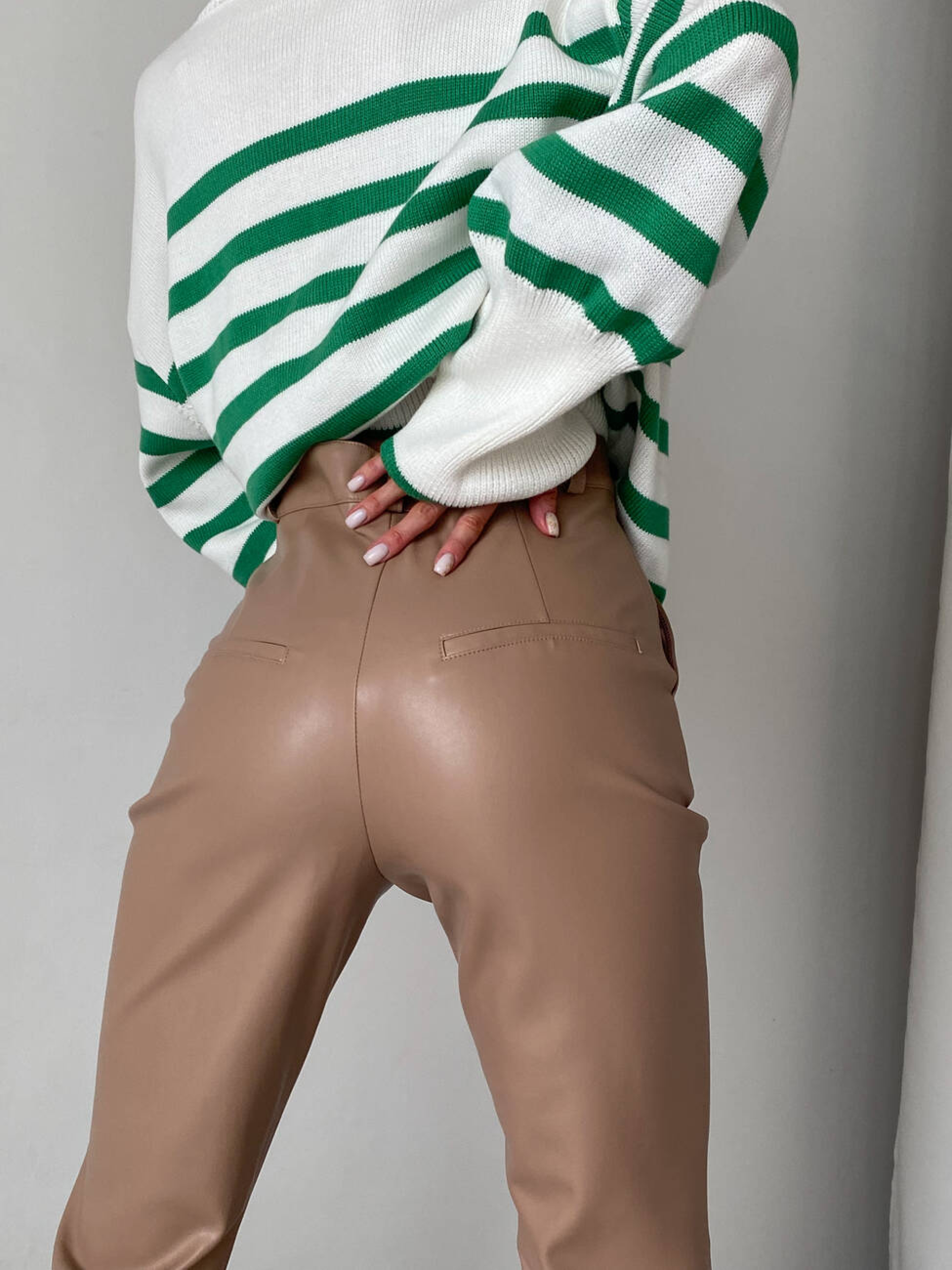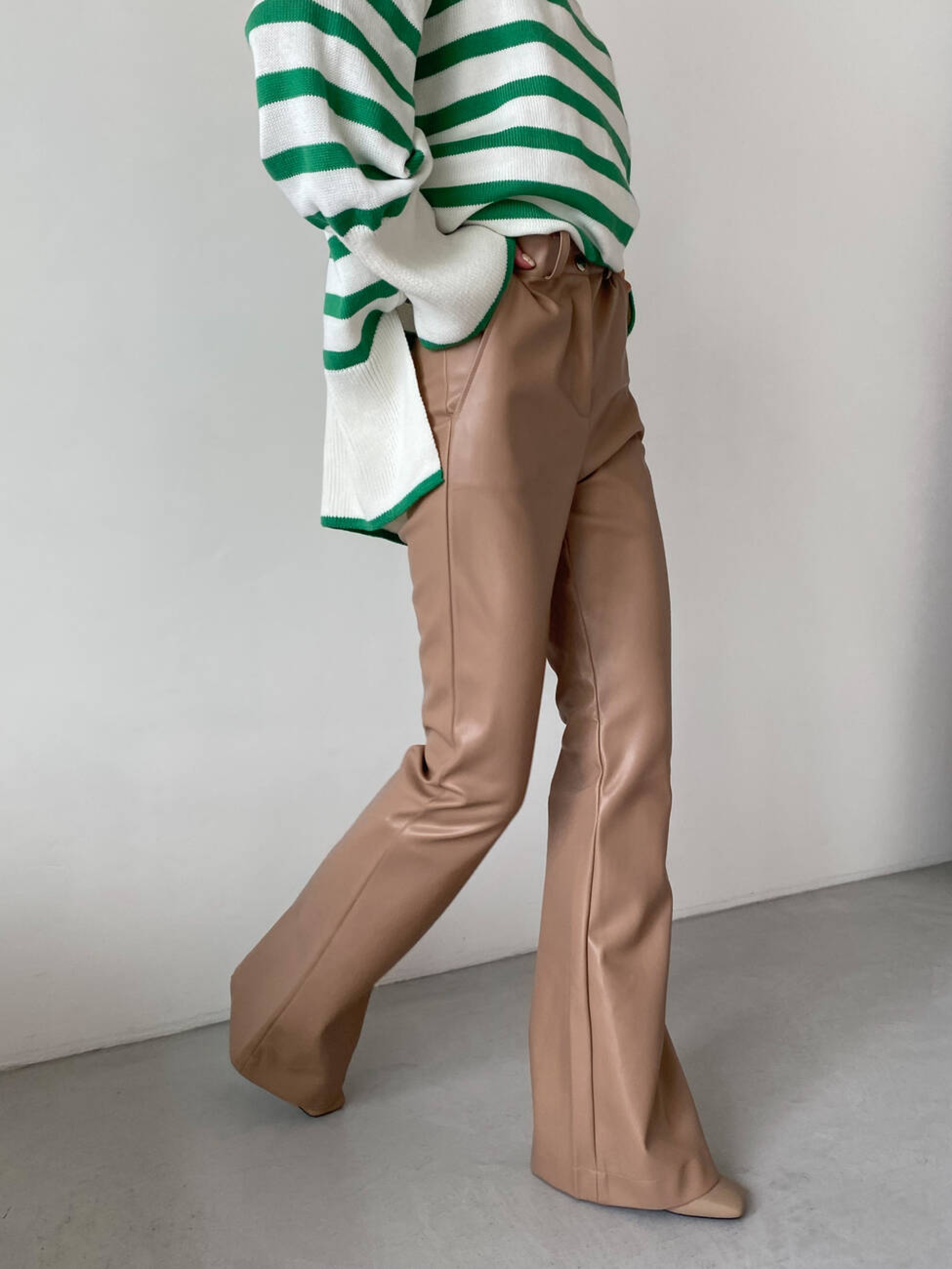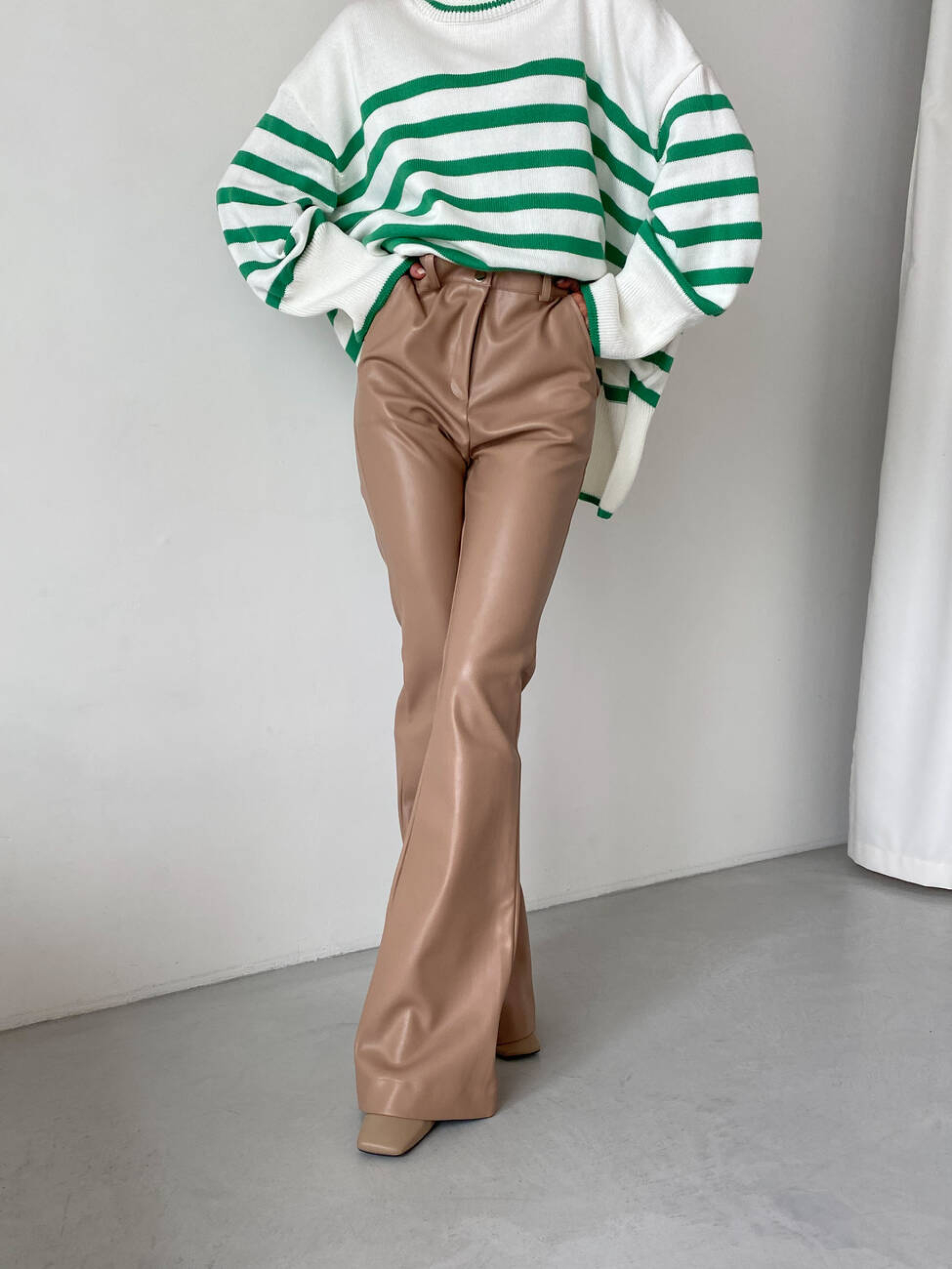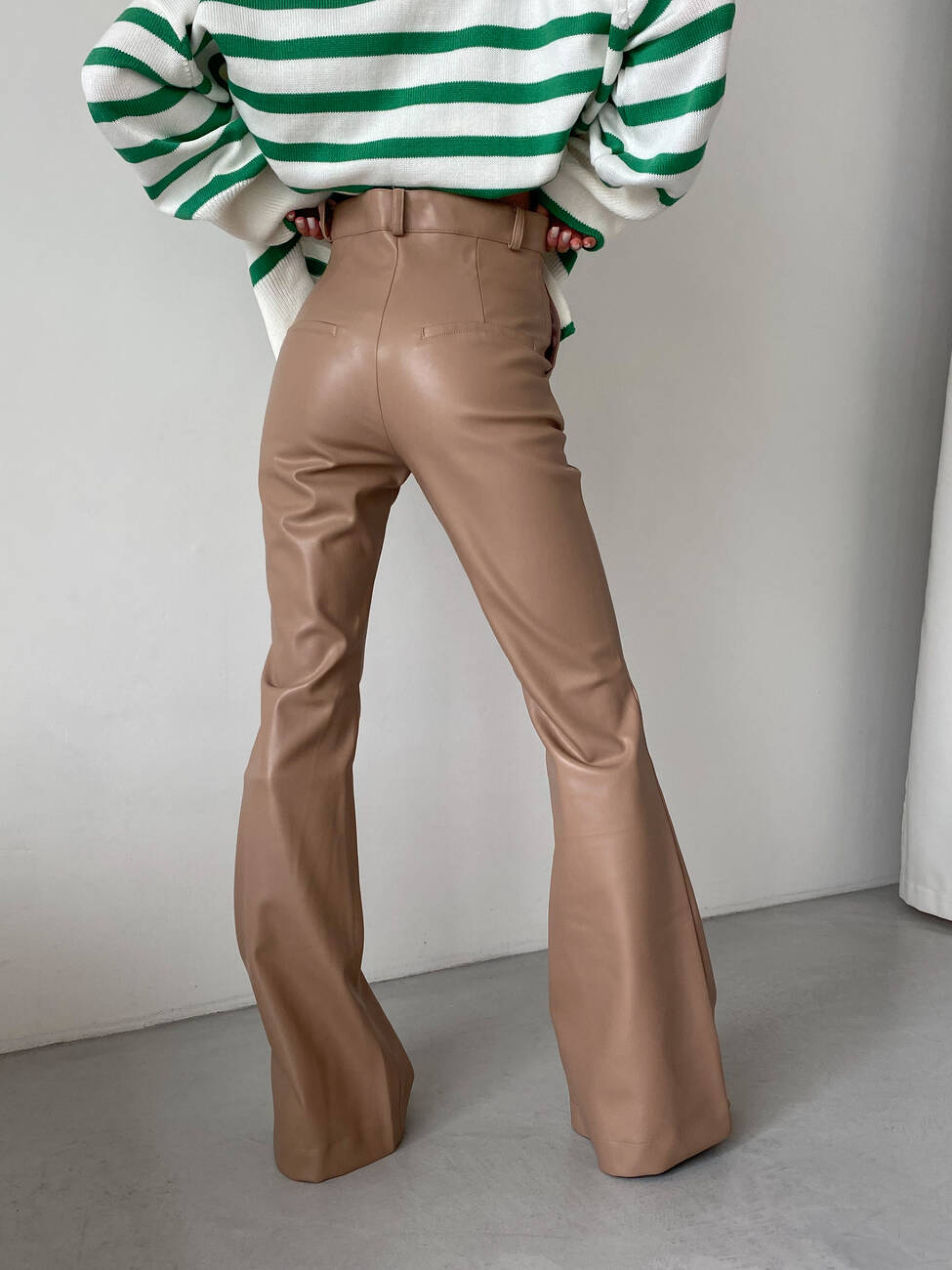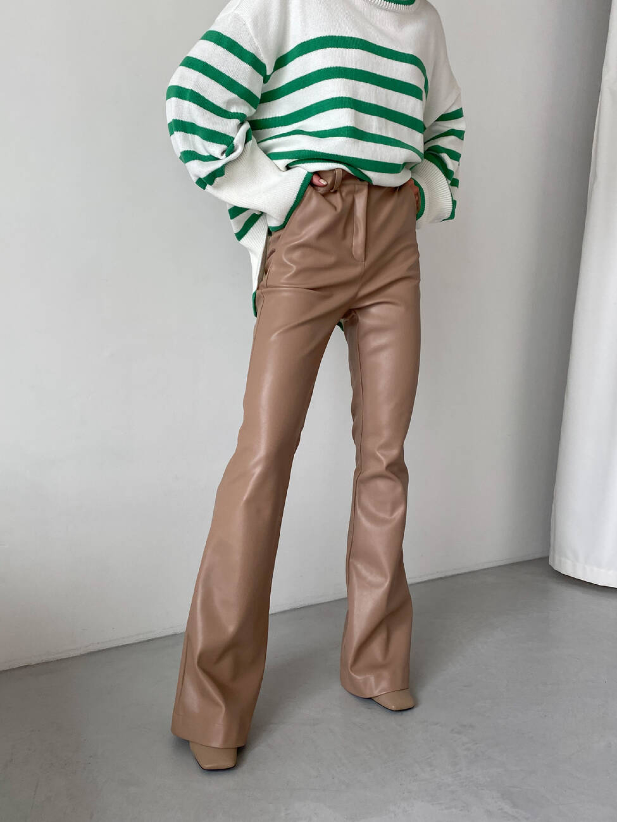 Характеристики: Тканина: екошкіра LUX на замшевій основі Посадка: висока Фасон: клеш від коліна Кишені: 2 робочі спереду Довжина виробу: 116 см Як носити: Поєднуйте брюки з об’ємним светром, сорочкою оверсайз або кроп-топом для створення модного міського образу. Взуття на підборах або грубі черевики завершать стильний look. Трендові брюки STREET з екошкіри LUX поєднують у собі елегантність та сміливість, додаючи вашому образу сучасного шарму. Модель створена для жінок, які цінують комфорт і стиль у кожній деталі. Брюки мають високу посадку, що красиво підкреслює талію, та два функціональні кишені спереду. Штанини вільного крою з клешем від коліна візуально подовжують силует і створюють витончений акцент у русі. Виконані з м’якої та щільної екошкіри на замшевій основі, ці брюки приємні на дотик, не сковують рухів і чудово тримають форму. Застібаються спереду на блискавку та кнопку.