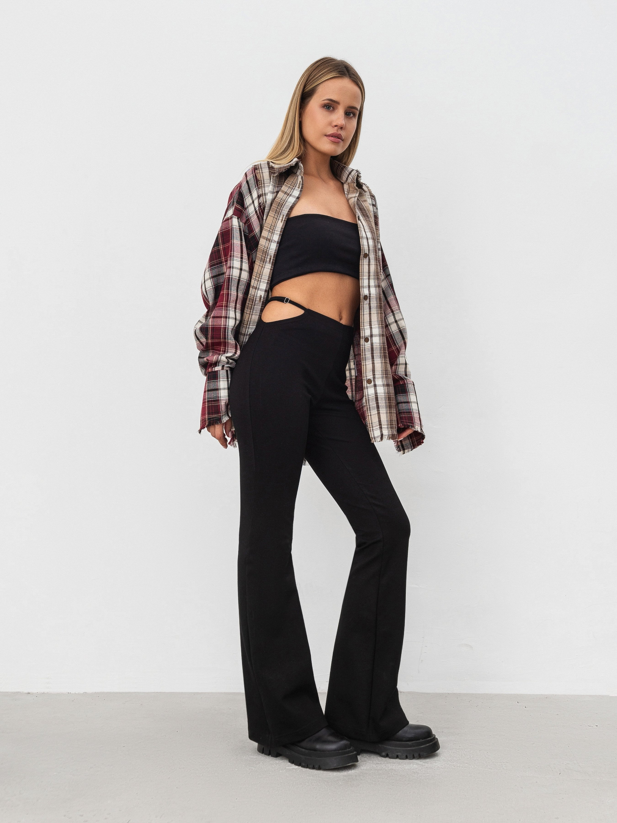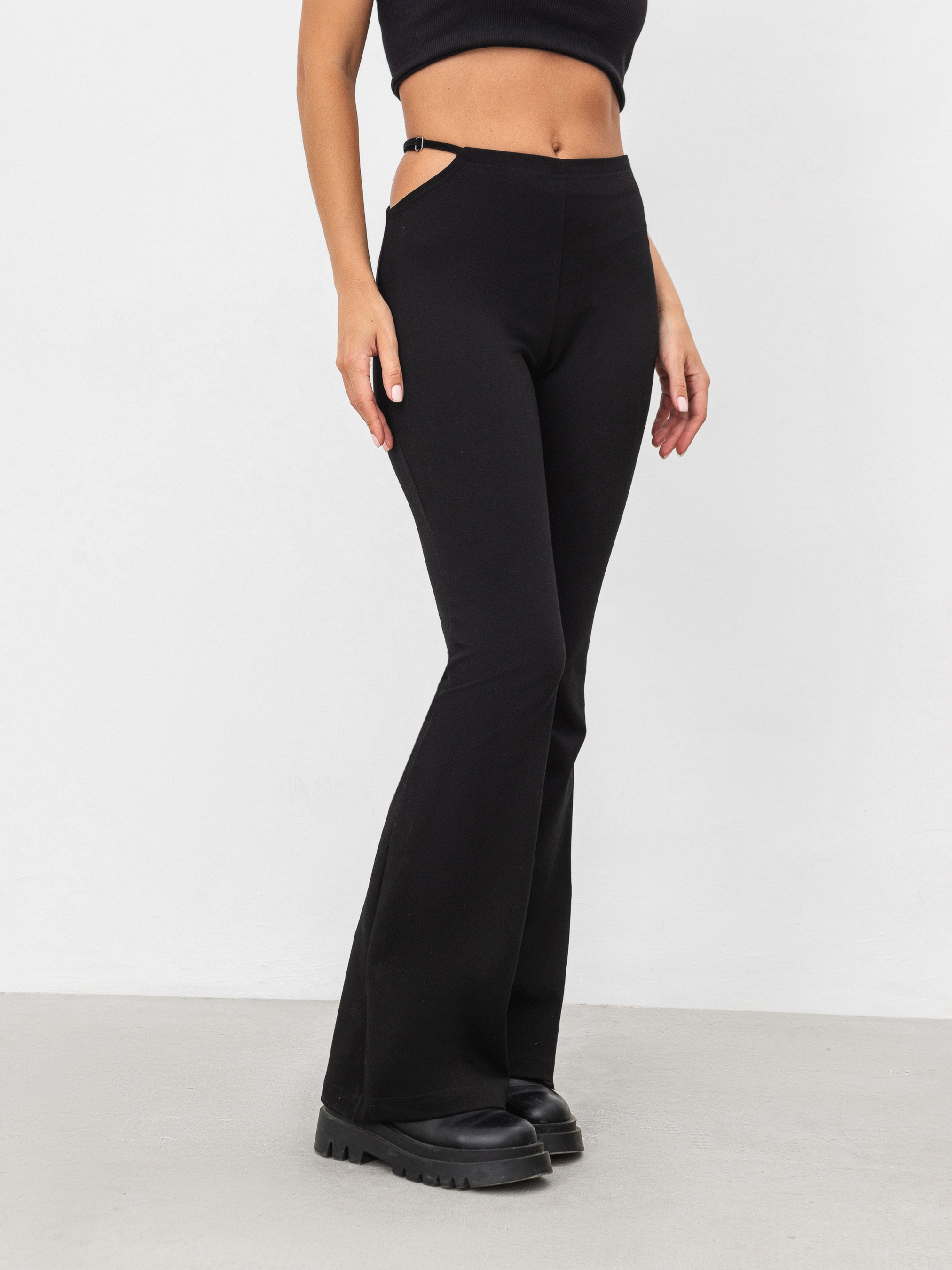 Трендові штани-кльош напівприлеглого силуету. Модель застібається на приховану блискавку в бічному шві. З боку є асиметричний виріз. Штани виготовлені з цупкого трикотажу та віскозою у складі. Акцентна модель не потребує додаткових елементів, тому її можна поєднати з базовим верхом і сумкою. Також виграшні комбінації утворюються з сорочками, бомберами та жакетами. XS Довжина по зовнішньому шву : 101 см Напівобхват стегон : 39 см Посадка : 24 см Напівобхват талії : 32 см S Довжина по зовнішньому шву : 104 см Напівобхват стегон : 42 см Посадка : 24 см Напівобхват талії : 35 см M Довжина по зовнішньому шву : 103 см Напівобхват стегон : 45 см Посадка : 25 см Напівобхват талії : 37 см L Довжина по зовнішньому шву : 105 см Напівобхват стегон : 46 см Посадка : 27 см Напівобхват талії : 38 см