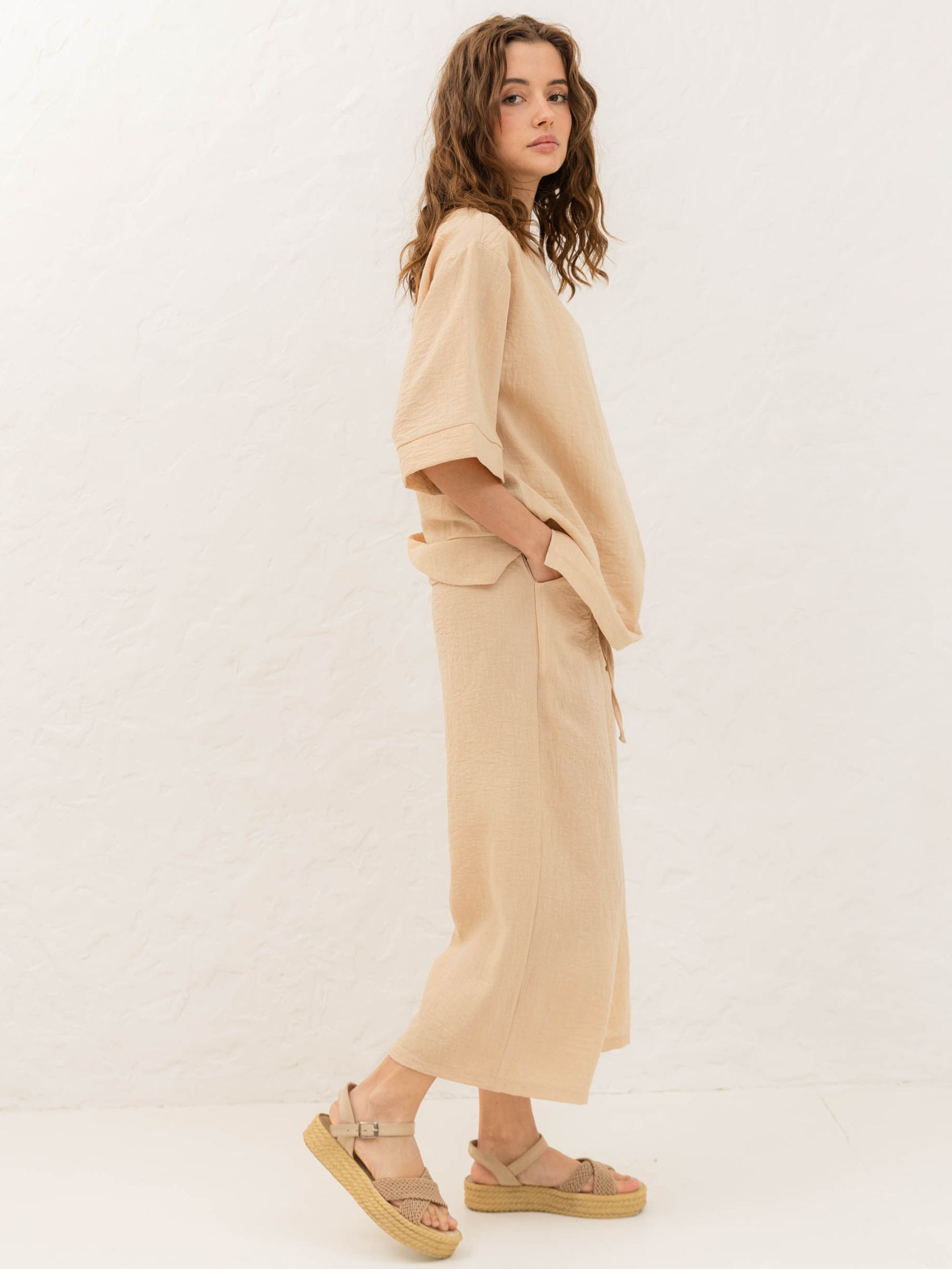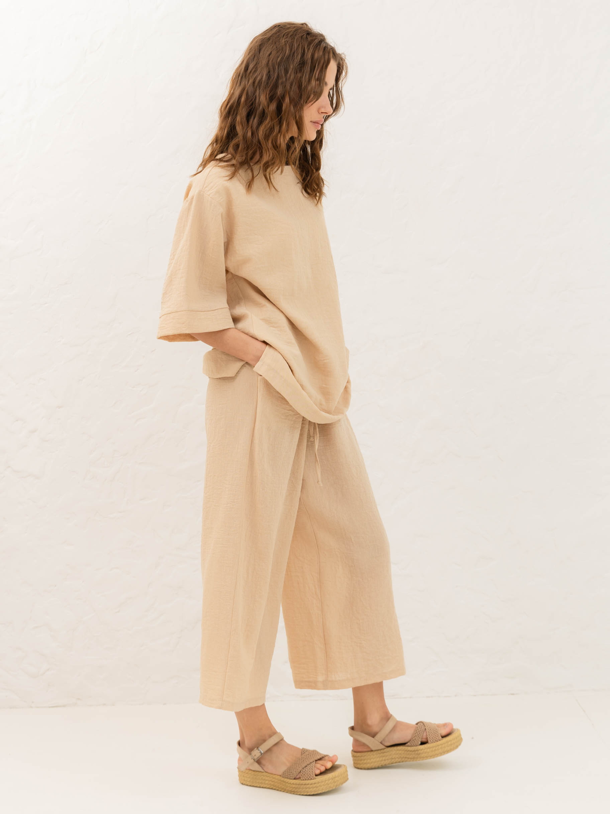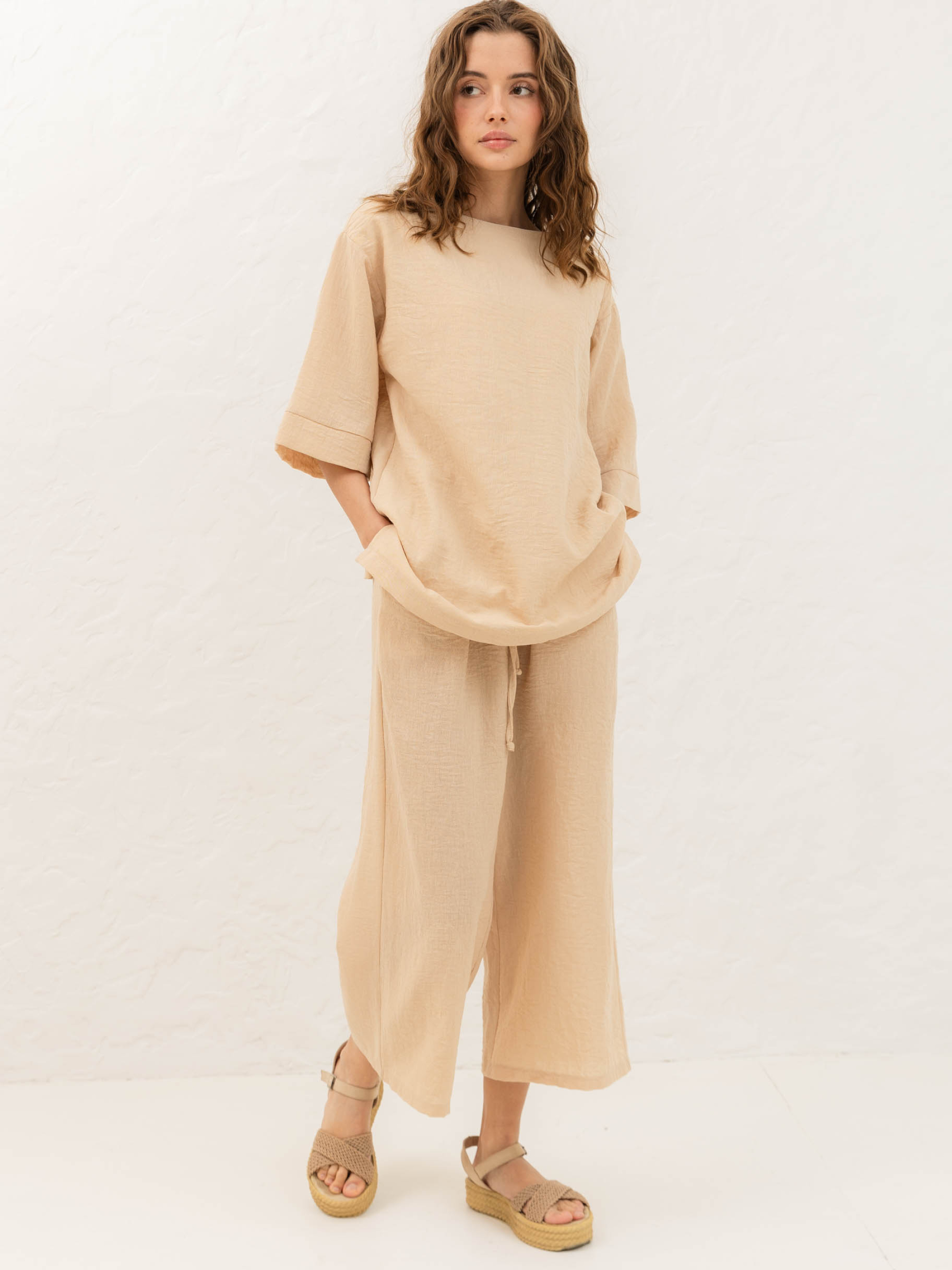 Кюлоти з натуральної тканини від Seventeen — стильна свобода для літа Онови гардероб легкістю — обирай модель, що поєднує комфорт і витонченість. Фасон Кюлоти вільного крою з високою посадкою м’яко окреслюють талію та створюють стриманий, сучасний силует. Завдяки еластичному поясу та прорізним кишеням вони залишаються зручними протягом усього дня. Актуальна довжина до щиколоток пасує як до сандалій, так і до взуття на підборах. Матеріал Натуральна тканина на основі льону й бавовни дарує відчуття прохолоди навіть у спеку. Повітропроникна, легка та приємна до тіла — саме те, що потрібно влітку. Льон відповідає за свіжість і стійкість форми, бавовна — за м’якість і комфорт. Розмірна сітка S–M: талія 68–72 см, стегна 92–96 см, довжина — 90 см L–XL: талія 76–81 см, стегна 100–105 см, довжина — 91 см XXL–3XL: талія 86–91 см, стегна 110–115 см, довжина — 92 см Догляд Прати вручну при температурі до 30 °C. Не використовувати відбілювачі. Прасувати з вивороту на середньому режимі. Сушити в тіні в горизонтальному положенні. Уникати тривалого замочування.