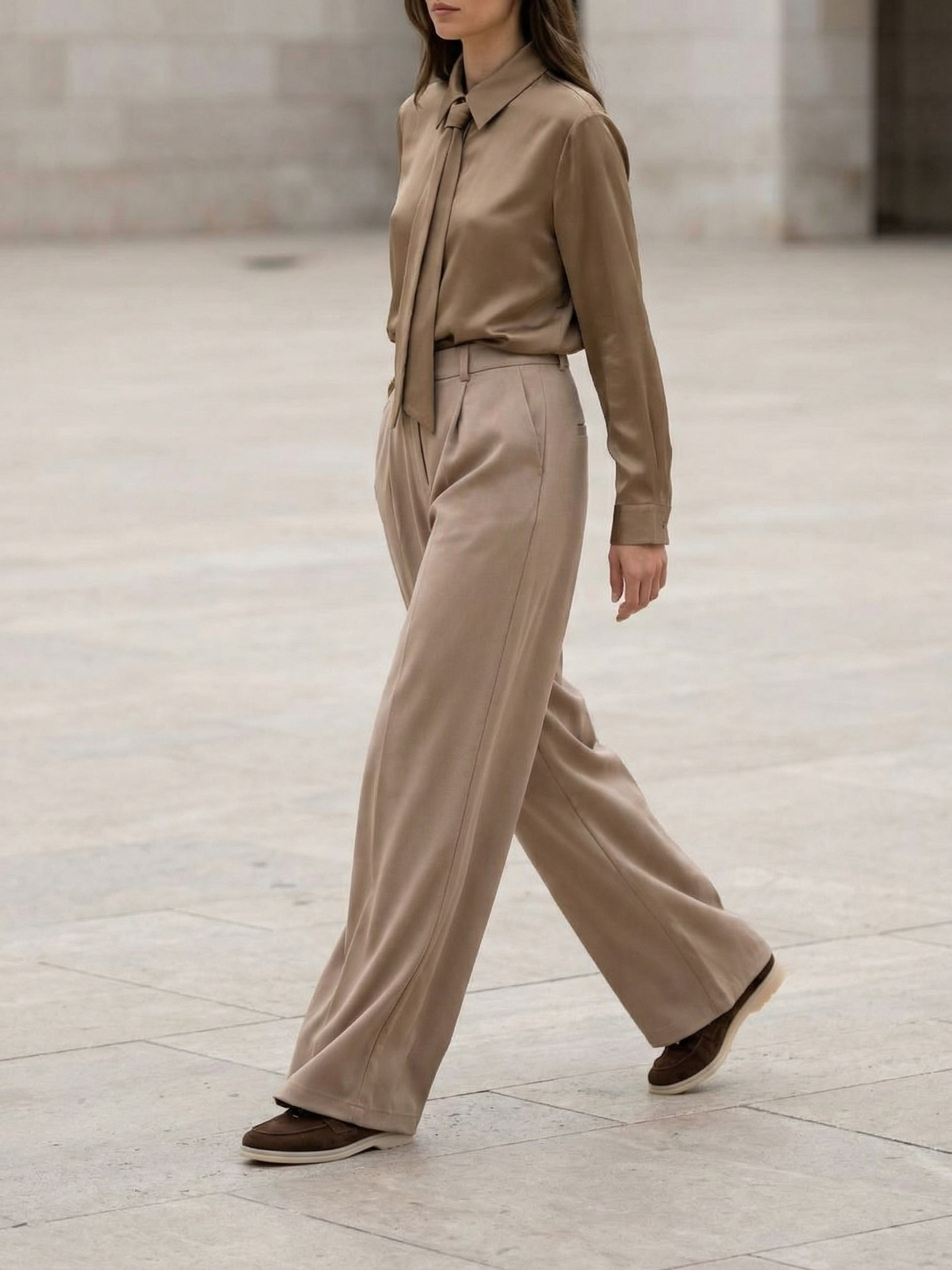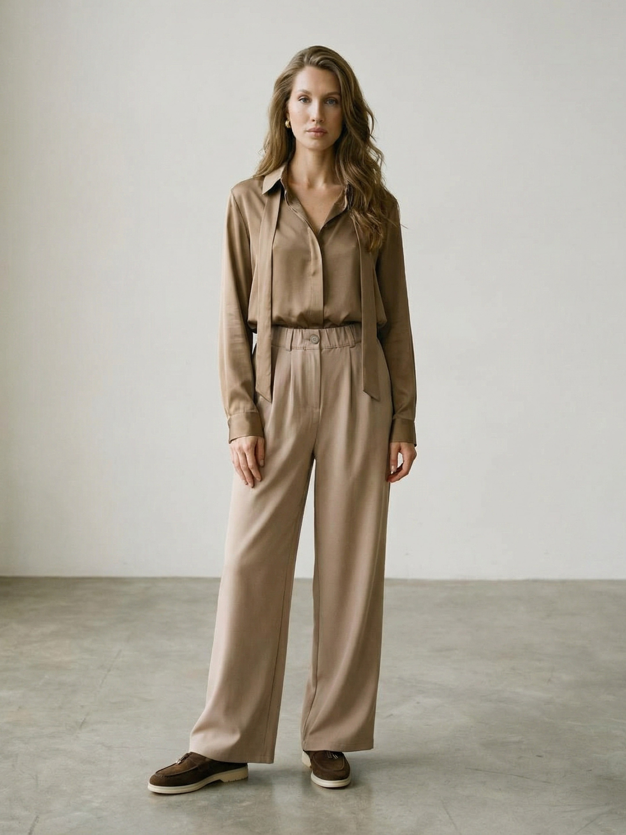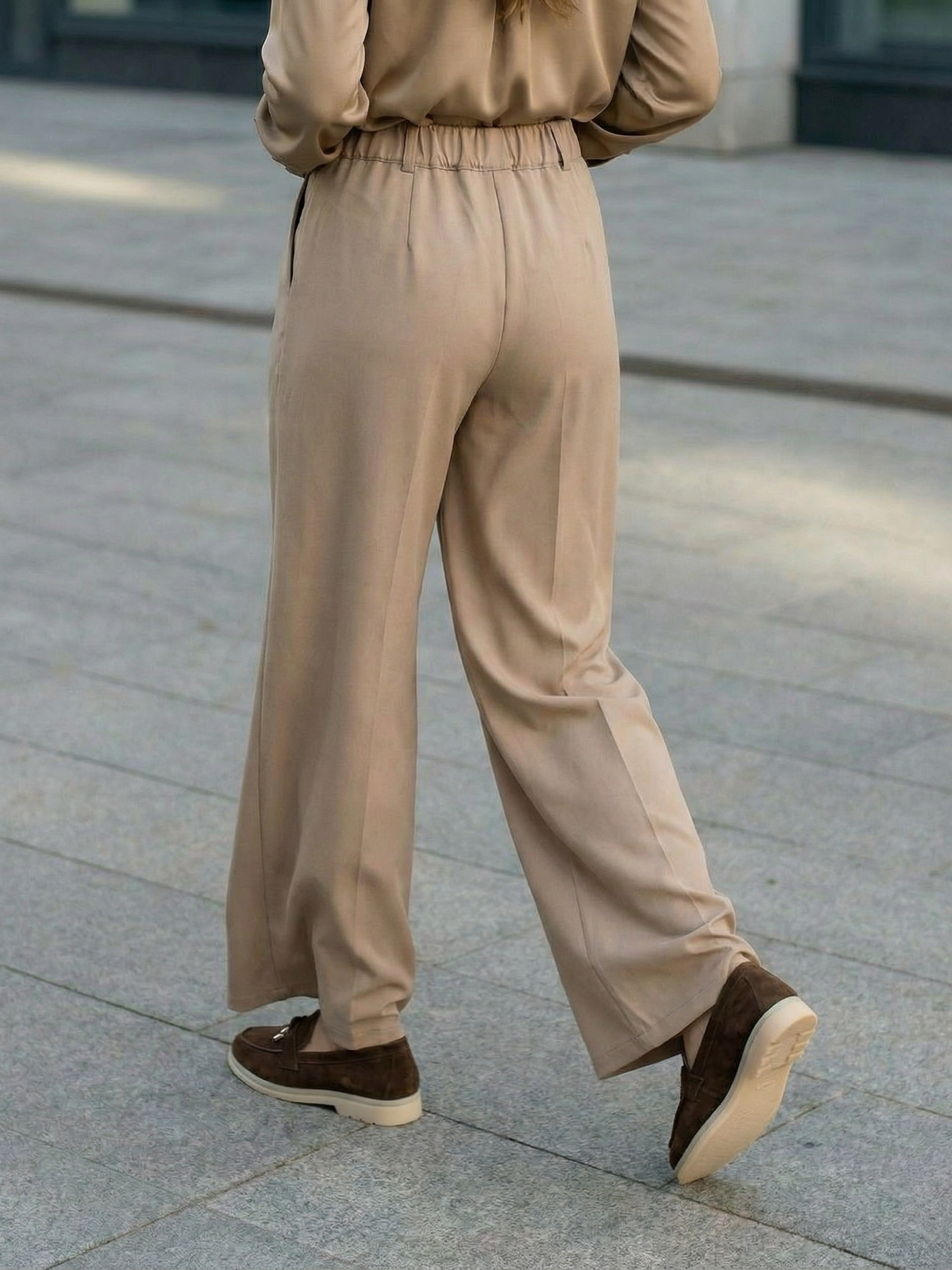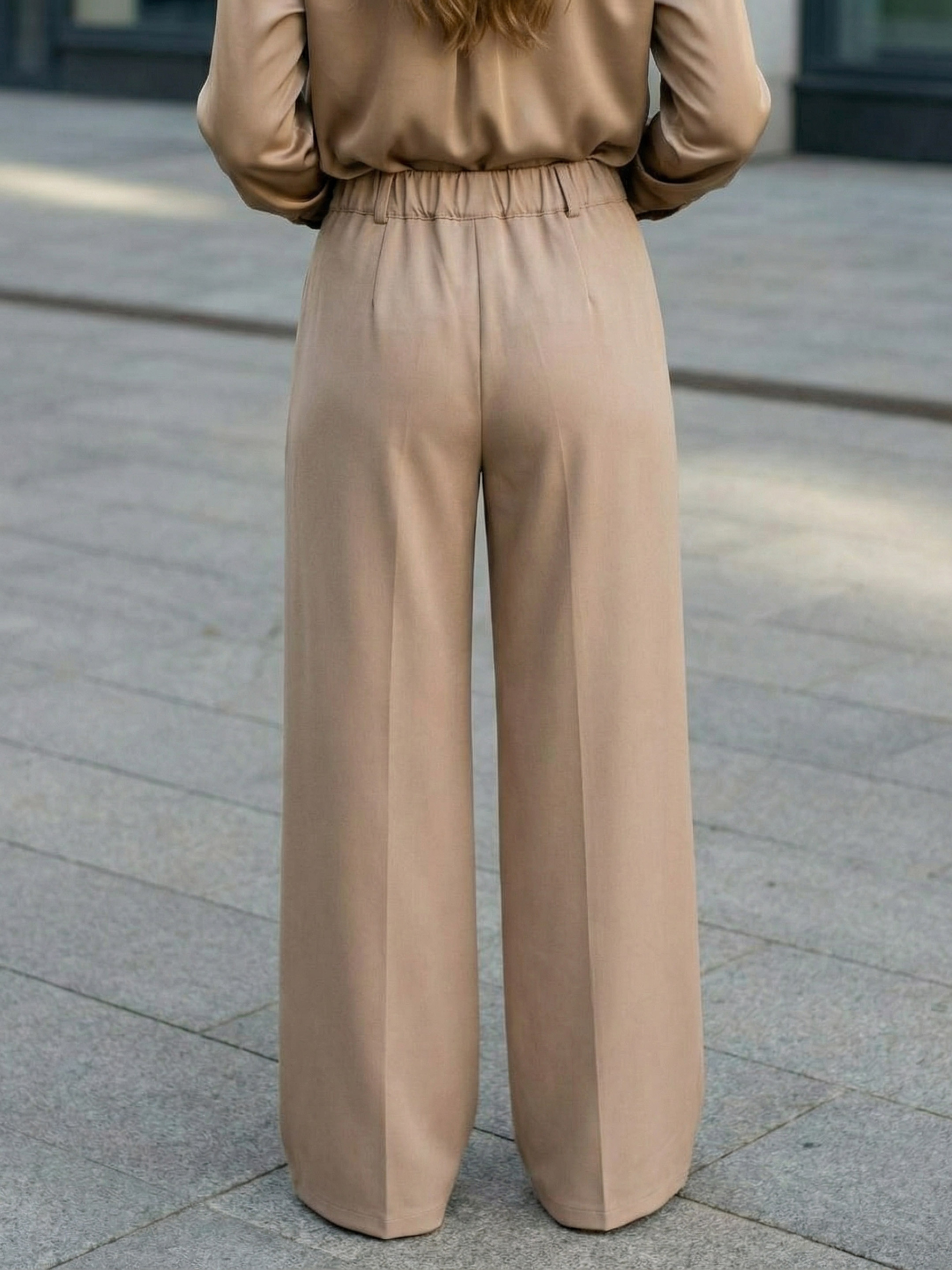Класичні брюки з високою посадкою Pre-fall 25 Фасон: Брюки прямого вільного крою з високою посадкою та декоративними складками на передній частині, які додають силуету виразності. Пояс комбінований: спереду класична застібка на блискавку і гудзик, а ззаду — зручна еластична вставка. Функціональні кишені роблять модель практичною. Це універсальний демісезонний варіант, що підходить для весни та осені. Матеріал: Кашемір — м’який і теплий матеріал, водночас дихаючий і приємний до тіла, який забезпечує комфорт у щоденному носінні. Догляд: Рекомендується ручне прання при температурі до 30 °C. Не використовувати відбілювачі та машинне сушіння, прасувати на низькій температурі. S-M: Обхват грудей: 84-88 см; Обхват талії: 68-72 см; Обхват стегон: 92-96 см. L-XL: Обхват грудей: 92-96 см; Обхват талії: 76-81 см; Обхват стегон: 100-105 см. 2XL-3XL: Обхват грудей: 100-105 см; Обхват талії: 86-91 см; Обхват стегон: 110-115 см. Характеристики Колекція Pre-spring 26 Матеріал італійська костюмка Колір бежевий Фурнітура гудзик, блискавка, резинка Фасон прямий, вільний Сезон демісезон Декоративні елементи подвійний склад на полиці Конструктивні елементи кишені Комплектація штани Догляд за одягом ручне прання до 30°