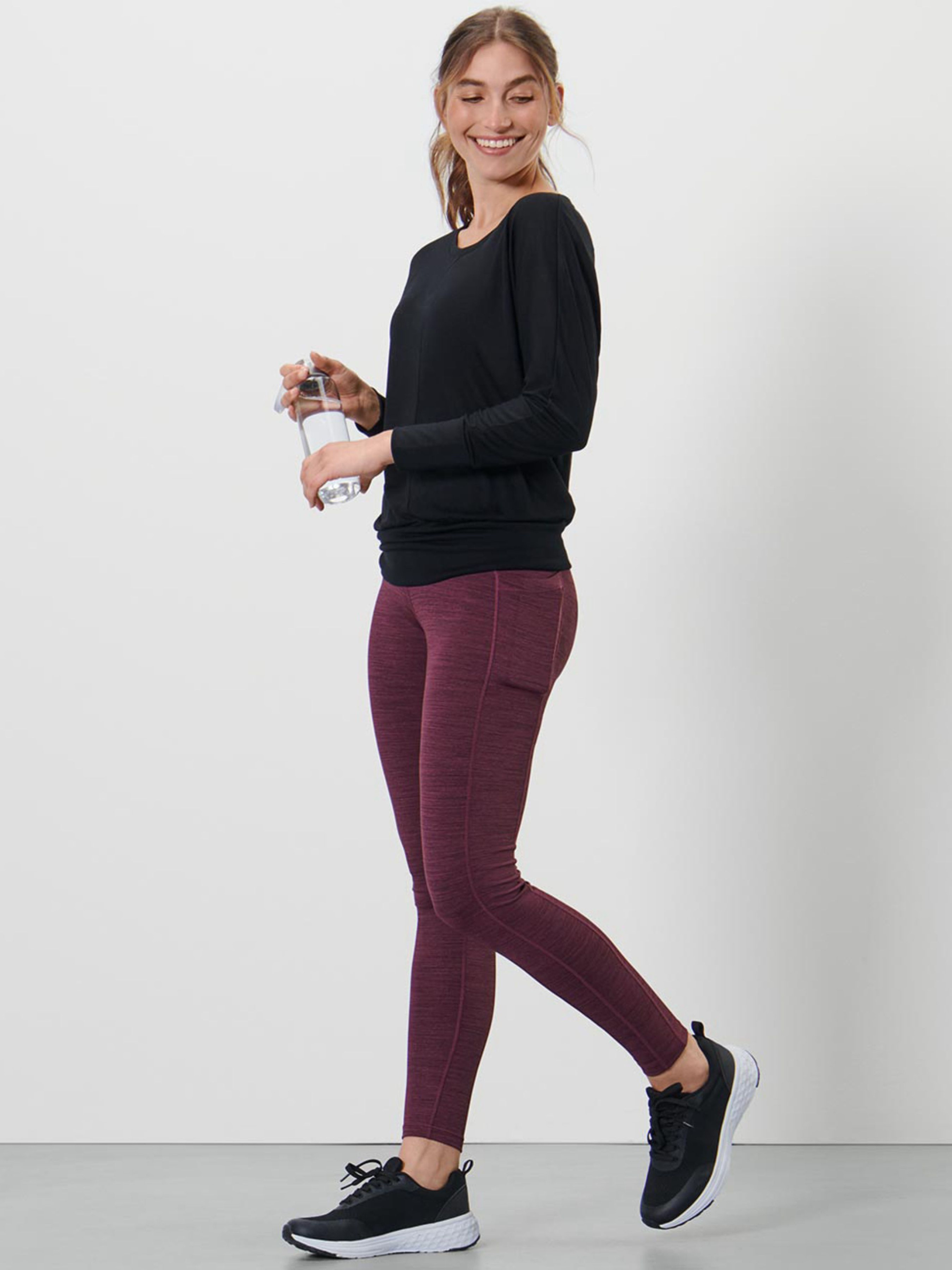 Спортивні легінси Дихаюча тканина, відводить вологу та швидко сохне завдяки покриттю DryActive Plus Ефект триколірного меланжу Кишеня збоку на стегні З фірмовим еластаном: зберігає форму, ідеально сідає та забезпечує повну свободу рухів Широкий еластичний пояс із внутрішніми зав'язками Колір: вишнево-червоний строкатий Матеріал: 92% поліестер, 8% еластан (Creora®) Розмір M європейський (M або 46–48 за українською розмірною шкалою): ПОТ: 35 см Напівобхват стегон: 40 см Довжина/крок: 84/62 см Примітка: Одяг бренду Tchibo зазвичай не має паперових етикеток. У більшості випадків внутрішні бірки зі складом тканини, назвою бренду або розміром зрізані частково або повністю.