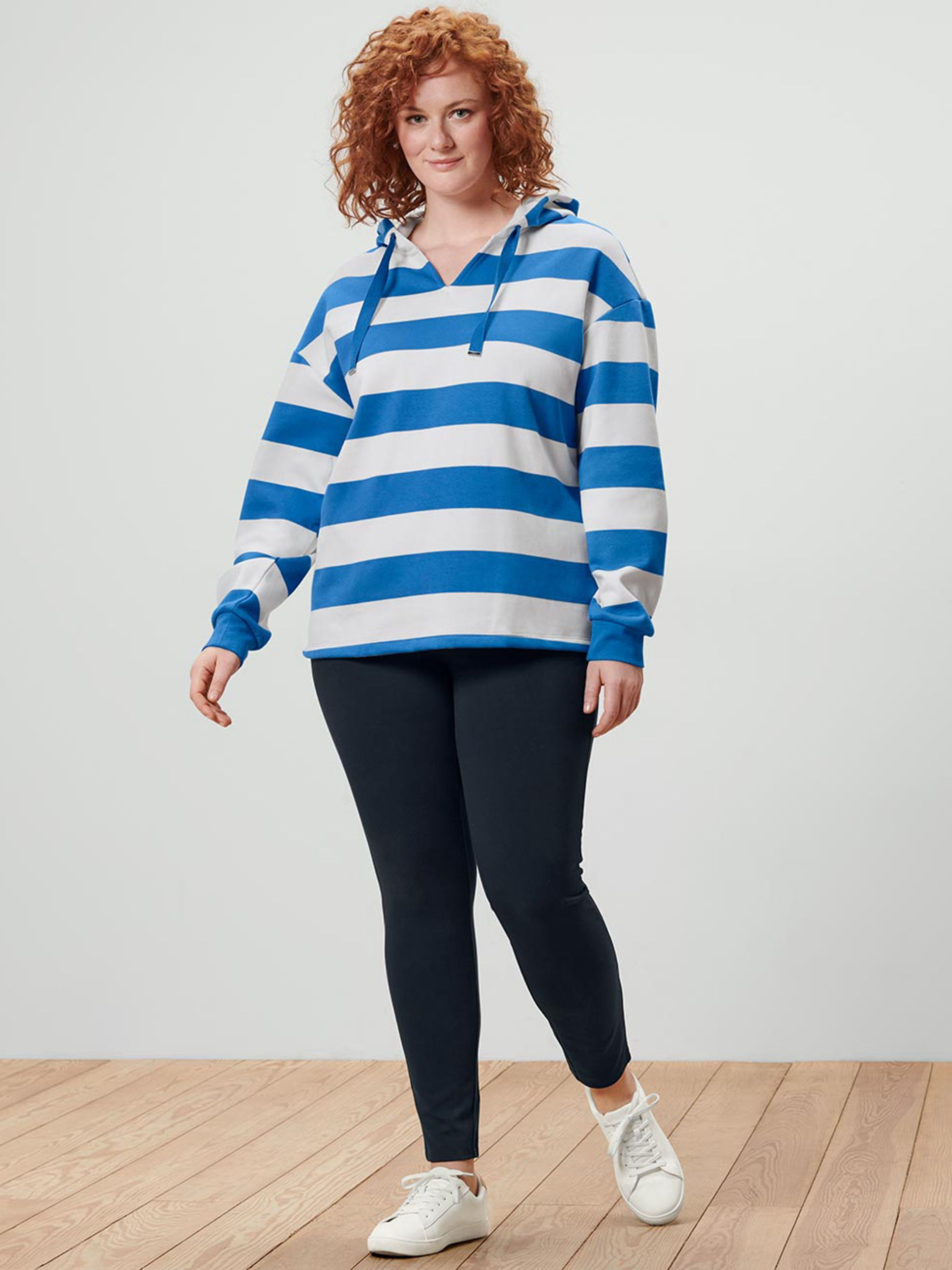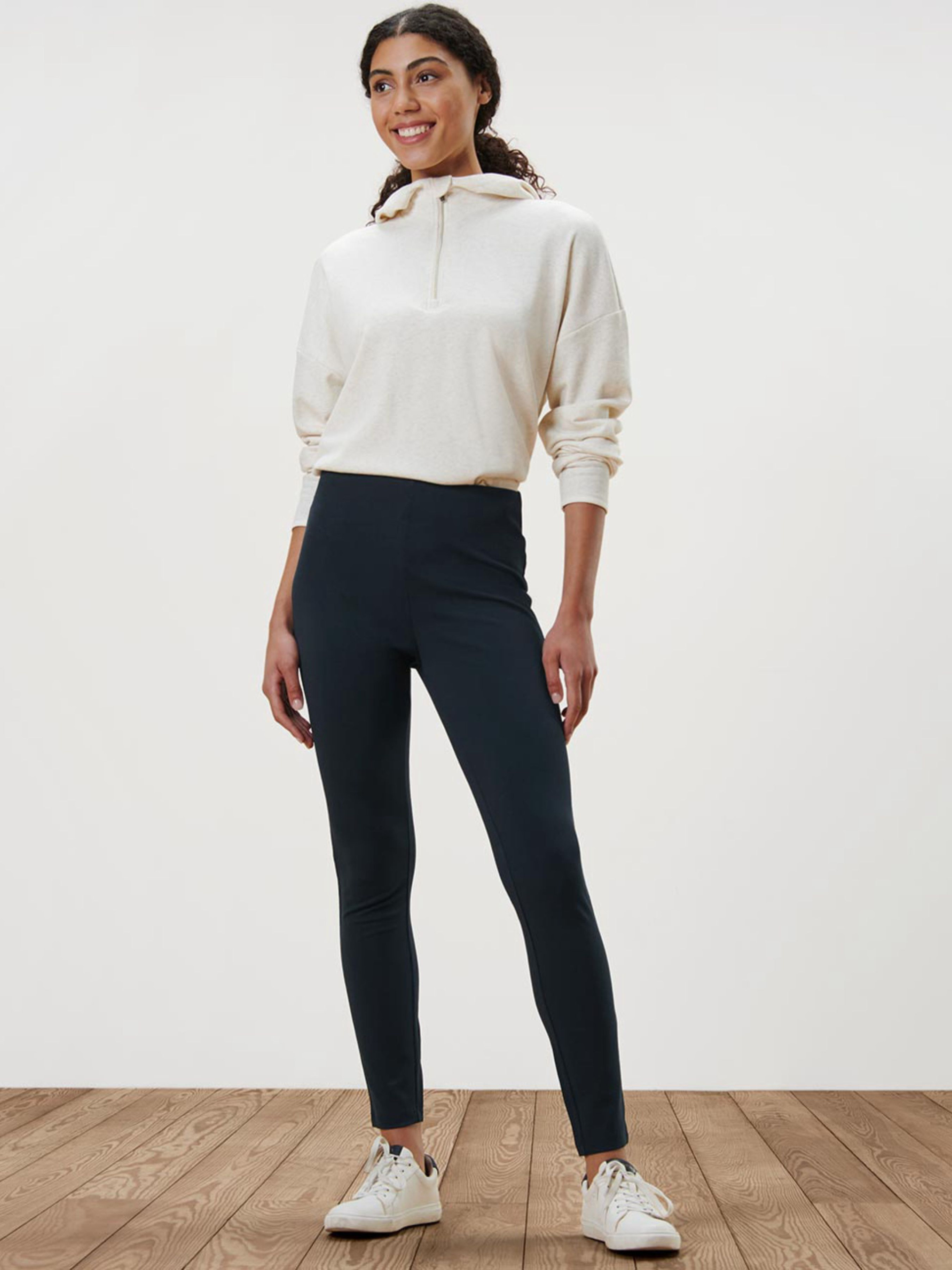Жіночі легінси з еластичної тканини Punto di Roma — щільні, непрозорі та зручні у носінні. Еластичний пояс забезпечує комфорт без стягування, а еластан у складі допомагає зберігати форму та дарує ідеальну посадку. Довжина до щиколотки робить модель універсальною для повсякденних образів. М’яка якість тканини з високим вмістом віскози виглядає елегантно та дозволяє поєднувати ці легінси як із вільними блузами, так і з подовженими светрами. Виріб протестований на відсутність шкідливих речовин. Колір: темно-синій Матеріал: 66% віскоза, 30% поліестер, 4% еластан Розміри: 32-34 (XS/S або 42-44 укр): ПОТ 32 см, стегна 36 см, довжина/крок 92/67 см 40-42 (M/L або 46-48 укр): ПОТ 38 см, стегна 43 см, довжина/крок 93/70 см 44-46 (L/XL або 50-52 укр): ПОТ 42 см, стегна 46 см, довжина/крок 96/71 см Примітка: одяг бренду Tchibo зазвичай не має паперових етикеток. У більшості випадків внутрішні бірки зі складом тканини, брендом чи розміром зрізані частково або повністю.