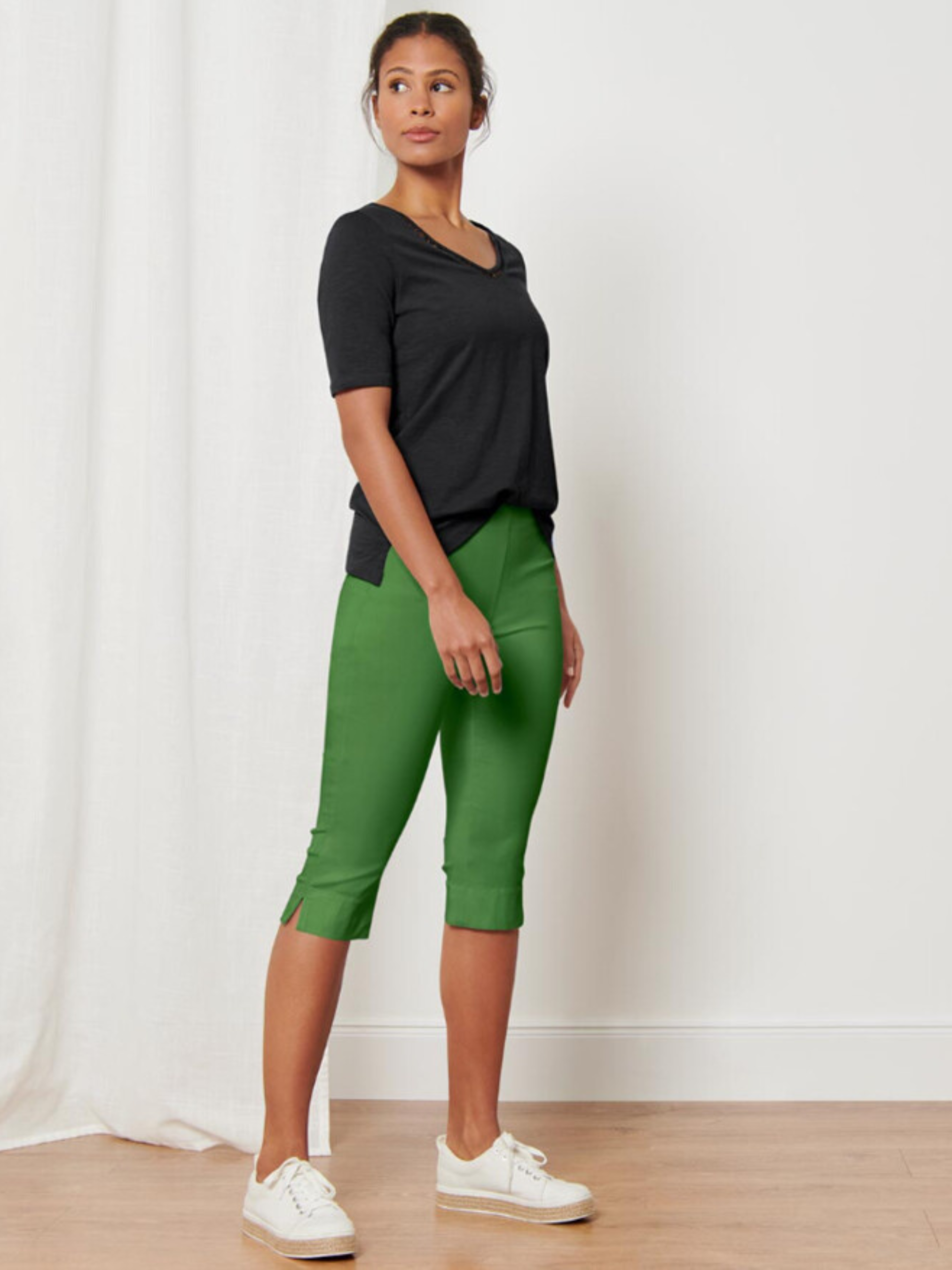 Еластична тканина з високоякісною віскозою Бічний розріз по краю для оптимальної свободи рухів Вузька штанина З еластаном: зберігає форму, ідеально підходить та має високий комфорт під час носіння Колір Зелений Матеріал 74% віскоза (LENZING™ ECOVERO™), 22% поліамід, 4% еластан (LYCRA®) ПОТ: 42 см Напівобхват стегон: 49 см Довжина/крок: 72/47 см "Заміри можуть мати похибку вимірювання ± 1/2 см Шановні покупці! Одяг бренду практично весь без паперових етикеток, за рідкісним винятком, і зі зрізаними частково або повністю внутрішніми бірками і ярликами зі складом тканини та іншими даними.