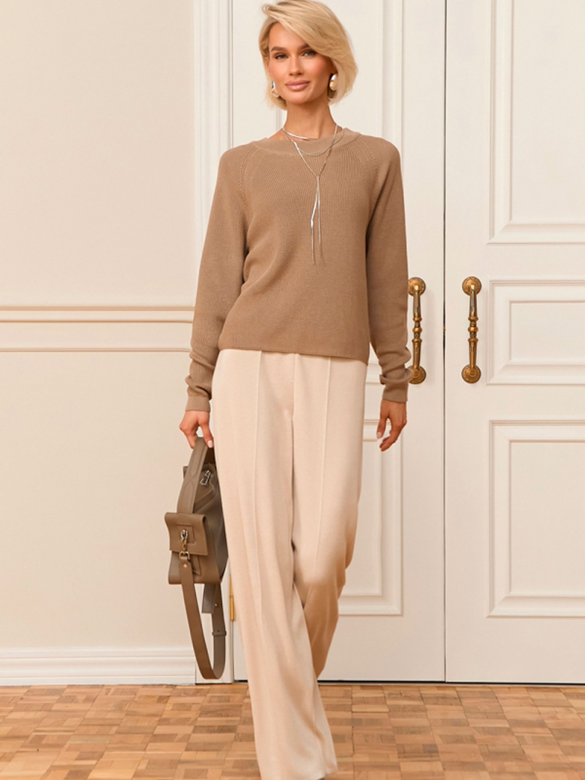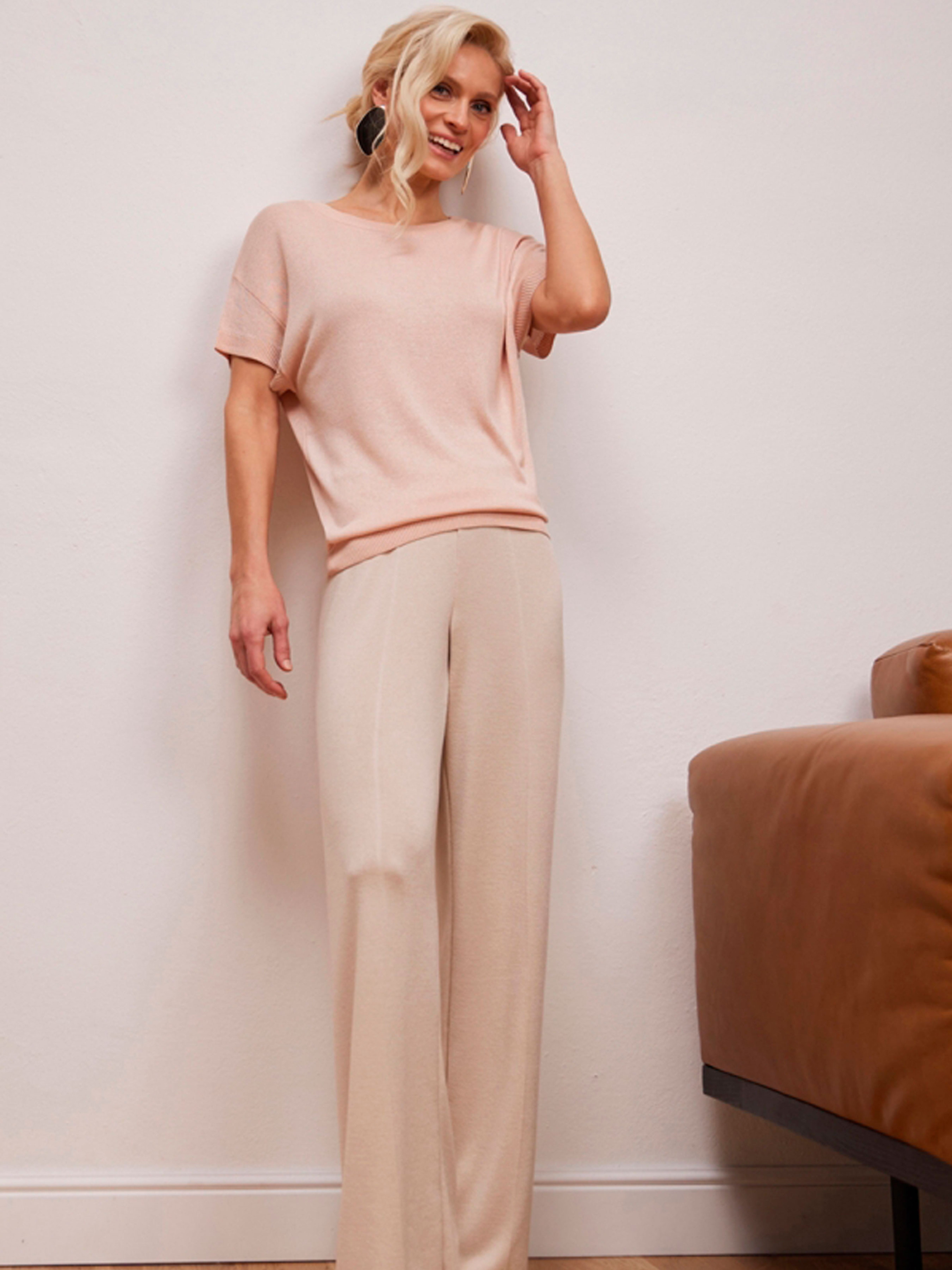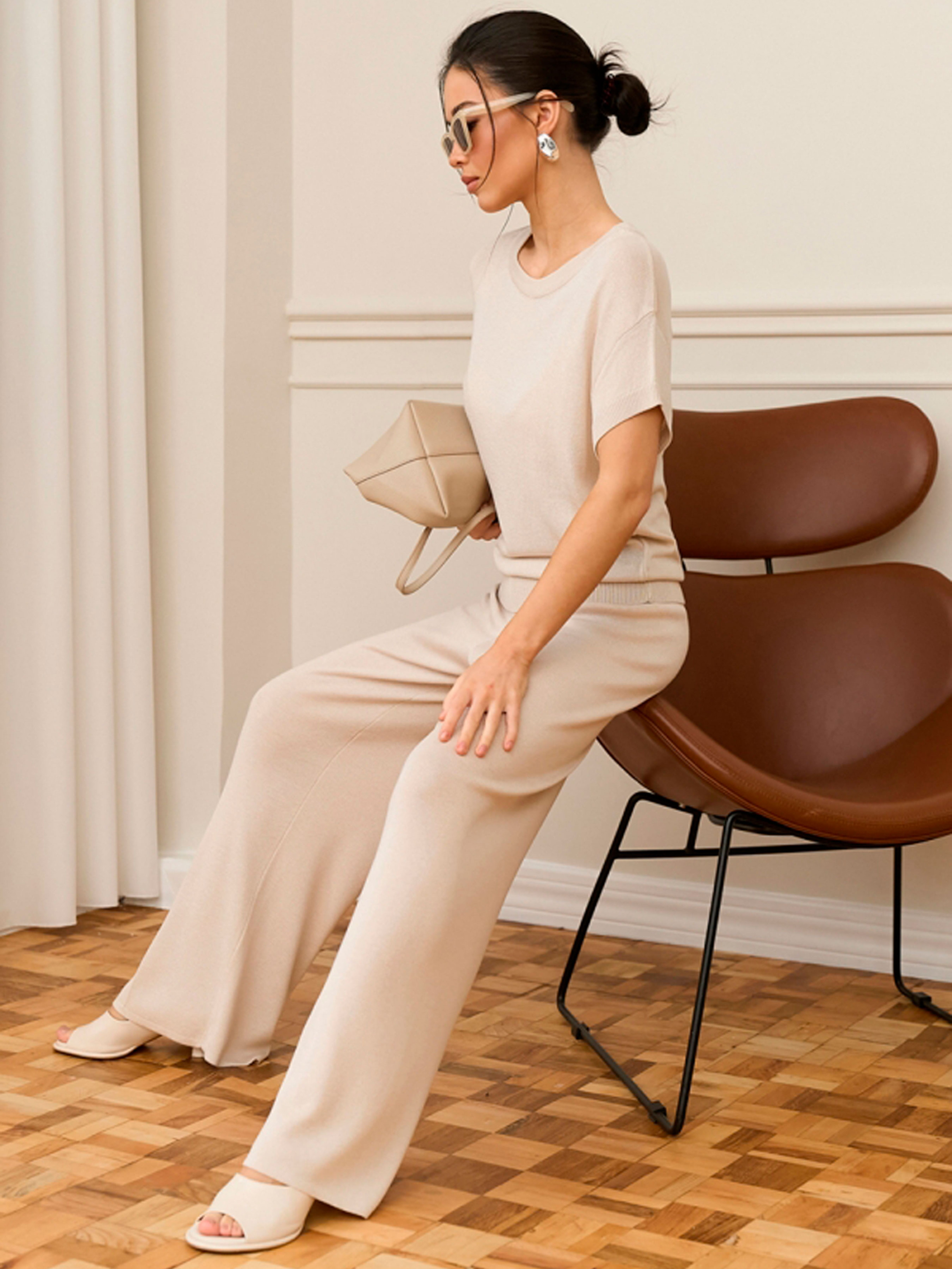 Жіночі брюки прямого крою зі струменистої віскози — це втілення бездоганного комфорту та елегантної розслабленості. Виготовлені з високоякісної суміші віскози та бавовни, вони мають благородну шовковисту текстуру, яка приємно охолоджує шкіру та гарно драпірується при ходьбі. Завдяки еластичній резинці на поясі та прямому крою, ця модель стане ідеальною базою для вашого літнього та демісезонного гардероба. Характеристики Матеріал: Шовковиста віскозна пряжа (м'яка, струмениста тканина). Склад: 70% віскоза, 25% бавовна, 5% поліамід (віскоза дарує ніжність, бавовна забезпечує повітропроникність, а поліамід допомагає виробу тримати форму). Тканина: Віскозний трикотаж (дихаючий та гіпоалергенний). Фасон: Прямий (класичний вільного крою). Пояс: Комфортна еластична резинка (забезпечує м'яку посадку без здавлювання). Довжина по бічному шву: 106 см (ідеально підходить для створення елегантного подовженого силуету). Стиль: Кежуал (casual) / Мінімалізм / Домашній преміум-стиль. Сезон: Літо, тепла весна / осінь. Чому ці штани стане вашими улюбленими? Ефектний силует: Прямий фасон візуально подовжує ноги та додає образу легкості, а струмениста тканина створює витончений рух при кожному кроці. Преміальний комфорт: Шовковиста віскоза в поєднанні з бавовною дозволяє шкірі «дихати» навіть у спекотну погоду, забезпечуючи відчуття свіжості протягом усього дня. Ідеальна посадка: Еластична резинка на талії робить ці штани максимально практичними — вони підлаштовуються під ваші параметри, даруючи повну свободу рухів. Універсальність: Модель легко комбінується як із базовими футболками та кедами для прогулянок, так і з легкими джемперами чи шовковими топами для створення більш вишуканих луків. Практична довжина: Довжина 106 см дозволяє носити штани як із взуттям на плоскій підошві, так і з невеликим підбором, зберігаючи пропорції фігури. Рекомендації з догляду Прання: Тільки делікатне прання при температурі не вище 30°C. Рекомендується використовувати мішечок для прання, щоб зберегти шовковисту структуру пряжі. Засоби: Використовуйте м’які рідкі гелі для делікатних тканин. Уникайте агресивних засобів та відбілювачів. Сушіння: Сушіть у розправленому вигляді на горизонтальній поверхні або на вішалці природним шляхом. Уникайте машинної сушки, щоб запобігти усадці віскози. Прасування: Зазвичай штани майже не мнеться. За необхідності скористайтеся вертикальним відпарювачем або прасуйте з виворітного боку при мінімальній температурі (режим «Шовк/Віскоза»).