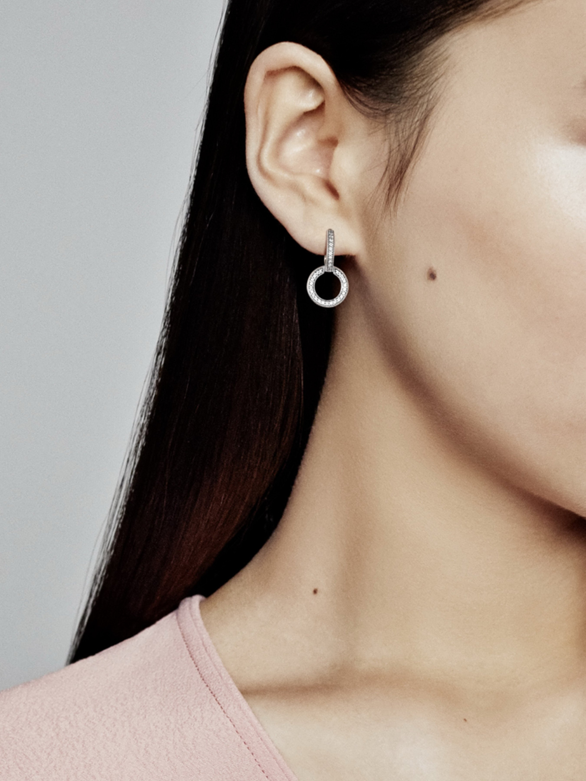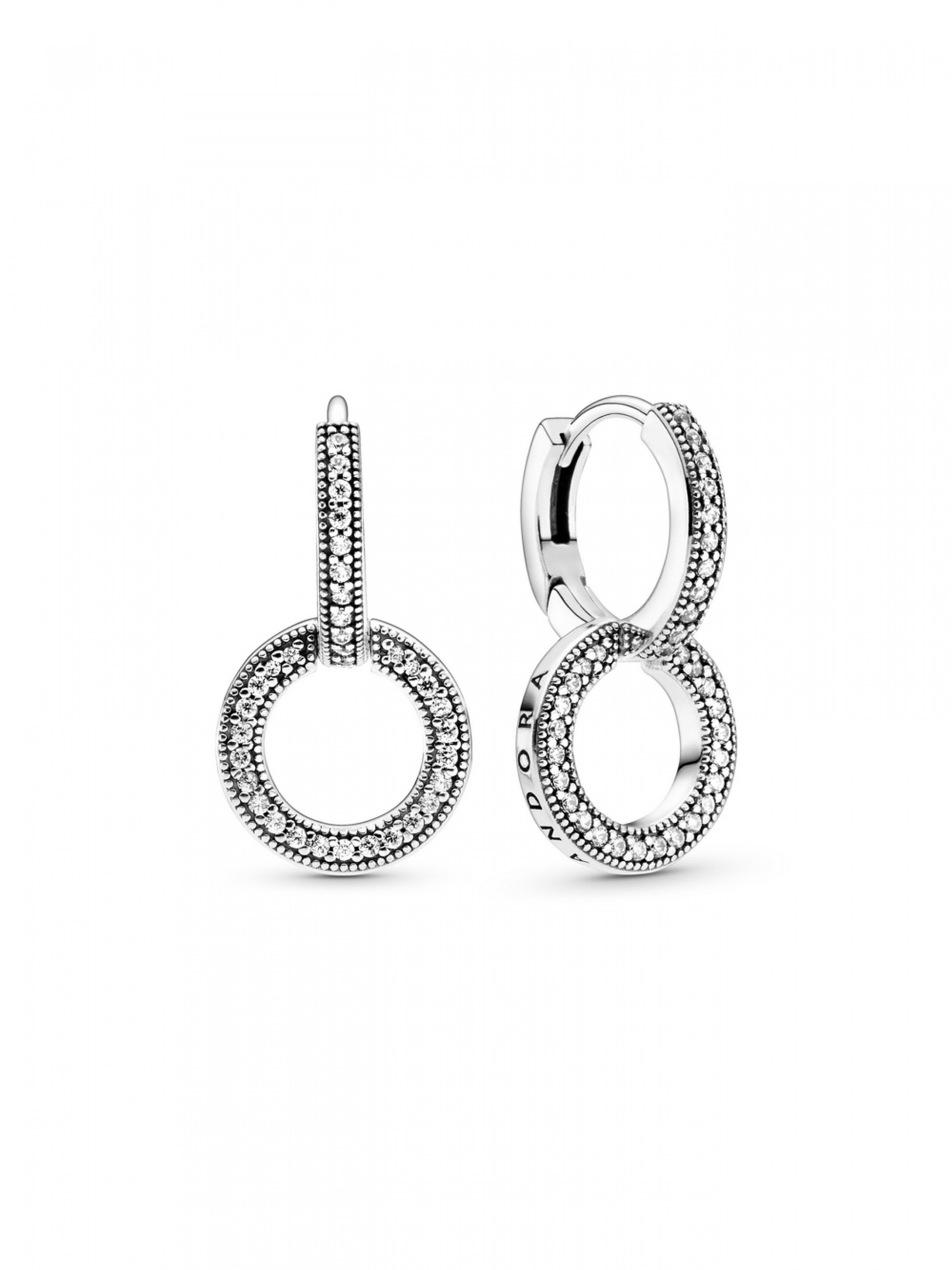 Ці сережки з яскравими подвійними кільцями — ще один доказ того, що два — краще, ніж один. Сережки, що виготовлені та довершені вручну зі срібла 925-ї проби, виконані у формі 2 з'єднаних між собою кілець, які інкрустовано паве з прозорих кубічних оксидів цирконію у корнерових закріпках. Особливої філігранності цим сережкам із рухливою підвіскою додає оздоблення металевими кульками, різьбленими сердечками та логотипом Pandora. Сережки ідеально пасуватимуть як до вечірнього вбрання, так і до вишуканого повсякденного образу.