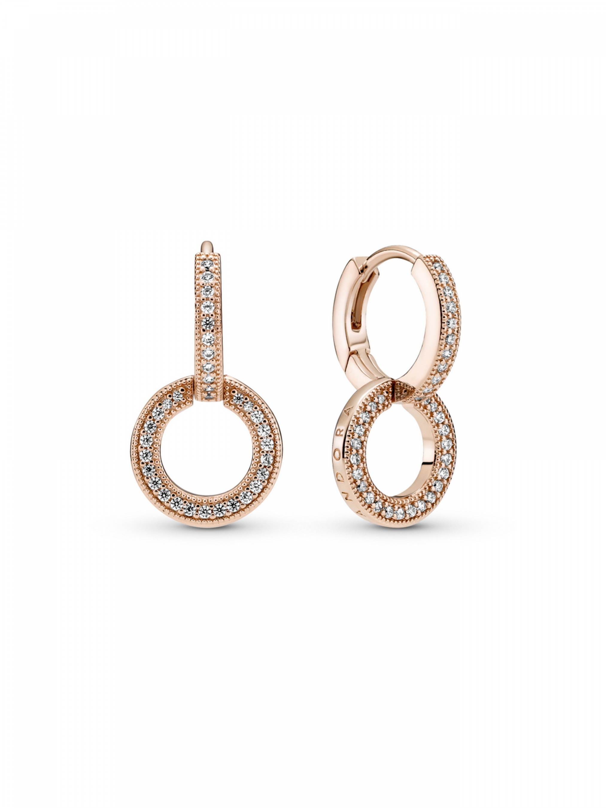 Блискучі сережки з подвійними кільцями — чудовий вибір для створення ефектного образу. Ця довершена вручну прикраса, що виготовлена зі сплаву з покриттям рожевим золотом 14k, складається з двох кілець, інкрустованих pavé з прозорих кубічних оксидів цирконію, оточених металевими мікрокульками. Нижнє кільце оздоблене вирізьбленими сердечками на зворотному боці та логотипом Pandora на бокових гранях. Воно закріплене перпендикулярно верхньому кільцю та вільно рухається вперед і назад, привертаючи увагу до вушок.