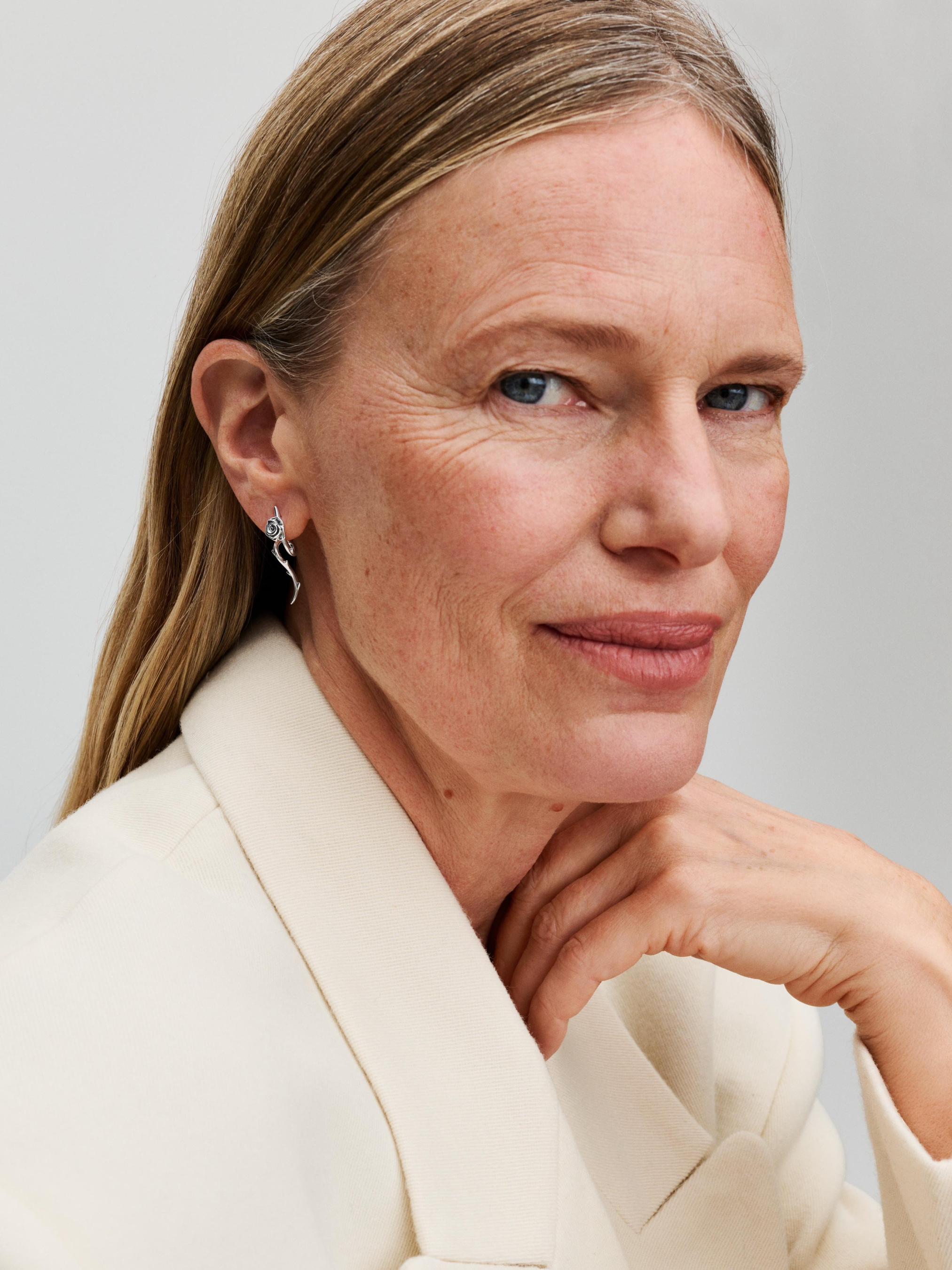 Вигнуті сережки "Квітуча троянда" витончено повторюють елегантність природи та виготовлені срібла 925-ї проби. Звивисте стебло, прикрашене поодинокими шипами, підіймається до квітучої троянди з багатошаровими пелюстками. Форма сережок віддзеркалюється, а застібками є метелики у формі серця. Ці сережки втілюють гостру та неповторну красу шипів троянди, символізуючи вічну силу кохання. Делікатні, але сміливі сережки втілюють сенс дарування квітучих троянд.
