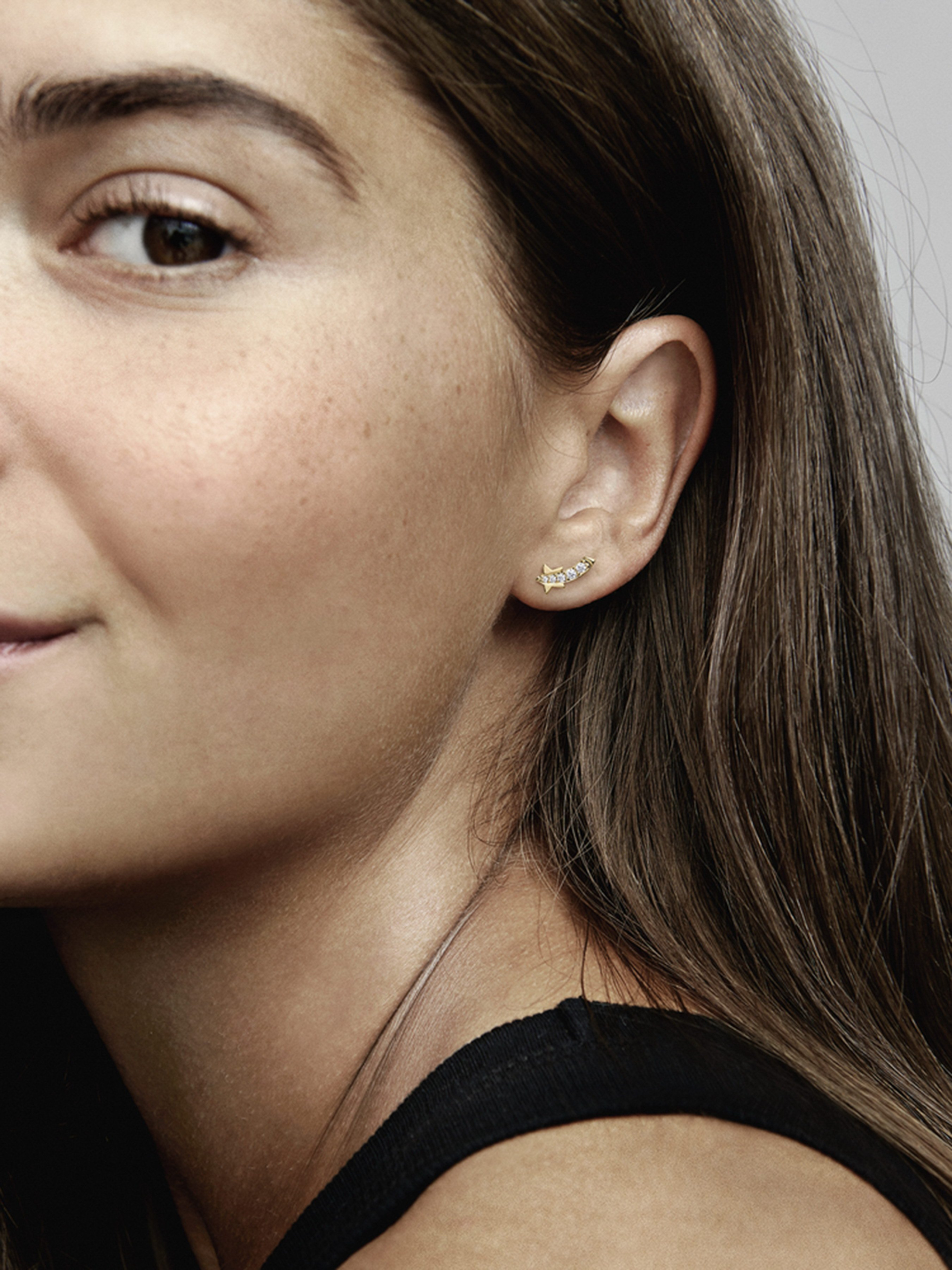 Наші сережки-пусети "Метеор із pavé" з покриттям золотом 14k додадуть вашому образові теплого сяйва. Прикраса вирізняється сучасним графічним дизайном і вишуканою простотою форм. Хвіст метеора інкрустовано рядочком pavé. Одягніть прикрасу, щоб створити образ, сповнений святкової магії, або подаруйте її коханій людині, щоб показати наскільки вона особлива.