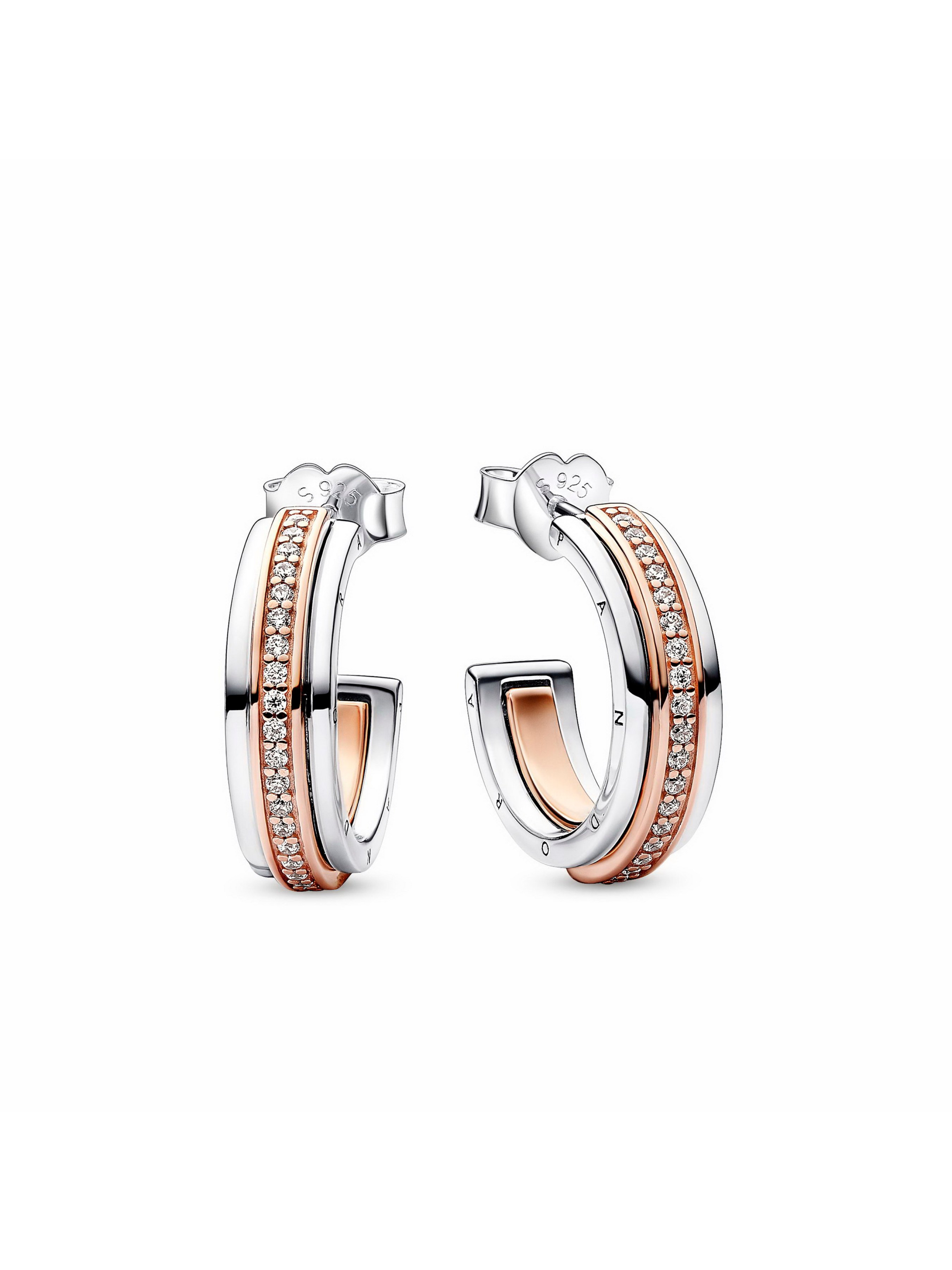 Створіть власний стиль із двоколірними сережками з паве. Рельєфний малюнок із покриттям рожевим золотом 14k проходить по центральній частині сережок та прикрашений рядом блискучих камінців кубічного цирконію. З обох боків сережок вигравіювано логотип Pandora. Ці сережки будуть чудовим доповненням до будь-якої ювелірної колекції, ця пара виділяється як окремо, так і в ідеально підібраній комбінації.