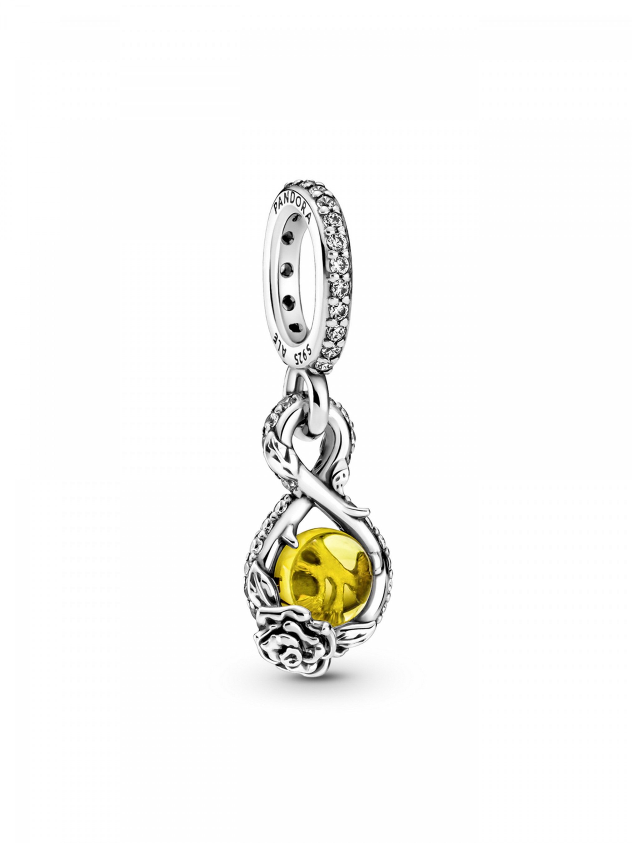 Створіть образ, гідний принцеси, разом із підвіскою "Знак нескінченності та троянда" з лінійки прикрас "Белль" Disney. Центральний елемент цієї срібної підвіски — великий жовтий кристал огранювання "кабошон", оточений знаком нескінченності. Асиметричний знак нескінченності вирізняється філігранним оздобленням невеликими металевими кульками та шипами й доповнений рельєфною трояндою (вона також присутня і на зворотному боці центрального каменя). На створення цієї прикраси нас надихнув легендарний стиль та історія героїні Disney, Белль. Прикраса неодмінно додасть королівської вишуканості вашому образові.