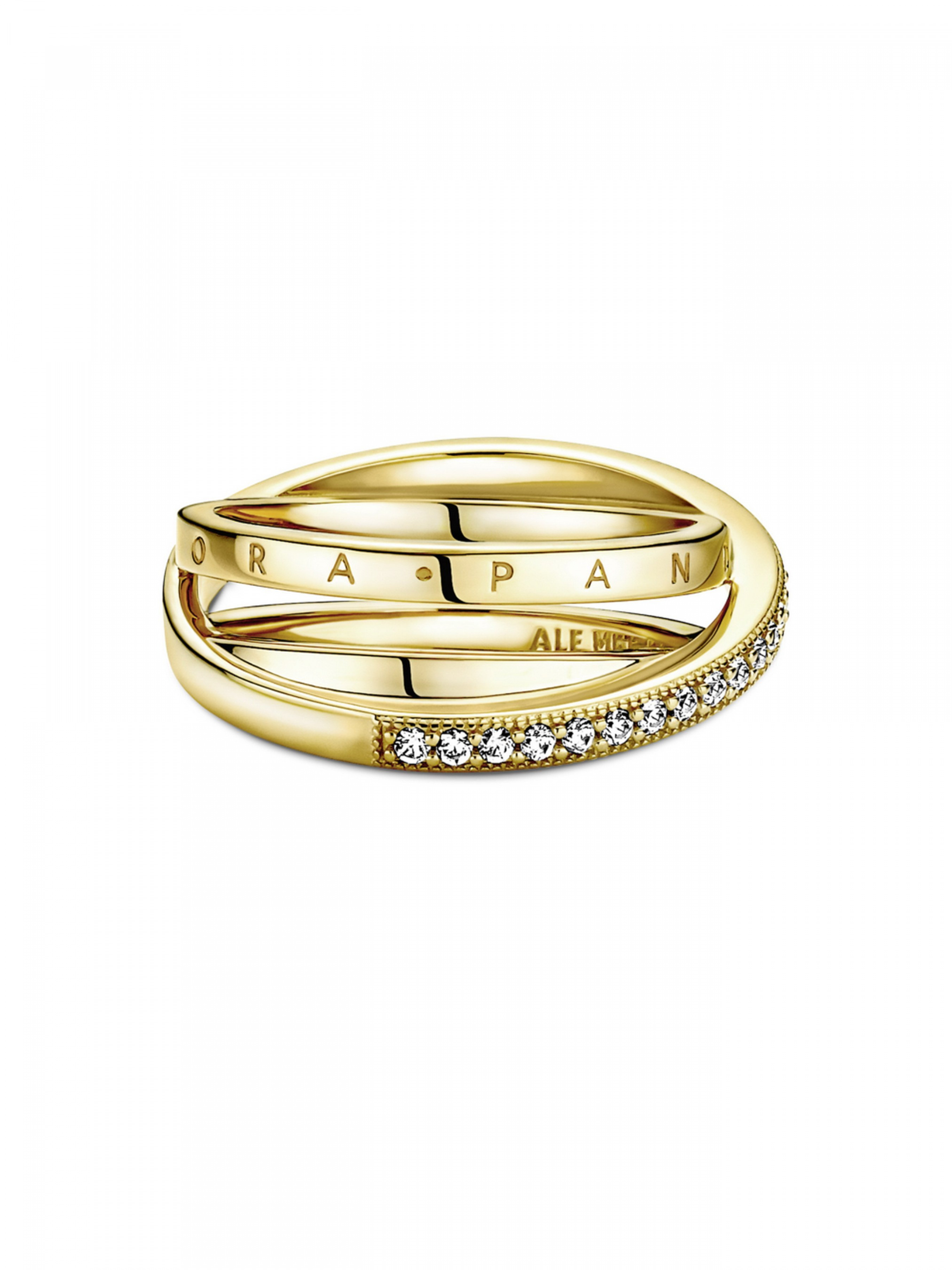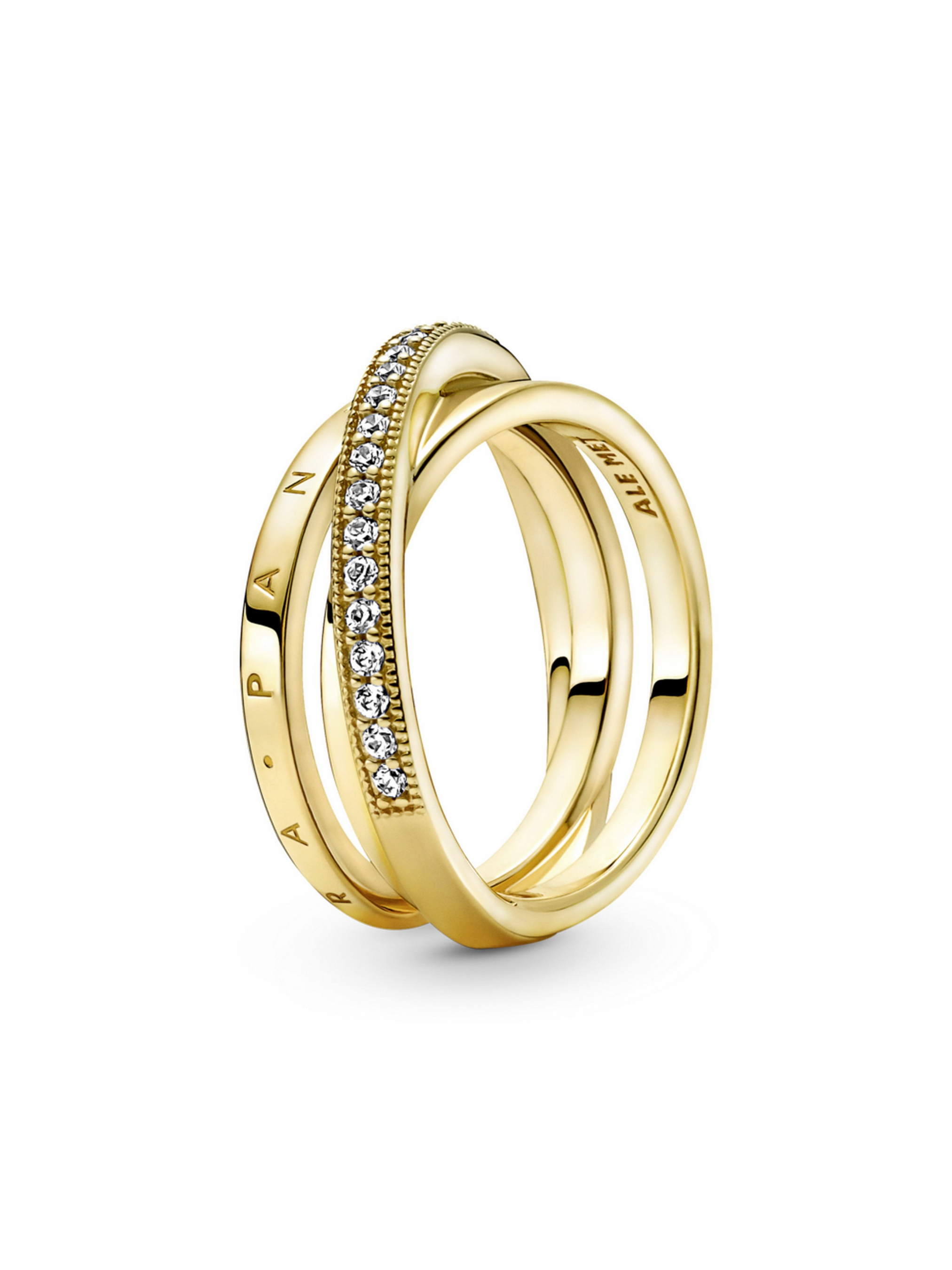Доповніть свій образ об'ємними лініями за допомогою потрійної стрічкової каблучки з pavé. Прикрасу довершено вручну зі сплаву з покриттям золотом 14k. Прикраса складається з 3 стрічкових каблучок, що з'єднані між собою. Верхню каблучку інкрустовано паве з прозорих кубічних оксидів цирконію. Вона розміщена поверх 2 інших каблучок, одна з яких оздоблена тисненим логотипом Pandora , а інша — відполірована до блиску. Одягніть цю вишукану каблучку і ви не захочете розлучатися з нею ні на мить.