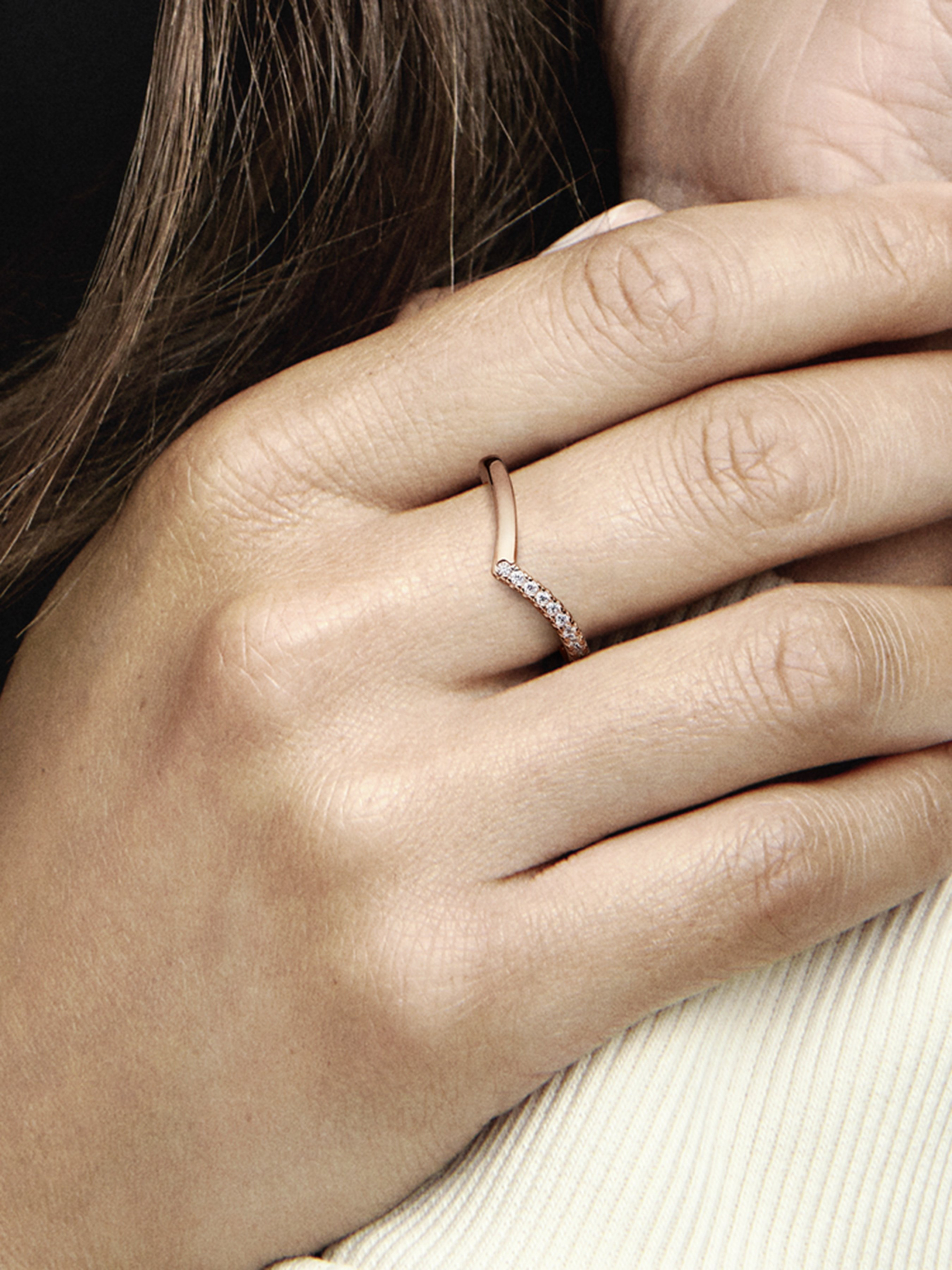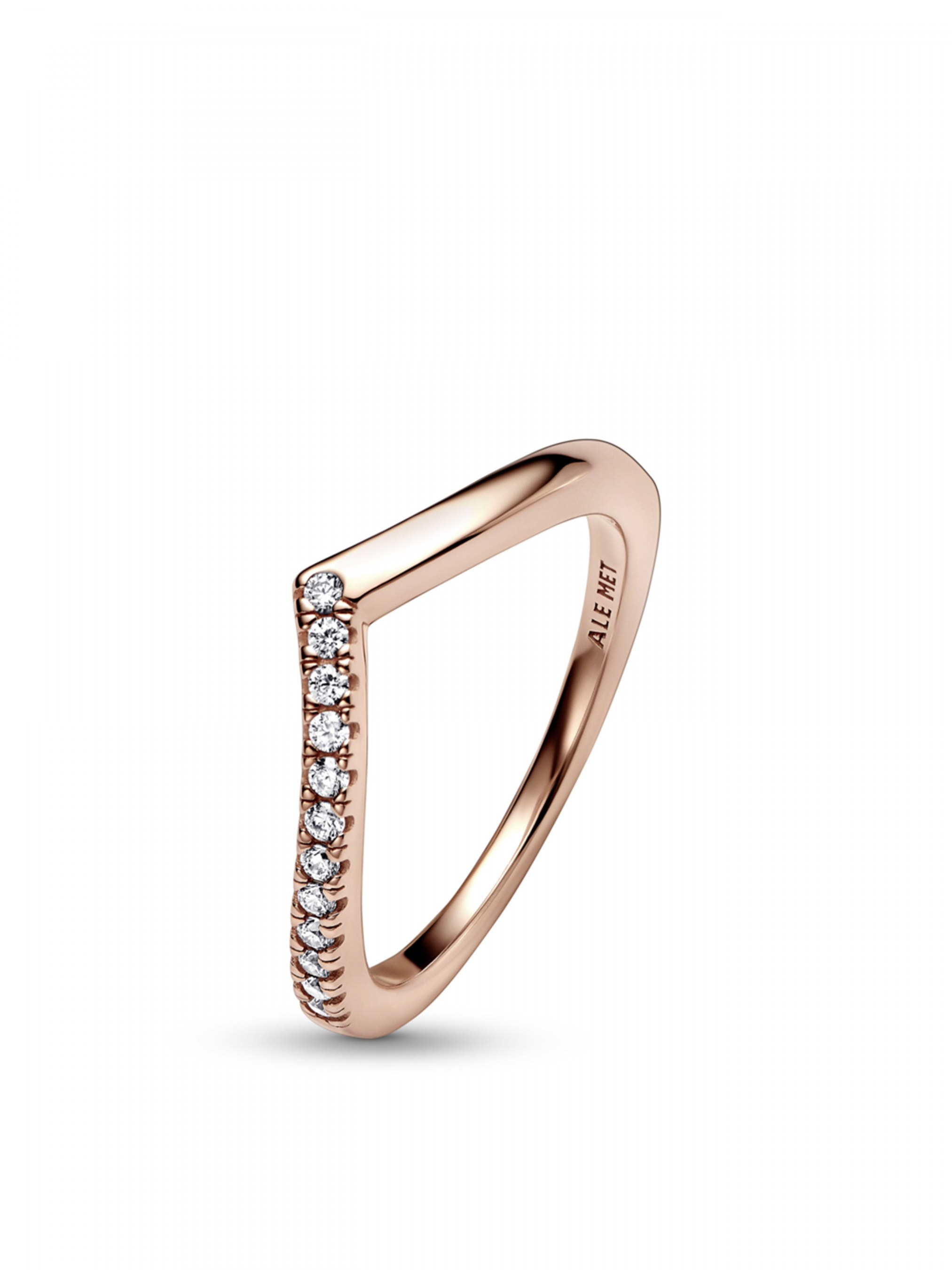Здійснюйте найзаповітніші мрії з цією елегантною каблучкою-вилочкою з покриттям рожевим золотом 14k, половина шинки якої інкрустована 12 камінцями кубічного оксиду цирконію круглого діамантового огранювання у крапанових закріпках. Цю елегантну каблучку у формі кісточки-вилочки можна носити як самостійну прикрасу, щоб додати мерехтливого блиску вашому образу, так і в комбінації з іншими каблучками Pandora, щоб створити унікальний образ.
