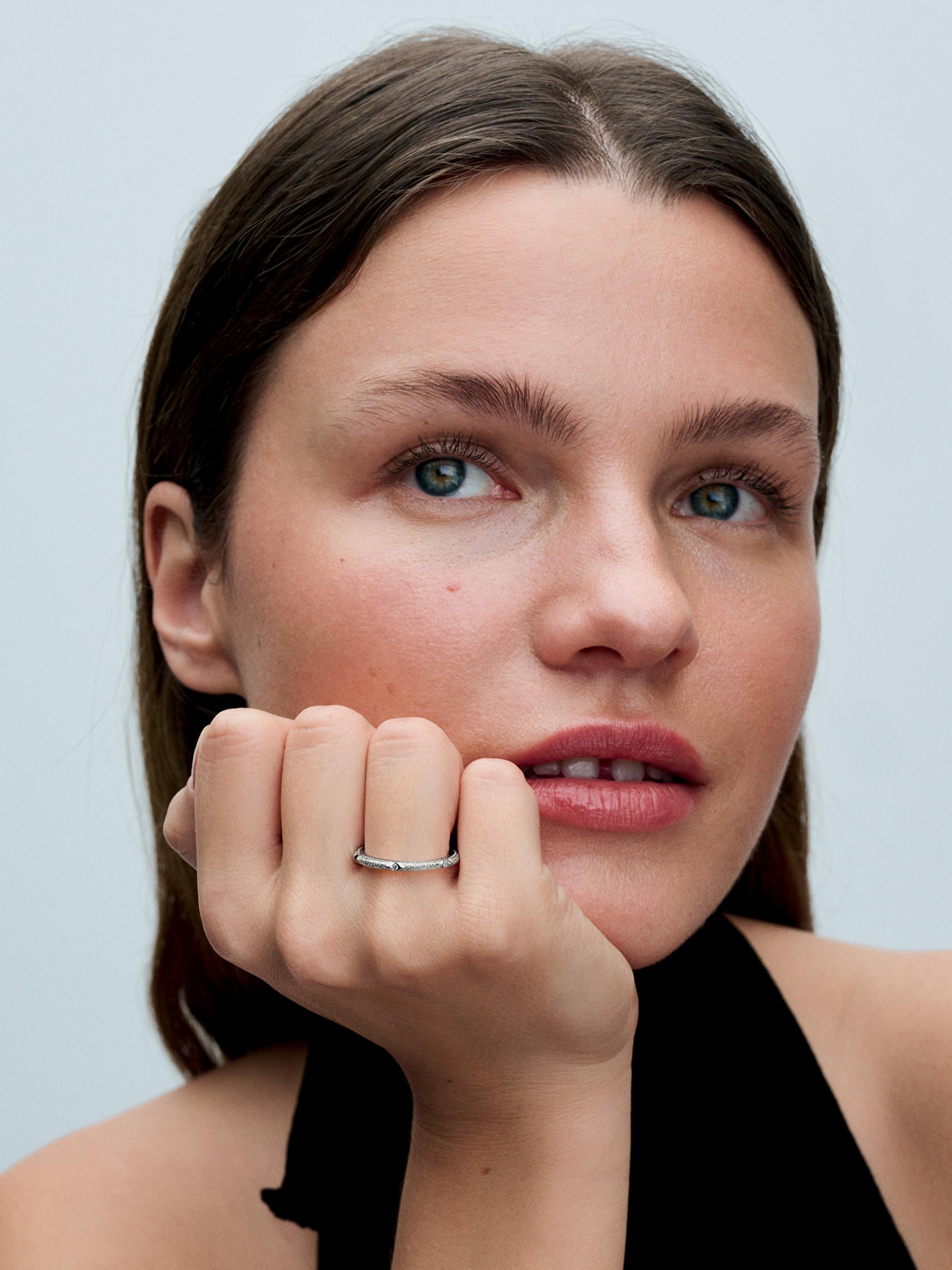 У текстурованій каблучці з камінцями Pandora ME все криється в деталях. Каблучка зі срібла 925-ї проби інкрустована шістьома камінцями кубічного оксиду цирконію, що яскраво виблискують в крихітних заглибинах. Решта каблучки оздоблена текстурованим візерунком. Натхненна зовнішнім виглядом літнього піску та блискучим океанським сонцем, ця делікатна та вкрай деталізована каблучка є ідеальним варіантом, щоб проявити власний стиль.