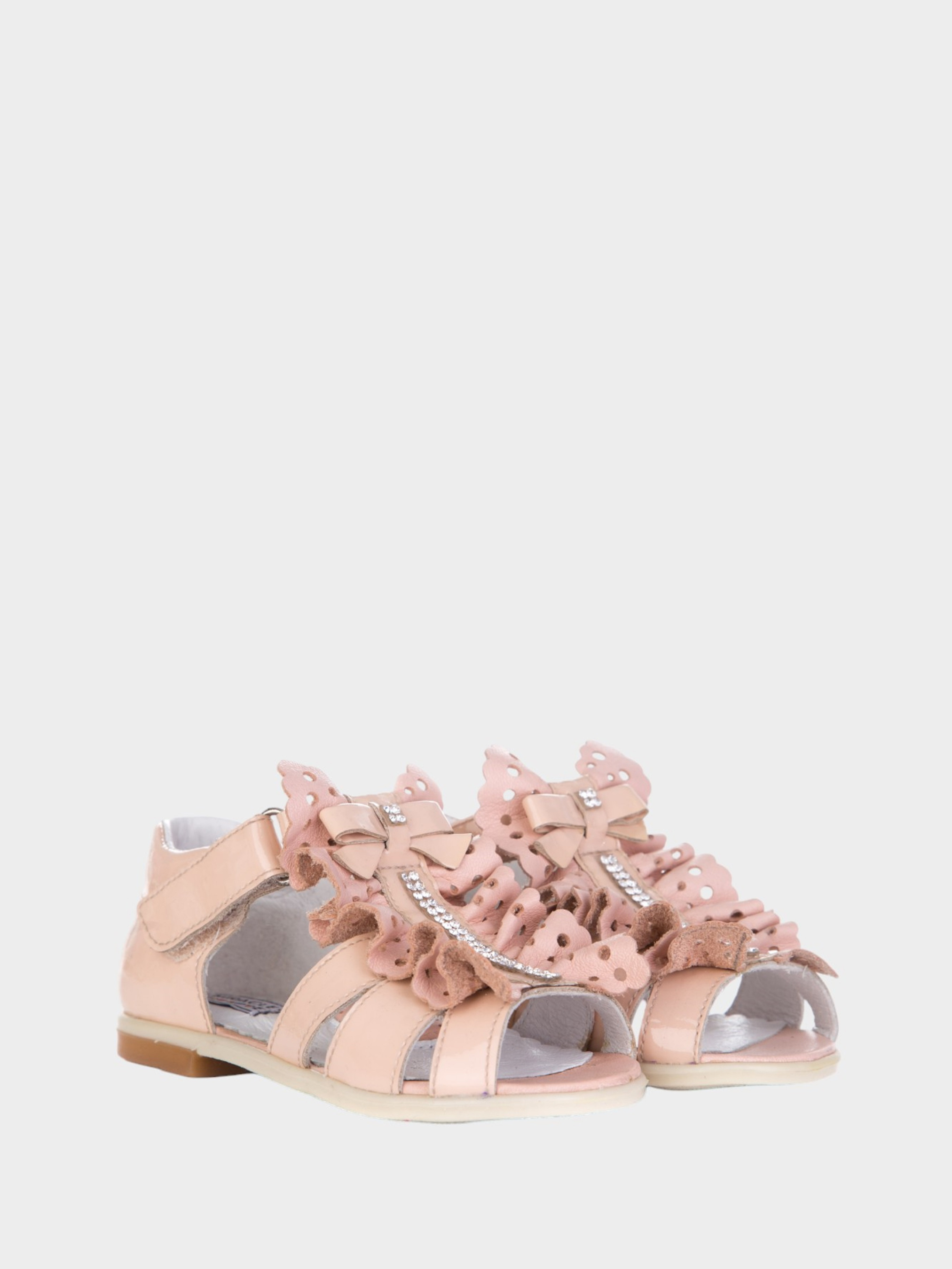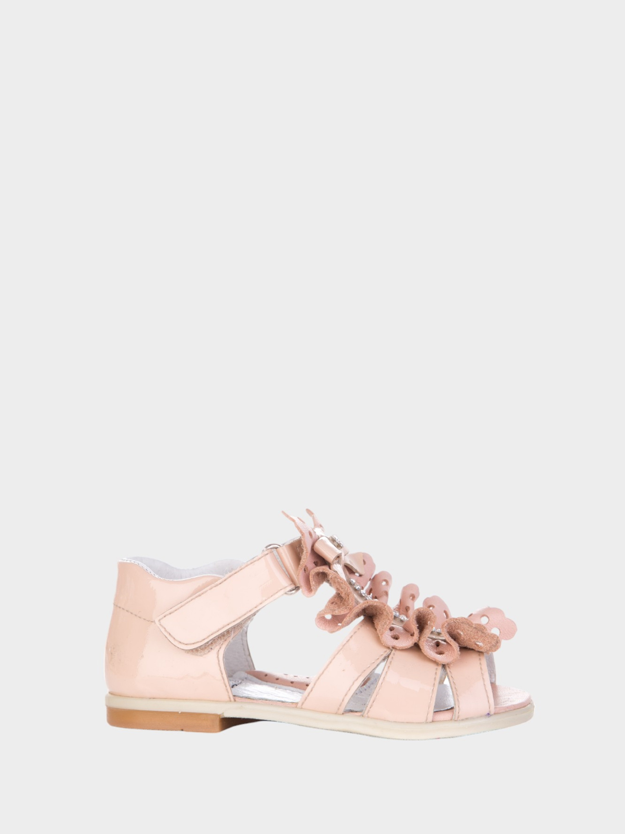 Босоніжки для дівчаток бежевого кольору. Зроблені з висококласної лакованої шкіри – зовні, та всередині оброблені спеціальною шкірою підкладки. Витончено декоровані м'якими рюшами з візерунковою перфорацією з тонкої шкіри у колір виробу та камінчиками «Сваровські». Вся декоративна обробка виконана зі шкіри. Завдяки зручній та анатомічно правильній фіксації на нозі за допомогою липучки підійдуть для дітей з ніжками різної повноти та підйому. Передня верхня частина виробу плавно огинає підйом дитини з обох боків, утримуючи ніжку від ковзання. Босоніжки витончено виглядають на ніжці та підійдуть для справжніх принцес, щодня оберігаючи і роблячи комфортними усі рухливі ігри малюків. М'яке, легке, з гнучкою підошвою, що дихає - таке взуття незамінне у весняно-літній період. Антибактеріальна ортопедична устілка і легка підошва з термоеластопласту, дозволить легко проходити весь день і не втомитися ніжкам.