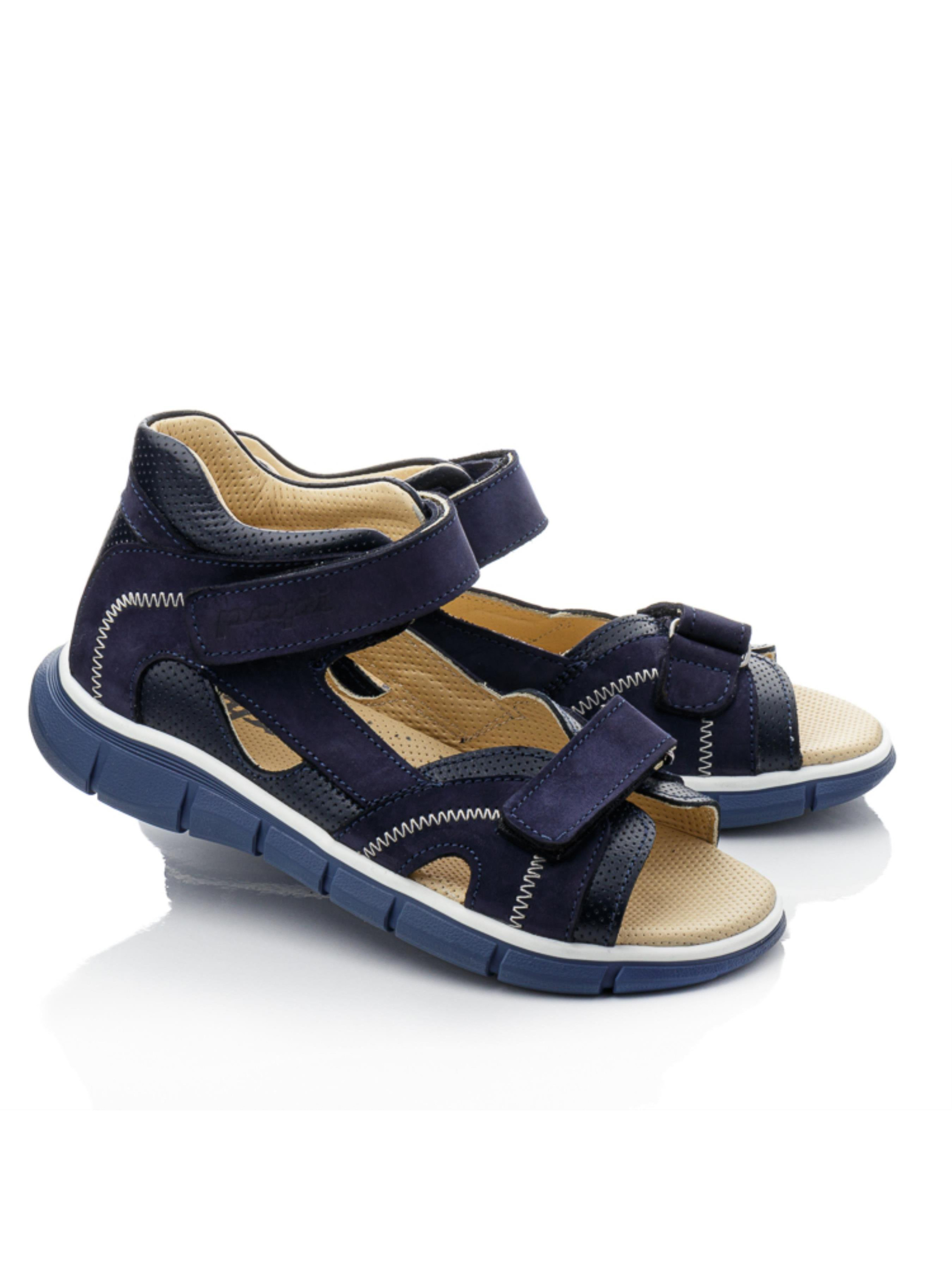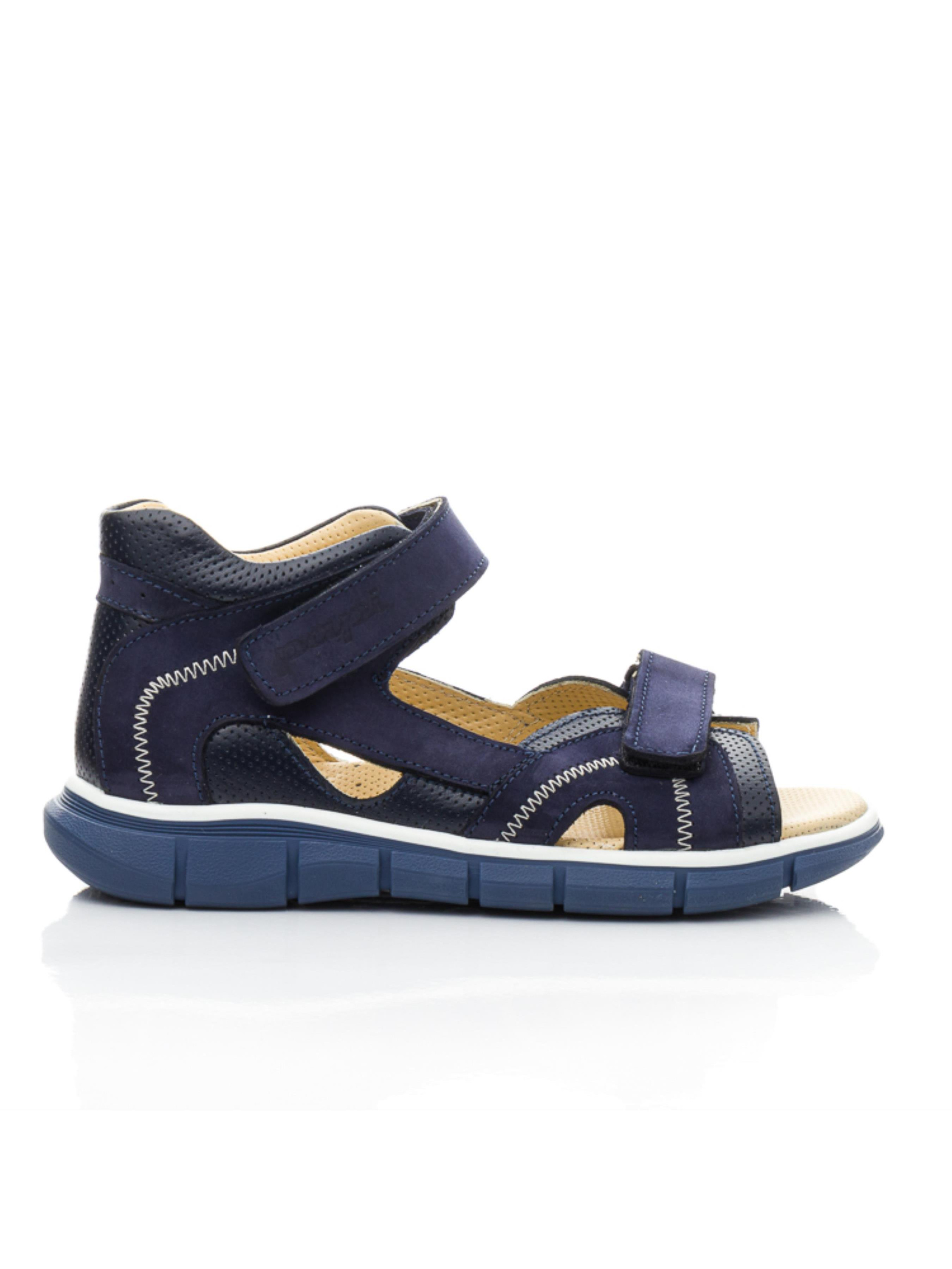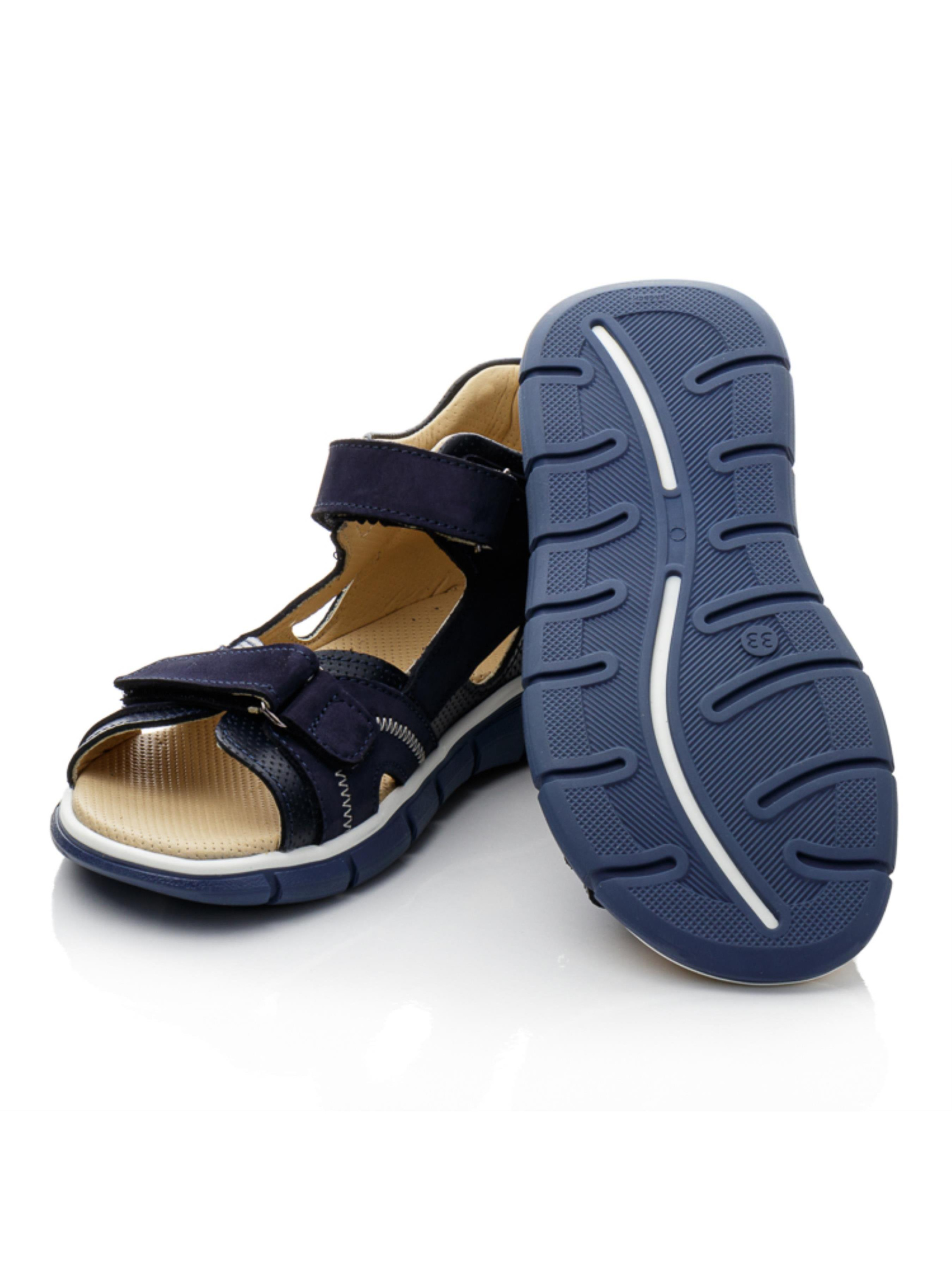 Сині сандалі з нубуку для хлопчика – комфорт і міцність для активного літа Ці сандалі стануть надійними супутниками у теплі дні. Верх із натурального нубуку робить їх м’якими та довговічними, а шкіряна підкладка забезпечує комфортну посадку без натирань. Дві липучки дозволяють швидко та легко зафіксувати взуття на ніжці. Синій колір із контрастним швом надає моделі стильного та універсального вигляду. Гнучка підошва амортизує кроки, зменшуючи навантаження на стопу. Ці сандалі ідеально підійдуть для прогулянок, активного відпочинку та повсякденного використання.